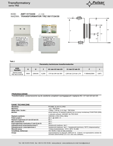 Transformatory seria TRZ KOD: AWT 5172430 v1.1/IX NAZWA: TRANSFORMATOR TRZ 50/17/24/30 Tab.1 Parametry techniczne transformatorów KOD NAZWA S U I U1 lub U2 lub U3 I1 lub I2 lub I3 F t AWT5172430 TRZ 50/17/24/30 50VA 230V/AC 0,25A 17V lub 24V lub 30V 2,9A lub 2,1A lub 1,7A T 500mA/250V 130oC PRZEZNACZENIE Transformatory przeznaczone są do zasilania urządzeń wymagających napięcia AC: U1 lub U2 lub U3. DANE TECHNICZNE Obudowa: Wymiary: Waga netto / brutto : Montaż: Napięcie zasilania: Pobór prądu I: Napięcie wyjściowe U1 lub U2 lub U3: Moc nominalna S: Prąd wyjściowy nominalny I1 lub I2 lub I3: Zabezpieczenie przeciwzwarciowe F: Zabezpieczenie przeciążeniowe t: Warunki pracy Certyfikaty, deklaracje: Uwagi: PC/ABS UL 94 V-0, IP43 rys1. TRZ 50VA 1,52kg / 1,60 kg [+/-0,1kg] TRZ 50VA wkręt walcowy x4 (płaskie podłoże) lub na szynę montażową TH35/TS35 (DIN) z użyciem uchwytu AWO467 dla TRZ 50VA 230V/AC (-15%÷10%), 50Hz tab.1. @~230V / I1 tab.1. tab.1. tab.1. bezpiecznik topikowy tab.1. bezpiecznik topikowy tab.1. / bezpiecznik termiczny 130°C (niepowracalny) II klasa środowiskowa, -10°C÷ 40°C, Ta 40B CE, RoHS, 2 lata od daty produkcji wyprowadzenia na złączach AWG 24-12 2,5mm², na wyposażeniu zestaw do montażu (blachowkręt 2,9 x 9,5- 4szt oraz zaślepki). Tel. +48-14-610-19-40, fax: +48-14- 610-19-50, www.pulsar.pl , www.zasilacze.pl e-mail: [email protected] Transformatory seria TRZ Wymiary transformatorów serii: TRZ 50VA rys.1 Tel. +48-14-610-19-40, fax: +48-14- 610-19-50, www.pulsar.pl , www.zasilacze.pl e-mail: [email protected]