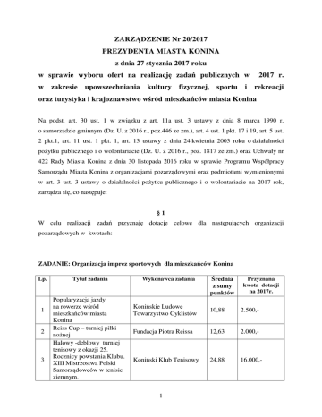 ZARZĄDZENIE Nr 20/2017 PREZYDENTA MIASTA KONINA z dnia 27 stycznia 2017 roku w sprawie wyboru ofert na realizację zadań publicznych w 2017 r. w zakresie upowszechniania kultury fizycznej, sportu i rekreacji oraz turystyka i krajoznawstwo wśród mieszkańców miasta Konina Na podst. art. 30 ust. 1 w związku z art. 11a ust. 3 ustawy z dnia 8 marca 1990 r. o samorządzie gminnym (Dz. U. z 2016 r., poz.446 ze zm.), art. 4 ust. 1 pkt. 17 i 19, art. 5 ust. 2 pkt.1, art. 11 ust. 1 pkt. 1, art. 13 ustawy z dnia 24 kwietnia 2003 roku o działalności pożytku publicznego i o wolontariacie (Dz. U. z 2016 r., poz. 1817 ze zm.) oraz Uchwały nr 422 Rady Miasta Konina z dnia 30 listopada 2016 roku w sprawie Programu Współpracy Samorządu Miasta Konina z organizacjami pozarządowymi oraz podmiotami wymienionymi w art. 3 ust. 3 ustawy o działalności pożytku publicznego i o wolontariacie na 2017 rok, zarządza się, co następuje: §1 W celu realizacji zadań przyznaję dotacje celowe dla następujących organizacji pozarządowych w kwotach: ZADANIE: Organizacja imprez sportowych dla mieszkańców Konina Lp. 1 2 3 Tytuł zadania Popularyzacja jazdy na rowerze wśród mieszkańców miasta Konina Reiss Cup – turniej piłki nożnej Halowy -deblowy turniej tenisowy z okazji 25. Rocznicy powstania Klubu. XIII Mistrzostwa Polski Samorządowców w tenisie ziemnym. Wykonawca zadania Średnia z sumy punktów Przyznana kwota dotacji na 2017r. Konińskie Ludowe Towarzystwo Cyklistów 10,88 2.500,- Fundacja Piotra Reissa 12,63 2.000,- Koniński Klub Tenisowy 24,88 16.000,- 1 Konińskie Towarzystwo Krzewienia Kultury Fizycznej 24,88 8.500,- 5 Organizacja imprez i stałych rozgrywek w piłce siatkowej II Bieg Legionisty – dorzeczem Warty. UKS „Strzelec” 17,5 3.000,- 6 Bieg Tropem Wilczym UKS „Strzelec” 18,63 2.000,- XV Puchar Polski w Brazylijskim Jiu-Jitsu XXIII Zimowe Regaty Barbórkowe Zawody, turnieje i akademie karate Organizacja imprez sportowych dla mieszkańców Konina. Mroźna odlotowa rekreacja sportowa Organizacja XXVI Biegu o Lampkę Górniczą Międzyszkolny maraton Sportowy „Szkoła bez przemocy i uzależnień” Organizacja VII Pikniku z okazji „Dnia Flagi” oraz uroczystości wręczenia nagród zwycięzcom II Piknik Sportowy z okazji Dnia Dziecka i zakończenia roku szkolnego Organizacja imprez żeglarskich dla mieszkańców Konina Organizacja imprez sportowych dla mieszkańców Konina Klub Sportowy Copacabana Konin Klub Żeglarski przy KWB ,,Konin” Regionalny Klub Karate KYOKUSHIN Konin 19 10.500,- 24,88 10.000,- 22,25 7.000,- Koniński Klub K-1 18,5 7.000,- 15 1.500,- 15,38 16.000,- 13,25 3.000,- 18 4.000,- Towarzystwo Przyjaciół Dzieci Oddział Powiatowy w Koninie 12,38 1.500,- Koniński Okręgowy Związek Żeglarski 20,88 15.000,- Konińskie Stowarzyszenie Rolkarskie „SkateKon” 18,75 7.500,- LOK Koniński Klub Kajakowy i Sportów Wodnych 18,25 3.000,- Towarzystwo Krzewienia Kultury Fizycznej „Korty” 25 15.000,- 4 7 8 9 10 11 12 13 14 15 16 17 18 19 Kajakarstwo i sporty wodne Organizacja imprez sportowo – rekreacyjnych i cyklicznych turniejów w tenisie dla mieszkańców miasta Konina Stowarzyszenie „Morsy” Konin Klub Biegacza ,,Aktywni Konin” Stowarzyszenie Aktywności Lokalnej „Młodzi Aktywni” Klub Biegacza ,,Aktywni Konin” Razem 135.000,- 2 ZADANIE: Organizacja imprez sportowo-rekreacyjnych dla osób z niepełnosprawnościami dla mieszkańców Konina Lp. Tytuł zadania Wykonawca zadania 1 Piknik Rodzinny „Bądź Aktywny” 2 Organizacja imprez sportowo-rekreacyjnych dla osób z niepełnosprawnościami Fundacja na Rzecz Rozwoju Dzieci i Młodzieży OTWARCIE Oddział Regionalny Olimpiady Specjalne Polska Wielkopolskie Konin 3 WIŚNIK CUP – III edycja Fundacja im. Doktora Piotra Janaszka ,,Podaj Dalej” Średnia Przyznana z sumy kwota dotacji punktów na 2017r. 21,75 3.000,- 22 10.000,- 17,13 7.000,- RAZEM 20.000,- ZADANIE: Organizacja imprez turystycznych dla mieszkańców Konina Lp. Tytuł zadania Wykonawca zadania 1 Wodna Przygoda na Szlaku Wielkiej Pętli Wielkopolski Organizacja imprez turystycznych dla mieszkańców Konina Lokalna Organizacja Turystyczna „Marina” Polskie Towarzystwo Turystyczno – Krajoznawcze O/Konin Organizacja imprez turystycznych dla mieszkańców Konina Stowarzyszenie Aktywności Lokalnej „Młodzi Aktywni” 2 3 Średnia z sumy punktów 24,86 Przyznana kwota dotacji na 2017r. 10.300,- 24,86 30.000,- 20,14 9.700,- „Rowerem szlakami Wielkopolski” RAZEM 50.000,- ZADANIE: Udzielanie informacji turystycznej o mieście i promocja turystyczna Konina Lp. Tytuł zadanie Wykonawca zadania 1 Lokalna Organizacja Turystyczna „MARINA” Udzielanie informacji turystycznej o mieście Koninie Średnia z sumy punktów 23,86 RAZEM 3 Przyznana kwota dotacji na 2017r. 42.000,- 42.000,- §2 Zlecenie realizacji zadań nastąpi na podstawie umowy. §3 Wykonanie zarządzenia powierza się Kierownikowi Wydziału Kultury, Sportu i Turystyki Urzędu Miejskiego w Koninie. §4 Zarządzenie wchodzi w życie z dniem podjęcia. Prezydent Miasta Konina Józef Nowicki 4