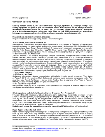 Informacja prasowa Poznań, 03.03.2014 Cały dzień Dzień dla Kobiet! Kobiecy koncert znanej z „The Voice of Poland” Agi Czyż, spotkanie z „Żelazną Kobietą”, joga i oferty wyłącznie dla pań! W tym roku w Dzień Kobiet warto wybrać się do Starego Browaru w większym damskim gronie, bo na hasło „Ty i przyjaciółki” czeka wiele rabatów, rosnących wraz z liczbą korzystających z nich pań. Hotel Blow Up Hall 5050 natomiast kusi specjalnym kobiecym menu przez cały weekend i kameralną wyprzedażą marek luksusowych. Program Dnia dla Kobiet w Starym Browarze: miejsce: Słodownia + 2, wstęp wolny, napoje i poczęstunek gratis 10:00 Kobiece spotkanie w Słodowni +2 Specjalnie na Dzień Kobiet wybrane sklepy i restauracje przygotowały w Słodowni +2 poczęstunek i specjalne stoiska. Na panie czekać będzie m.in. pyszna kawa i słodkości od SO! Coffee i Petit Paris oraz degustacje Salad Story i Zielonej Spiżarni. O najnowszych kolekcjach opowiedzą m.in. doradcy z Calvin Klein Jeans, Lee Wrangler, KappAhl, Nike i Ania Kruk. Natasha Pavluchenko oprócz autorskich kreacji zaprezentuje także własne obrazy, a Bookarest przygotuje specjalny wybór książek. 11:00 Spotkanie z Elą Krzyżaniak „Żelazna Kobieta” – tak pisały o niej gazety. Zdobyła Mont Blanc, przepłynęła wpław Wartę 500 km i Wisłę 1000 km, pobiła rekord Guinnessa (zrobiła 8 tys. „brzuszków” w 1 h), ukończyła najcięższe w Polsce zawody survivalowe „Selekcja” edycję letnią i zimową. Skoki spadochronowe, nurkowanie, wspinaczka były dla niej codziennością. Jedno traumatyczne zdarzenie zmieniło jej losy. W rezultacie w 2002 r. założyła „Centrum Szczęśliwego Człowieka Energia”, gdzie z powodzeniem wraz z kilkoma nauczycielami prowadzą wspólnie jogę dla każdego. Sama o swojej historii mówi: „Od szkoły przetrwania do jogowania” – taki opis czytamy na okładce świeżo wydanej książki pt. „W cudzych butach” Eli Krzyżaniak. Od lat zaraża ona pozytywną energią, tym razem opowie o swojej książce, a tym samym o pokonywaniu największych przeciwności, jakie przynosi los. 12:30 Przerwa kawowa 13:00 Koncert Agi Czyż Obdarzona niezwykłym głosem poznanianka, półfinalistka trzeciej edycji programu "The Voice of Poland” (2013 rok - drużyna Marii Sadowskiej) zaśpiewa swoje autorskie kompozycje (m.in. Plan Awaryjny, You Forgot To Dance) i covery (m.in. Another Day z programu „The Voice of Poland”, Rihanny i Arethy Franklin). Będzie zdecydowanie kobieco! 14:00 Joga z Elą Krzyżaniak Dwugodzinna sesja jogi z Elą Krzyżaniak, która prowadziła już oblegane w wakacje zajęcia w parku Starego Browaru i jesienne „Jogobranie”. Oferty specjalne na Dzień dla Kobiet w Starym Browarze. Ty + Przyjaciółki 8 marca w blisko 50 miejscach w Starym Browarze panie będą mogły skorzystać z promocji – w wielu z nich ze specjalnej oferty „Ty i przyjaciółki”: Ty + 1 przyjaciółka – 5% rabatu, Ty + 2 – 10%, Ty + 3 – 15%, Ty + 4 - 20 % rabatu, Ty + 5 przyjaciółek aż 25 % rabatu. Rabaty dotyczą bardzo szerokiego asortymentu – od oferty Pepe Jeans przez Betty Barclay po L’Occitane i restauracje, m.in. Piccolino, China Town i Marynarka. Pełna lista miejsc, które przygotowały oferty na Dzień Kobiet dostępna jest na Facebooku, w newsletterze i w Starym Browarze. Dodatkowo 8 marca dla wszystkich pań zniżka na parking 50% (do odbioru w Punktach Info). Dzień Kobiet w Blow Up Hall 5050 Dzień Kobiet świętuje także mieszczący się w kompleksie Starego Browaru pięciogwiazdkowy hotel Blow Up Hall 5050. Przez cały weekend obowiązywać tu będzie specjalne kobiece menu z lampką wina w cenie 80 zł za osobę, a w dawnych wnętrzach salonu Maestro (wejście od ul. T. Kościuszki) przez cały dzień 6 i 7 marca oraz w Dniu Kobiet od godz. 10:00 do 15:00 odbędzie się kameralna wyprzedaż przygotowana przez butiki Patrizia Pepe i Ballin, które zapowiadają rabaty aż do 90%. Dodatkowych informacji udziela: Barbara Banat, Koordynator PR, [email protected], tel. 501 102 722 www.starybrowar5050.com, www.facebook.com/starybrowar5050 Informacja prasowa Dodatkowych informacji udziela: Barbara Banat, Koordynator PR, [email protected], tel. 501 102 722 www.starybrowar5050.com, www.facebook.com/starybrowar5050 Poznań, 03.03.2014