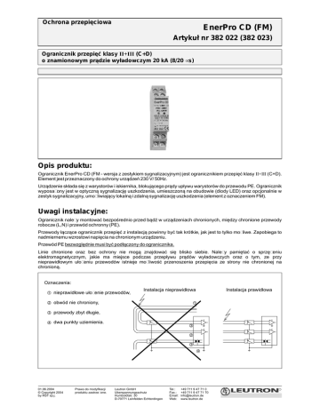 Ochrona przepięciowa EnerPro CD (FM) Artykuł nr 382 022 (382 023) Ogranicznik przepięć klasy II+III (C+D) o znamionowym prądzie wyładowczym 20 kA (8/20 µ s) Opis produktu: Ogranicznik EnerPro CD (FM - wersja z zestykiem sygnalizacyjnym) jest ogranicznikiem przepięć klasy II+III (C+D). Element jest przeznaczony do ochrony urządzeń 230 V/ 50Hz. Urządzenie składa się z warystorów i iskiernika, blokującego prądy upływu warystorów do przewodu PE. Ogranicznik wyposażony jest w optyczną sygnalizację uszkodzenia, umieszczoną na obudowie (diody LED) oraz opcjonalnie w zestyk sygnalizacyjny, umożliwiający lokalną i zdalną sygnalizację uszkodzenia (element z oznaczeniem FM). Uwagi instalacyjne: Ogranicznik należy montować bezpośrednio przed bądź w urządzeniach chronionych, między chronione przewody robocze (L,N) i przewód ochronny (PE). Przewody łączące ogranicznik przepięć z instalacją powinny być tak krótkie, jak jest to tylko możliwe. Zapobiega to nadmiernemu wzrostowi napięcia na chronionym urządzeniu. Przewód PE bezwzględnie musi być podłączony do ogranicznika. Linie chronione oraz bez ochrony nie mogą znajdować się blisko siebie. Należy pamiętać o sprzężeniu elektromagnetycznym, jakie ma miejsce podczas przepływu prądów wyładowczych oraz o tym, ze przy nieprawidłowym ułożeniu przewodów istnieje możliwość przenoszenia przepięcia ze strony nie chronionej na chronioną. Oznaczenia: 1 nieprawidłowe ułożenie przewodów, 2 obwód nie chroniony, 3 przewody zbyt długie, 4 dwa punkty uziemienia. Instalacja nieprawidłowa Instalacja prawidłowa 1 3 2 3 4 01.06.2004 © Copyright 2004 by RST sp.j. Prawo do modyfikacji produktu zastrzeżone. Leutron GmbH Uberspannungsschutz Humboldtstr. 30 D-70771 Leinfelden Echterdingen Tel.: Fax.: Email: Web: +49 711 9 47 71 0 +49 711 9 47 71 70 [email protected] www.leutron.de Dane techniczne: Typ: EnerPro CD / Opis: ogranicznik przepięć klasy II+III (C+D) EnerPro CD FM Oznaczenie EnerPro CD Kategoria ochrony zgodnie z E DIN VDE 0675-6 11/98-A1 oraz IEC 61643-11 / EnerPro CD FM II+III / T2+T3 (C+D) Napięcie znamionowe obwodu chronionego (50/60 Hz) UN [V~] UC [V~] Największe napięcie trwałej pracy (50/60 Hz) [A] Maksymalny prąd obciążenia Uz dyn [kV] Impulsowe napięcie zapłonu iskiernika przy 1 kV/µ s Napięciowy poziom ochrony przy iSN [kV] Up [kA] iSN Znamionowy prąd wyładowczy (8/20 µ s) Maksymalny przekrój przewodów przyłączeniowych [mm2] Temperatura pracy [oC] T Sposób montażu 230 275 16 A Λ 1,4 Λ 1,4 20 2,5 drut / 1,5 linka -25...+85 na szynie 35 mm wg EN 50 022 Konserwacja: Sprawność ogranicznika EnerPro CD (FM) należy sprawdzać po okresie burzowym. Poza tym element nie wymaga żadnych zabiegów konserwacyjnych. W przypadku uszkodzenia: EnerPro CD (FM) wyposażony jest w optyczną sygnalizację uszkodzenia (diody LED), umieszczoną na obudowie urządzenia. Świecenie zielonej diody oznacza poprawną pracę ogranicznika. Świecąca dioda czerwona świadczy o uszkodzeniu. W takim przypadku elementy należy wymienić. Opcjonalnie EnerPro CD może być wyposażony w bezpotencjałowy zestyk rozwierny (EnerPro CD FM), umożliwiający lokalną i zdalną sygnalizację uszkodzenia. UWAGA: Ogranicznik przepięć EnerPro CD (FM) może być instalowany i deinstalowany jedynie przez osoby posiadające odpowiednie uprawnienia oraz zgodnie z obowiązującymi normami i przepisami. Wymiary w [mm] 17,5 4 Schemat 58 Urządzenie chronione 28 L 21 N FM ϑ ϑ 65 90 87 87 EP CD FM ϑ L 01.06.2004 © Copyright 2004 by RST sp.j. Prawo do modyfikacji produktu zastrzeżone. Leutron GmbH Uberspannungsschutz Humboldtstr. 30 D-70771 Leinfelden Echterdingen Tel.: Fax.: Email: Web: PE +49 711 9 47 71 0 +49 711 9 47 71 70 [email protected] www.leutron.de PE N
