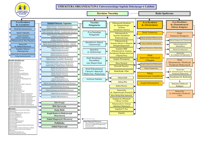 STRUKTURA ORGANIZACYJNA Uniwersyteckiego Szpitala Dziecięcego w Lublinie Rada Społeczna Dyrektor Naczelny Z-ca Dyrektora ds. Lecznictwa Dział Krwiolecznictwa Apteka Szpitalna Lekarz Kontroli Zakażeń Szpitalnych Pełnomocnik ds. Praw Pacjenta Stanowisko ds. Badań Klinicznych Inspektor Ochrony Radiologicznej Stanowisko ds. Kontroli Rozliczeń Usług Laboratoryjnych Poradnie Specjalistyczne: -Poradnia Alergologiczna -Poradnia Audiologiczna -Poradnia Chirurgiczna -Poradnia Diabetologiczna -Poradnia Endokrynologiczna -Poradnia Foniatryczna -Poradnia Gastroenterologiczna -Poradnia Genetyczna -Poradnia Ginekologiczna dla Dziewcząt -Poradnia Hematologiczno-Onkologiczna -Poradnia Kardiologiczna -Poradnia Otolaryngologiczna -Poradnia Logopedyczna i Surdologopedyczna -Poradnia Nefrologiczna -Poradnia Neurologiczna -Poradnia Ortopedyczna -Poradnia Patologii Noworodków i Niemowląt -Poradnia Psychologiczna -Poradnia Pulmonologiczna -Poradnia Rehabilitacyjna -Poradnia Reumatologiczna -Poradnia Zdrowia Psychicznego -Poradnia Medycyny Pracy -Gabinet diagnostyczno-zabiegowy alergologiczny -Gabinet diagnostyczno-zabiegowy chirurgiczny -Gabinet diagnostyczno-zabiegowy gastroenterologiczny -Gabinet diagnostyczno-zabiegowy neurologiczny -Gabinet diagnostyczno-zabiegowy ortopedyczny -Gabinet diagnostyczno-zabiegowy otolaryngologiczny -Gabinet diagnostyczno-zabiegowy audiologiczny -Gabinet diagnostyczno-zabiegowy foniatryczny -Gabinet diagnostyczno-zabiegowy pulmonologiczny Pracownie: -Pracownia Badań Czynnościowych Układu Oddechowego -Pracownia Badań Potencjałów Słuchowych -Pracownia Audiologiczna -Pracownia Endoskopowa -Pracownia Cytogenetyczna -Pracownia EKG -Pracownia Holtera -Pracownia ECHO-kardiografii -Pracownia Urodynamiczna -Pracownia EEG -Pracownia Nieinwazyjnych Badań Układu Krążenia -Pracownia EMG -Pracownia Doboru Aparatów Słuchowych u Małych Dzieci oraz Dopasowania Systemu Implantów Słuchowych - Pracownia Densytometryczna -Punkt pobrań materiałów do badań Kliniki/Oddziały Szpitalne Klinika Chirurgii i Traumatologii Dziecięcej Oddział Chirurgii i Traumatologii Dziecięcej Klinika Hematologii, Onkologii i Transplantologii Dziecięcej Oddz. Hematologii, Onkologii i Transplantologii Dziecięcej Klinika Ortopedii i Rehabilitacji Dziecięcej I Oddział Ortopedii Dziecięcej Naczelna Pielęgniarka Pełnomocnik Dyrektora ds. Zintegrowanego Systemu Zarządzania Jakością Z-ca Naczelnej Pielęgniarki Pełnomocnik ds. Systemu Zarządzania Środowiskowego Klinika Ortopedii Dziecięcej II Oddział Ortopedii Dziecięcej Klinika Otolaryngologii Dziecięcej, Foniatrii i Audiologii Oddział Otolaryngologii Dziecięcej, Foniatrii i Audiologii Klinika Patologii Noworodków i Niemowląt - Oddział Patologii Noworodków - Oddział Patologii Niemowląt Klinika Kardiologii Dziecięcej Oddział Kardiologii Dziecięcej Klinika Chorób Płuc i Reumatologii Dziecięcej Oddział Pediatrii, Chorób Płuc i Reumatologii Klinika Endokrynologii i Diabetologii Dziecięcej z Pracownią Endokrynologiczno-Metaboliczną Oddział Pediatrii, Endokrynologii i Diabetologii Klinika Neurologii Dziecięcej Oddział Neurologii Dziecięcej Klinika Nefrologii Dziecięcej Oddział Pediatrii i Nefrologii Klinika Pediatrii - Oddział Ogólnopediatryczny - Oddział Alergologii Dziecięcej Specjalista ds. Higieny i Epidemiologii Specjalista ds. Epidemiologii Dział Sterylizacji, Dezynfekcji oraz Stacja Łóżek Pełnomocnik ds. Systemu Jakości w Obszarze Rentgenodiagnostyki Inspektor BHP -Pełnomocnik ds. Systemu Zarządzania Bezpieczeństwem i Higieną Pracy Audytor Wewnętrzny Biuro Dyrekcji Dział Dokumentacji Chorych i Statystyki Medycznej z Rejestracją Dział Techniczny Dział Finansowo-Księgowy Sekcja Instalacji Elektrycznych Sekcja Księgowości Finansowej Sekcja Instalacji Sanitarnych Archiwum Szpitalne Sekcja Inwentaryzacji Dział Zamówień Publicznych i Zakupów Zespół Zamówień Publicznych Dział Kadr i Płac Sekcja Sekcja Kadr Sekcja Płac Oddział Rehabilitacji Dziecięcej Oddział Neurologicznej Rehabilitacji Dziecięcej Stanowisko ds. Organizacyjno-Prawnych Oddział Dzienny Rehabilitacji Biuro Obsługi Rady Społecznej Szpitalny Oddział Ratunkowy Inspektor ds. Obronnych i Obrony Cywilnej Izba Przyjęć Blok Operacyjny Pełnomocnik ds. Ochrony Informacji Niejawnych Stacja Dializ Inspektor P. Poż. Kapelan Zespół Domowej Dializoterapii Otrzewnowej Zakład Diagnostyki Obrazowej Zakład Diagnostyki Obrazowej: - Pracownia Rentgenodiagnostyki Ogólnej - Pracownia Tomografii Komputerowej - Pracownia USG - Pracownia Rezonansu Magnetycznego Sekcja Księgowości Materiałowej Sekcja Remontowo-Budowlana Sekcja Zaopatrzenia Radca Prawny Zakład Fizjoterapii Z-ca Dyrektora ds. Ekonomicznych Główny Księgowy Rzecznik Prasowy Oddział Anestezjologii i Intensywnej Terapii Dziecięcej Poliklinika Z-ca Dyrektora ds. Infrastruktury Administracyjno-Gospodarcza Zespół Informatyków Stanowisko ds. Funduszy Zewnętrznych Dział Ekonomiczny i Rozliczeń Świadczeń Medycznych Stanowiska ds. Ekonomicznych i Rozliczeń Świadczeń Medycznych Koordynator ds. Rozliczeń Statystycy Medyczni Kodujący Stanowisko ds. Informatyki i Rozliczeń z NFZ