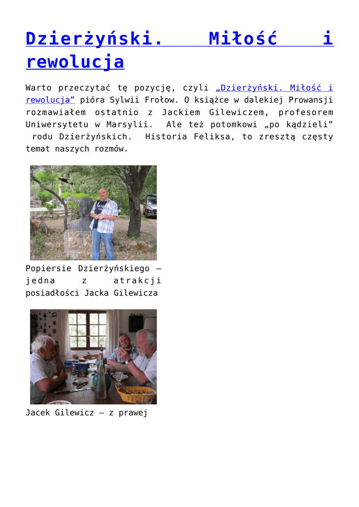 Dzierżyński. rewolucja Miłość i Warto przeczytać tę pozycję, czyli „Dzierżyński. Miłość i rewolucja” pióra Sylwii Frołow. O książce w dalekiej Prowansji rozmawiałem ostatnio z Jackiem Gilewiczem, profesorem Uniwersytetu w Marsylii. Ale też potomkowi „po kądzieli” rodu Dzierżyńskich. Historia Feliksa, to zresztą częsty temat naszych rozmów. Popiersie Dzierżyńskiego – jedna z atrakcji posiadłości Jacka Gilewicza Jacek Gilewicz – z prawej