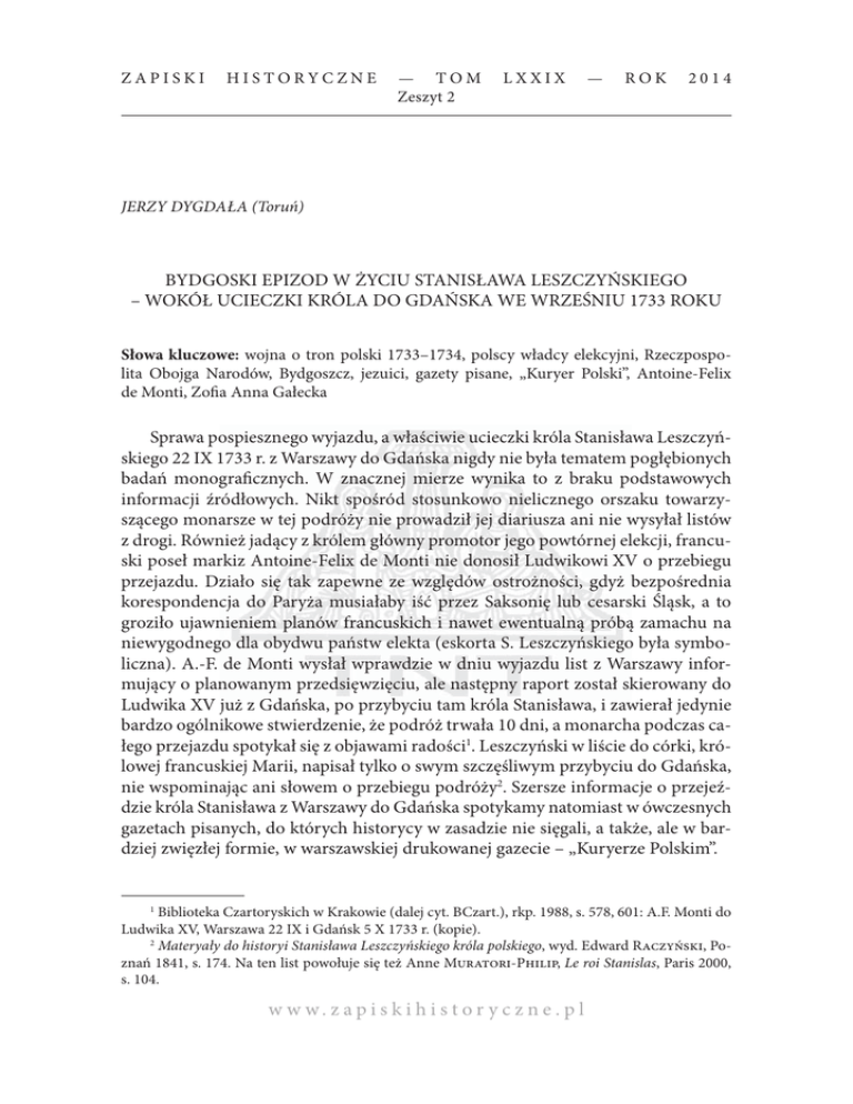 ZAPISKI HISTORYCZNE — TOM Zeszyt 2 LXXIX — ROK 2014 JERZY DYGDAŁA (Toruń) BYDGOSKI EPIZOD W ŻYCIU STANISŁAWA LESZCZYŃSKIEGO – WOKÓŁ UCIECZKI KRÓLA DO GDAŃSKA WE WRZEŚNIU 1733 ROKU Słowa kluczowe: wojna o tron polski 1733–1734, polscy władcy elekcyjni, Rzeczpospolita Obojga Narodów, Bydgoszcz, jezuici, gazety pisane, „Kuryer Polski”, Antoine-Felix de Monti, Zofia Anna Gałecka Sprawa pospiesznego wyjazdu, a właściwie ucieczki króla Stanisława Leszczyńskiego 22 IX 1733 r. z Warszawy do Gdańska nigdy nie była tematem pogłębionych badań monograficznych. W znacznej mierze wynika to z braku podstawowych informacji źródłowych. Nikt spośród stosunkowo nielicznego orszaku towarzyszącego monarsze w tej podróży nie prowadził jej diariusza ani nie wysyłał listów z drogi. Również jadący z królem główny promotor jego powtórnej elekcji, francuski poseł markiz Antoine-Felix de Monti nie donosił Ludwikowi XV o przebiegu przejazdu. Działo się tak zapewne ze względów ostrożności, gdyż bezpośrednia korespondencja do Paryża musiałaby iść przez Saksonię lub cesarski Śląsk, a to groziło ujawnieniem planów francuskich i nawet ewentualną próbą zamachu na niewygodnego dla obydwu państw elekta (eskorta S. Leszczyńskiego była symboliczna). A.-F. de Monti wysłał wprawdzie w dniu wyjazdu list z Warszawy informujący o planowanym przedsięwzięciu, ale następny raport został skierowany do Ludwika XV już z Gdańska, po przybyciu tam króla Stanisława, i zawierał jedynie bardzo ogólnikowe stwierdzenie, że podróż trwała 10 dni, a monarcha podczas całego przejazdu spotykał się z objawami radości1. Leszczyński w liście do córki, królowej francuskiej Marii, napisał tylko o swym szczęśliwym przybyciu do Gdańska, nie wspominając ani słowem o przebiegu podróży2. Szersze informacje o przejeździe króla Stanisława z Warszawy do Gdańska spotykamy natomiast w ówczesnych gazetach pisanych, do których historycy w zasadzie nie sięgali, a także, ale w bardziej zwięzłej formie, w warszawskiej drukowanej gazecie – „Kuryerze Polskim”. 1 Biblioteka Czartoryskich w Krakowie (dalej cyt. BCzart.), rkp. 1988, s. 578, 601: A.F. Monti do Ludwika XV, Warszawa 22 IX i Gdańsk 5 X 1733 r. (kopie). 2 Materyały do historyi Stanisława Leszczyńskiego króla polskiego, wyd. Edward Raczyski, Poznań 1841, s. 174. Na ten list powołuje się też Anne Muratori-Philip, Le roi Stanislas, Paris 2000, s. 104. w w w. z a p i s k i h i s t o r y c z n e . p l 74 Jerzy Dygdała [234] Również w jednej z pierwszych biografii S. Leszczyńskiego, napisanej przez elbląskiego historyka Georga Daniela Seylera, będącego niejako świadkiem tych wydarzeń, i wydanej w polskim tłumaczeniu w 1744 r., znajduje się akapit poświęcony przybyciu króla do Gdańska: „[...] dnia 22. Sept[embris] ruszył się [król] z Warszawy w kompanii z francuskim posłem i z grafem Poniatowskim, na Bydgoszcz ku Gdańskowi, dokąd dnia 2. Octobr[is] szczęśliwie, ale incognito przybywszy, wstąpił do francuskiego rezydenta Mathieu [Louisa Mathy’ego]. Nazajutrz przybył też tam i prymas z wielo innych znaczniejszych panów”3. W tej sytuacji nie powinno dziwić, że wiadomości zawarte w dotychczasowych opracowaniach poświęconych S. Leszczyńskiemu na temat jego wyjazdu do Gdańska są więcej niż skromne. Klemens Kantecki w obszernej biografii Stanisława Poniatowskiego, opierając się chyba jednak na G. D. Seylerze, napisał: „jechał król w towarzystwie markiza Monti, Poniatowskiego, oraz książąt Czartoryskich na Łowicz i Bydgoszcz. Na dniu 2 października przybył incognito do Gdańska i stanął tymczasowo w domu rezydenta francuskiego, imieniem Mathieu; w następnym dniu przyjechali za nim prymas i inni magnaci”4. W podstawowej przez długi czas dla historii drugiej elekcji Leszczyńskiego monografii Pierre’a Boyé, opartej głównie na źródłach francuskich, znajduje się tylko wzmianka, że królowi w drodze nad Bałtyk towarzyszyło jedynie kilku wiernych stronników5. Z kolei Szymon Askenazy w najpełniejszym jak dotąd polskim opracowaniu dziejów elekcji z 1733 r. zadowolił się stwierdzeniem, że „Stanisław, król od dni dziesięciu, w otoczeniu swoich najbliższych pośpiesznie opuścił stolicę i nie oparł się aż w warownym Gdańsku”6. Podobnie ujął to jednym zdaniem Józef Feldman w późniejszej biografii króla Stanisława7. Nieco więcej miejsca poświęcił wcześniej temu epizodowi Alfons Michał Wodziński, choć część jego informacji nie była ścisła8. Na tę też głównie pozycję powoływała się Jadwiga Lechicka w monografii poświęconej S. Leszczyńskiemu, opisując jego wyjazd do Gdańska9. 3 Georg Daniel Seyler, Życie Nayjaśnieyszego Stanisława I króla polskiego, [b.m.w.] 1744, s. 411. 4 Klemens Kantecki, Stanisław Poniatowski, kasztelan krakowski, ojciec Stanisława Augusta, t. 1, Poznań 1880, s. 223. 5 Pierre Boyé, Stanislas Leszczynski et le Troisiéme traité de Vienne, Paris 1898, s. 158. 6 Szymon Askenazy, Przedostatnie bezkrólewie, [in:] idem, Dwa stulecia XVII i XIX. Badania i przyczynki, t. 1, Warszawa 1901, s. 139. 7 Józef Feldman, Stanisław Leszczyński, oprac. Jacek Staszewski, Warszawa 1984 (wyd. 3), s. 177. 8 Alfons Michał Wodziski, Oblężenie Gdańska w roku 1733–1734, Rocznik Gdański, t. 9/10: 1935/1936, s. 348: „W towarzystwie prymasa Potockiego, podskarbiego koronnego Ossolińskiego, regimentarza Poniatowskiego, podkanclerzego litewskiego Czartoryskiego i biskupa płockiego Załuskiego udał się król do Gdańska, licząc z pewnością na pomoc francuską”. 9 Jadwiga Lechicka, Rola dziejowa Stanisława Leszczyńskiego oraz wybór z jego pism, Toruń 1951, s. 51–52. w w w. z a p i s k i h i s t o r y c z n e . p l [235] Bydgoski epizod w życiu Stanisława Leszczyńskiego... 75 Bezpośrednio przed drugą wojną światową Erwin Nadolny opublikował arty