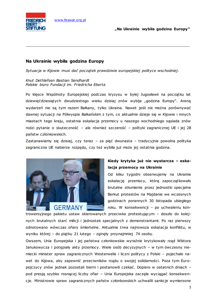W www.feswar.org.pl „Na Ukrainie wybiła godzina Europy“ ___________________________________________________________________________ Na Ukrainie wybiła godzina Europy Sytuacja w Kijowie musi dać początek prawdziwie europejskiej polityce wschodniej. Knut Dethlefsen Bastian Sendhardt Polskie biuro Fundacji im. Friedricha Eberta Po klęsce Wspólnoty Europejskiej podczas kryzysu w byłej Jugosławii na początku lat dziewięćdziesiątych dwudziestego wieku dzisiaj znów wybija „godzina Europy“. Areną wydarzeń nie są tym razem Bałkany, tylko Ukraina. Nawet jeśli nie można porównywać dawnej sytuacji na Półwyspie Bałkańskim z tym, co aktualnie dzieje się w Kijowie i innych miastach tego kraju, ostatnia eskalacja przemocy u naszego wschodniego sąsiada znów rodzi pytanie o skuteczność – ale również szczerość – polityki zagranicznej UE i jej 28 państw członkowskich. Zastanawiamy się dzisiaj, czy teraz – za pięć dwunasta – tradycyjnie powolna polityka zagraniczna UE nabierze rozpędu, czy też wybiła już może jej ostatnia godzina. Kiedy krytyka już nie wystarcza – eskalacja przemocy na Ukrainie Od kilku tygodni obserwujemy na Ukrainie eskalację przemocy, którą zapoczątkowało brutalne stłumienie przez jednostki specjalne Berkut protestów na Majdanie we wczesnych godzinach porannych 30 listopada ubiegłego roku. W konsekwencji – po uchwaleniu kontrowersyjnego pakietu ustaw skierowanych przeciwko protestującym – doszło do kolejnych brutalnych starć milicji i jednostek specjalnych z demonstrantami. Po raz pierwszy odnotowano wówczas ofiary śmiertelne. Aktualnie trwa najnowsza eskalacja konfliktu, w wyniku której – do piątku 21 lutego – zginęły przynajmniej 74 osoby. Owszem, Unia Europejska i jej państwa członkowskie wyraźnie krytykowały rząd Wiktora Janukowycza i potępiały akty przemocy. Wiele osób decyzyjnych – w tym ówczesny niemiecki minister spraw zagranicznych Westerwelle i liczni politycy z Polski – pojechało nawet do Kijowa, aby zapewnić przeciwników rządu o swojej solidarności. Poza tym Europejczycy znów jednak pozostali bierni i postanowili czekać. Dopiero w ostatnich dniach – pod presją szybko rosnącej liczby ofiar – Unia Europejska zaczęła wyciągać konsekwencje. Ministrowie spraw zagranicznych państw członkowskich uchwalili sankcje wymierzone 1 W www.feswar.org.pl „Na Ukrainie wybiła godzina Europy“ ___________________________________________________________________________ w ukraińskich przywódców (dotyczące przede wszystkim zamrożenia kont i zakazu wja zdu na terytorium UE). Ponadto ministrowie spraw zagranicznych Polski, Niemiec i Francji pojechali do Kijowa, aby prowadzić negocjacje z prezydentem Janukowyczem i trzema liderami opozycji – Jaceniukiem, Kliczką i Tiahnybokiem. Laurent Fabius wrócił do Paryża w czwartek wieczorem, Frank-Walter Steinmeier i Radosław Sikorski mediowali w Kijowie aż do osiągnięcia piątkowego porozumienia. Nie wolno przyznać Nuland racji! Na początku lutego amerykańska dyplomatka Vict oria Nuland w rozmowie telefonicznej z ambasadorem USA na Ukrainie opisała rolę Unii Europejskiej słowami „Fuck the EU!”. Nie ulega wątpliwości, że dyplomata nie powinien się tak wyrażać, jednak to my, Europejczycy, musimy teraz udowodnić – choć może jest już na to za późno – że Nuland nie tylko nieumiejętnie dobiera słowa, ale też po prostu nie ma racji. UE i jej państwa członkowskie podejmować zdecydowane działania, nawet jeżeli szanse powodzenia wydają się nieznaczne. Potrzebne są więc sankcje i mediacja między opo zycją a rządem. Nowemu rządowi Ukrainy, posiadającemu demokratyczną legitymację, n ależy dać perspektywę otrzymania pakietu pomocy gospodarczej. Pakiet ten wiązałby się z podpisaniem umowy stowarzyszeniowej między Ukrainą a Unią Europejską i perspektywą członkostwa. Wydaje się, że Unia Europejska zrobiła już krok naprzód. Uchwalono nałożenie sankcji na ukraińskich przywódców odpowiedzialnych za akty przemocy. Trwają właśnie prace nad listą konkretnych nazwisk. Jak najszybciej muszą teraz wejść w życie decyz je o zamrożeniu kont i wydaniu zakazu wjazdu na terytorium UE. Bez wątpienia rację mają krytycy, którzy zwracają uwagę, że sankcje nałożono zbyt późno. Nie wolno jednak wyciągać z tego wniosku, że w ogóle nie należy ich już w takim razie wprowadzać. Nie da się cofnąć aktów przemocy z ostatnich dni, ale sankcje mają znaczenie symboliczne, pozwalając Europie zachować resztki konsekwencji i zdolności do działania. Czas na polsko-niemiecki duet na Ukrainie Steinmeierowi i Sikorskiemu udało się w piątkowe popołudnie przekonać do zawarcia porozumienia nie tylko prezydenta Janukowycza i trzech liderów opozycji, ale też znaczną 2 W www.feswar.org.pl „Na Ukrainie wybiła godzina Europy“ ___________________________________________________________________________ część przeciwników rządu, zgromadzonych na Majdanie i reprezentowanych przez tzw. Radę Społeczną Majdanu. Zgodnie z porozumieniem jeszcze w tym roku mają się odbyć przedterminowe wybory prezydenckie. Ponadto planuje się utworzenie rządu jedności narodowej oraz powrót do konstytucji z 2004 roku, która wyraźnie ogranicza uprawnienia prezydenta. Podpisanie porozumienia stanowi bez wątpienia mały sukces. Może to być jednak dopiero początek. Radykalni przeciwnicy rządu nie zadowolą się raczej poczynionymi ustaleniami i będą dalej domagać się ustąpienia prezydenta Janukowycza. Niezależnie od rozwoju s ytuacji zaangażowanie UE na Ukrainie musi mieć st ały i zrównoważony charakter. Należy zapewnić wcielenie zawartego porozumienia w życie. Polska i Niemcy mogłyby tutaj działać wspólnie, kształtując w duecie prawdziwie europejską politykę wschodnią. Warszawa wykazała już zainteresowanie w tym zakresie i udowodniła, że dysponuje stoso