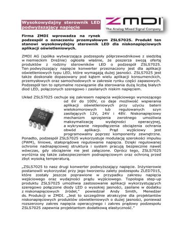 Wysokowydajny sterownik LED podwyższający napięcie Firma ZMDI wprowadza na rynek podzespół o oznaczeniu przemysłowym ZSLS7025. Produkt ten stanowi wysokowydajny sterownik LED dla niskonapięciowych aplikacji oświetleniowych. ZMDI AG (spółka wytwarzająca podzespoły półprzewodnikowe z siedzibą w niemieckim Dreźnie) ogłosiła właśnie, że poszerza swoją ofertę produktów z rodziny sterowników LED o podzespół ZSLS7025. Ten podwyższający napięcie konwerter przeznaczony jest dla aplikacji oświetleniowych typu LED, które wymagają dużej jasności. ZSLS7025 jest także doskonale dopasowany pod kątem wielu aplikacji konsumenckich, przemysłowych oraz samochodowych w zakresie rynku części zapasowych. Podzespół ten to optymalne rozwiązanie dla sterowania dużą liczbą białych diod LED, połączonych szeregowo i zasilanych niskim napięciem. Układ ZSLS7025 cechuje się zakresem napięcia wejściowego wynoszącego od 6V do 100V, co daje możliwość wspierania aplikacji oświetleniowych przy użyciu baterii wielokomorowych lub regulowanych szyn zasilających 12V, 24V i 48V. Niskonapięciowy mechanizm sprzężenia zwrotnego umożliwia maksymalizację wydajności operacyjnej, a wykrywanie niepodłączenia obciążenia ochrania obwód aplikacji. Prąd wyjściowy jest programowalny poprzez komponenty zewnętrzne. Ponadto, podzespół ZSLS7025 wykorzystuje modulację szerokości impulsu (PWM), liniowe, stałoprądowe regulowanie napięcia. Dzięki regulowanej ochronie nadnapięciowej struktura i system pracują bezpiecznie nawet wówczas, gdy obciążenie nie jest załączone. Oprócz tego, ZSLS7025 wyróżnia się także zabezpieczeniem podnapięciowym oraz ochroną przed zbyt wysoką temperaturą. „ZSLS7025 to nasz drugi konwerter podwyższający napięcie. Inżynierowie postanowili wykorzystać przy jego tworzeniu zalety podzespołu ZLED7015, które zostały jeszcze poprawione w przypadku zakresu napięcia wejściowego oraz wydajności prądu wyjściowego. Topologia step-up produktu ZSLS7025 umożliwia zastosowanie aplikacji wykorzystujących szeregowo połączone diody LED o wysokiej jasności, zasilane w dodatku z niskonapięciowych źródeł,” powiedział Andy Smith, Menedżer ds. Produkcji w ZMDI. „Jest to szczególnie atrakcyjne dla projektantów niskonapięciowych produktów oświetleniowych o dużej jasności, ponieważ rozszerzony zakres napięcia operacyjnego i zakres prądowy podzespołu ZSLS7025 zapewnia projektantom dodatkową elastyczność.” Niski poziom napięcia zasilania oraz stała wartość prądu wyjściowego czynią podzespół ZSLS7025 idealnym produktem do zastosowania w aplikacjach typu SELV (safety extra-low voltage) lub w złożonych lampach reflektorowych (MR16), które są często spotykane w urządzeniach ogólnego oświetlenia domowego. Inne przykłady obszarów wykorzystania nowego konwertera obejmują niskonapięciowe, zmodernizowane oświetlenie, zamienniki tradycyjnych świetlówek, podświetlenie LED, samochodowe produkty oświetleniowe dostępne na rynku części zapasowych, niskonapięciowe aplikacje przemysłowe ogólnego przeznaczenia i aplikacje konsumenckie, jak również oznakowanie oraz światła uliczne. Kluczowe zalety Szeroki zakres napięcia wejściowego wynoszący od 6 VDC do 100 VDC Wysoka wydajność sięgająca nawet 95% Wykrywanie braku obciążenia stanowiące zabezpieczenie przed wysokimi prądami Mała obudowa Podzespół ZSLS7025 jest dostarczany w obudowie SOP-8, która jest w pełni zgodna ze standardami RoHS. Jego zakres temperatur pracy wynosi od -40°C do +85°C (od -40°F do +185°F). Informacje o firmie ZMDI Firma ZMD AG (ZDMI) to globalny dostawca podzespołów analogowych i analogowo-cyfrowych, które cechują się bardzo niskim poborem energii, dla aplikacji samochodowych, przemysłowych, konsumenckich oraz medycznych. Produkty firmy ZMDI to: układy interfejsowe sensorów, układy przemysłowej szyny danych i interfejsy, przetworniki analogowe-cyfrowe o wysokich osiągach oraz sterowniki diod LED. Firma z wielkim sukcesem opracowuje i wytwarza układy analogowo-cyfrowe, układy scalone typu ASIC oraz podzespoły wysoce wyspecjalizowane pod kątem specyficznych zastosowań (ASSP). Wszystkie wyroby cechują się niskim poborem mocy. Głównym celem firmy ZMDI jest umożliwienie swoim odbiorcom dostarczania systemów, które są w stanie zapewnić małe zapotrzebowanie na energię. Zapraszamy do składania zapytań - przygotujemy satysfakcjonującą Państwa ofertę! SE Spezial-Electronic Sp. z o.o. ul. Stępińska 22/30 lok. 209 00-739 Warszawa tel. 22 840 91 10 fax. 22 841 20 10 www.spezial.pl