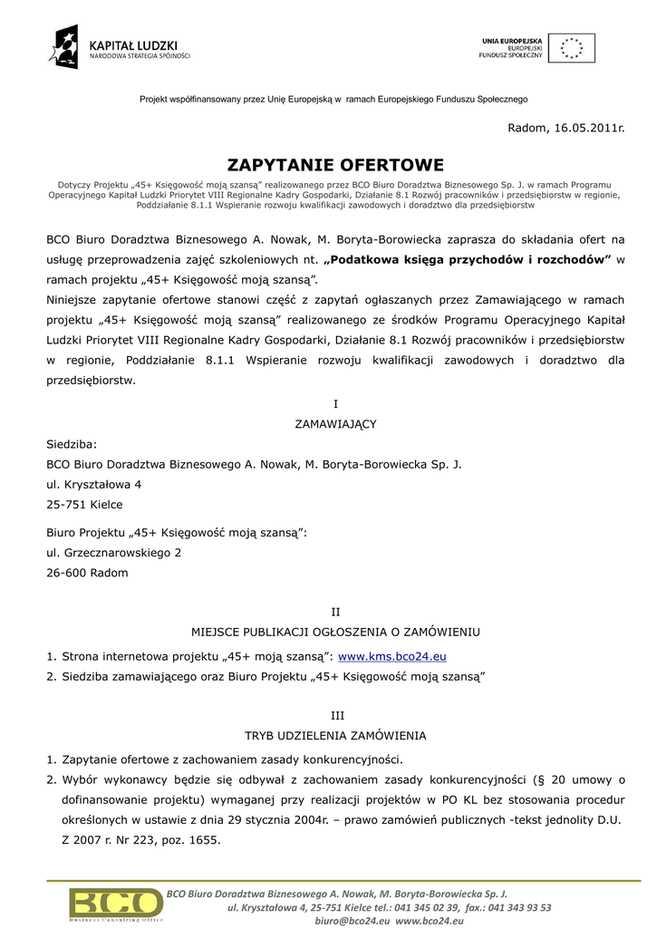 Projekt współfinansowany przez Unię Europejską w ramach Europejskiego Funduszu Społecznego Radom, 16.05.2011r. ZAPYTANIE OFERTOWE Dotyczy Projektu „45+ Księgowość moją szansą” realizowanego przez BCO Biuro Doradztwa Biznesowego Sp. J. w ramach Programu Operacyjnego Kapitał Ludzki Priorytet VIII Regionalne Kadry Gospodarki, Działanie 8.1 Rozwój pracowników i przedsiębiorstw w regionie, Poddziałanie 8.1.1 Wspieranie rozwoju kwalifikacji zawodowych i doradztwo dla przedsiębiorstw BCO Biuro Doradztwa Biznesowego A. Nowak, M. Boryta-Borowiecka zaprasza do składania ofert na usługę przeprowadzenia zajęć szkoleniowych nt. „Podatkowa księga przychodów i rozchodów” w ramach projektu „45+ Księgowość moją szansą”. Niniejsze zapytanie ofertowe stanowi część z zapytań ogłaszanych przez Zamawiającego w ramach projektu „45+ Księgowość moją szansą” realizowanego ze środków Programu Operacyjnego Kapitał Ludzki Priorytet VIII Regionalne Kadry Gospodarki, Działanie 8.1 Rozwój pracowników i przedsiębiorstw w regionie, Poddziałanie 8.1.1 Wspieranie rozwoju kwalifikacji zawodowych i doradztwo dla przedsiębiorstw. I ZAMAWIAJĄCY Siedziba: BCO Biuro Doradztwa Biznesowego A. Nowak, M. Boryta-Borowiecka Sp. J. ul. Kryształowa 4 25-751 Kielce Biuro Projektu „45+ Księgowość moją szansą”: ul. Grzecznarowskiego 2 26-600 Radom II MIEJSCE PUBLIKACJI OGŁOSZENIA O ZAMÓWIENIU 1. Strona internetowa projektu „45+ moją szansą”: www.kms.bco24.eu 2. Siedziba zamawiającego oraz Biuro Projektu „45+ Księgowość moją szansą” III TRYB UDZIELENIA ZAMÓWIENIA 1. Zapytanie ofertowe z zachowaniem zasady konkurencyjności. 2. Wybór wykonawcy będzie się odbywał z zachowaniem zasady konkurencyjności (§ 20 umowy o dofinansowanie projektu) wymaganej przy realizacji projektów w PO KL bez stosowania procedur określonych w ustawie z dnia 29 stycznia 2004r. – prawo zamówień publicznych -tekst jednolity D.U. Z 2007 r. Nr 223, poz. 1655. BCO Biuro Doradztwa Biznesowego A. Nowak, M. Boryta-Borowiecka Sp. J. ul. Kryształowa 4, 25-751 Kielce tel.: 041 345 02 39, fax.: 041 343 93 53 [email protected] www.bco24.eu Projekt współfinansowany przez Unię Europejską w ramach Europejskiego Funduszu Społecznego IV ZAMÓWIENIA CZĘŚCIOWE Zamawiający nie dopuszcza składania ofert częściowych ani wariantowych. V OPIS PRZEDMIOTU ZAMÓWIENIA Przedmiotem zamówienia jest przeprowadzenie szkolenia (opracowanie materiałów dydaktycznych oraz osobiste poprowadzenie zajęć) w ramach tematu „Podatkowa księga przychodów i rozchodów” na rzecz uczestników projektu „45+ Księgowość moją szansą” 1. Rodzaj zamówienia: usługi 2. Nazwa nadana zamówieniu przez zamawiającego: Przeprowadzenie zajęć szkoleniowych nt. „Podatkowa księga przychodów i rozchodów” 3. Wspólny Słownik Zamówień (CPV): - 80500000-9 – usługi szkoleniowe 4. Przewidywany okres realizacji przedmiotu zamówienia: 25.05.2011r. do 31.08.2011r. (I tura szkoleń) oraz 15.08.2011r. do 30.11.2011r. (II tura szkoleń) Podane terminy okresu realizacji przedmiotu zamówienia mogą ulec zmianie, ponieważ zależne są od przebiegu rekrutacji uczestników na szkolenia. 5. Ilość godzin dydaktycznych (45min.) w ramach jednego szkolenia: 136 6. Tryb szkolenia: a) tryb popołudniowy – 4h dydaktyczne 3x/tyg w godz.16:00-19:30 lub 16:30-20:00 (wraz z wliczoną przerwą obiadową 20 min. i przerwą kawową 10min.) b) tryb weekendowy – 8h dydaktycznych w soboty oraz niedziele w godz. 8:00-14:45 lub 9:0015:45 (wraz z wliczoną przerwą obiadową 25 min i dwiema przerwami kawowymi po 10 min.) Szczegółowy harmonogram zajęć zostanie przedstawiony przez Zamawiającego na min. tydzień przed rozpoczęciem szkolenia. 7. Ilość osób w grupie szkoleniowej: 10 8. Opis odbiorców szkolenia: kobiety pracujące po 45-tym roku życia, posiadające wykształcenie najwyżej średnie, zamieszkujące m. Radom lub powiat radomski chcące z własnej inicjatywy podnieść kwalifikacje. Często są to kobiety pracujące w działach księgowych od wielu lat, które chcą zaktualizować bądź poszerzyć wiedzę księgową oraz rozwiązać problematyczne zagadnienia. 9. Sposób prowadzenia szkoleń: Zajęcia mają mieć charakter teoretyczno-praktyczny wykłady oraz warsztaty (zastosowanie nabytej wiedzy teoretycznej w praktyce, case study, zajęcia z wykorzystaniem programów komputerowych takich jak. np. Płatnik, Symfonia). 10. Wymagania dotyczące materiałów dydaktycznych: min. 40 str. (opracowane w języku polskim) powinny zostać dostarczone w wersji elektronicznej (płyta CD, zapis pozwalający na obróbkę tekstu – w wersji Word) w terminie uzgodnionym z Zamawiającym. BCO Biuro Doradztwa Biznesowego A. Nowak, M. Boryta-Borowiecka Sp. J. ul. Kryształowa 4, 25-751 Kielce tel.: 041 345 02 39, fax.: 041 343 93 53 [email protected] www.bco24.eu Projekt współfinansowany przez Unię Europejską w ramach Europejskiego Funduszu Społecznego VI WYMAGANIA WZGLĘDEM WYKONAWCY 1. Wykonawca musi posiadać wykształcenie wyższe zgodne z tematyką szkolenia, doświadczenie oraz wiedzę niezbędną do wykonywania zadań określonych w opisie przedmiotu zamówienia. 2. Wykonawca musi mieć udokumentowane co najmniej 250 godzin doświadczenia w zakresie prowadzenia szkoleń w obszarze tematu zapytania ofertowego. 3. Wykonawca przeniesie na Zamawiającego autorskie prawa majątkowe do materiałów szkoleniowych, w tym prawo do wykorzystania materiałów szkoleniowych w części lub w całości na wszystkich polach eksploatacji określonych w ustawie o prawie autorskim. 4. Wykonawca zobowiązuje się do: osobistego prowadzenia zajęć w ustalonym terminie prowadzenia zajęć zgodnie z zasadą równych szans dbania o odpowiednią informację uczestników szkolenia o współfinansowaniu projektu ze środków Unii Europejskiej w ramach Europejskiego Funduszu Społecznego dostarczenia pełnej dokumen