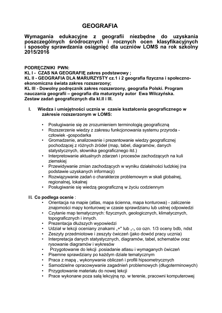 GEOGRAFIA Wymagania edukacyjne z geografii niezbędne do uzyskania poszczególnych śródrocznych i rocznych ocen klasyfikacyjnych i sposoby sprawdzania osiągnięć dla uczniów LOMS na rok szkolny 2015/2016 PODRĘCZNIKI PWN: KL I - CZAS NA GEOGRAFIĘ zakres podstawowy ; KL II - GEOGRAFIA DLA MARURZYSTY cz.1 i 2 geografia fizyczna i społecznoekonomiczna świata zakres rozszerzony; KL III - Dowolny podręcznik zakres rozszerzony, geografia Polski. Program nauczania geografii – geografia dla maturzysty autor Ewa Wilczyńska. Zestaw zadań geograficznych dla kl.II i III. I. Wiedza i umiejętności ucznia w czasie kształcenia geograficznego w zakresie rozszerzonym w LOMS: • • • • • • • Posługiwanie się ze zrozumieniem terminologią geograficzną Rozszerzenie wiedzy z zakresu funkcjonowania systemu przyroda człowiek -gospodarka Gromadzenie, analizowanie i prezentowanie wiedzy geograficznej pochodzącej z różnych źródeł (map, tabel, diagramów, danych statystycznych, słownika geograficznego itd.) Interpretowanie aktualnych zdarzeń i procesów zachodzących na kuli ziemskiej Przewidywanie zmian zachodzących w wyniku działalności ludzkiej (na podstawie uzyskanych informacji) Rozwiązywanie zadań o charakterze problemowym w skali globalnej, regionalnej, lokalnej Posługiwanie się wiedzą geograficzną w życiu codziennym I I. Co podlega ocenie : • Orientacja na mapie (atlas, mapa ścienna, mapa konturowa) - zaliczenie znajomości mapy konturowej w czasie sprawdzianu lub ustnej odpowiedzi • Czytanie map tematycznych: fizycznych, geologicznych, klimatycznych, topograficznych i innych. • Prezentacja dłuższych wypowiedzi • Udział w lekcji oceniany znakami „+" lub „-„ co ozn. 1/3 oceny bdb, ndst • Zeszyty przedmiotowe i zeszyty ćwiczeń (jako dowód pracy ucznia) • Interpretacja danych statystycznych, diagramów, tabel, schematów oraz rysowanie diagramów i wykresów • Przygotowanie do lekcji .posiadanie atlasu i wymaganych ćwiczeń • Pisemne sprawdziany po każdym dziale tematycznym • Praca z mapą , wykonywanie obliczeń i profili hipsometrycznych • Samodzielne opracowywanie zagadnień problemowych (długoterminowych) • Przygotowanie materiału do nowej lekcji • Prace wykonane poza salą lekcyjną np. w terenie, pracowni komputerowej III. Zasady wystawiania ocen i kryteria oceniania 1. Przy odpowiedzi ustnej i pisemnej ocenie podlegają: • poziom merytoryczny, dobór i zakres treści, wyjaśnianie zjawisk i procesów, stosowanie terminów i nazw geograficznych • poprawność stylistyczna i kultura wypowiedzi. 2. W pracach pisemnych - samodzielność, dokładność, konstrukcja pracy, estetyka. Kryteria oceny prac pisemnych (przynajmniej dwóch w semestrze) 90%-100% punktów -bardzo dobry 74%-89% pkt -dobry 51%-73% pkt –dostateczny 31%50% pkt -dopuszczający poniżej 30% pkt -niedostateczny 3. Każdy sprawdzian pisemny jest zapowiedziany przynajmniej na tydzień przed terminem – zapis w e-dzienniku 4. Sprawdzian ,dla uczniów przebywających na zgrupowaniach terminy i zakres materiału podany będzie w terminarzu dziennika elektronicznego. 5. Uczeń który nie był obecny na sprawdzianie ma obowiązek w ciągu miesiąca/ na dodatkowych lekcjach/ od momentu przyjścia do szkoły napisać sprawdzian. Po tym terminie w miejsce oceny wpisane zostanie „0".Oceny ze sprawdzianu można poprawić w ciągu miesiąca (nie dłużej) wyłącznie na dodatkowych lekcjach geografii, wyjątkowo za zgodą nauczyciela na lekcji. 6. Nauczyciel może przeprowadzić bez zapowiadania „kartkówkę" obejmującą materiał 3 ostatnich lekcji a uczniowie nieobecni na dwóch ostatnich lekcjach nie będą oceniani, powinni zaliczyć materiał z 3 ostatnich lekcji na dodatkowych lekcjach . 7. Jeżeli uczeń opuścił sprawdzian, kartkówkę z przyczyn losowych, to powinien napisać ją w terminie uzgodnionym z nauczycielem. 8. Oceny uzyskane za pracę i odpowiedź ustną na lekcji nie podlegają poprawie. 9. Nieobecność na lekcji nie zwalnia ucznia z przygotowania do lekcji i możliwości odpowiedzi lub klasówki (chyba, że jest to dłuższa nieobecność niż 2 tygodnie). 10. Uczeń, który opuści więcej niż 50% lekcji w semestrze z powodów innych niż sportowe zalicza u nauczyciela materiał z całego semestru w postaci egzaminu ustnego i pisemnego. Nie zaliczenie równe jest ocenie niedostatecznej. 11. Ocenę semestralną i końcoworoczną nauczyciel wystawia na podstawie ocen cząstkowych uzyskanych przez ucznia, lecz nie jest to średnia arytmetyczna z ocen . 12. Ocenę roczną stanowi 50 % wartości oceny śródrocznej i 50 % średniej arytmetycznej ocen bieżących uzyskanych w II okresie nauki. 13. Nauczyciel informuje uczniów i wprowadza do e- dziennika przewidywane roczne oceny klasyfikacyjne w terminie określonym w statucie szkoły. 14. Rodzice lub opiekunowie prawni są informowani o ocenach przewidywanych przez wychowawcę danej klasy w sposób przez niego ustalony. 15. Uczeń może złożyć podanie o podniesienie oceny rocznej tylko w przypadku zaliczenia przez niego we właściwym terminie wszystkich przewidzianych w danym roku sprawdzianów i ma mniej niż 10% nieusprawiedliwionych godzin lekcji geografii .Uczeń zalicza w formie pisemnej najwyżej jedną partię materiału z której uzyskał na sprawdzianie ocenę niższą od pozostałych i nie miał możliwości jej poprawy w określonym w p. 5 terminie. 16. Uczniowie z dysfunkcjami oceniani są wg odrębnych zasad zalecanych przez Poradnię Psychologiczno-Pedagogiczną. IV. Wymagania edukacyjne na poszczególne oceny: STOPIEŃ CELUJĄCY Otrzymuje uczeń, który posiadł wiedzę faktograficzną i terminologiczną obejmującą cały program nauczania w danej klasie z geografii, wykracza wiadomościami poza program, wykazuje zainteresowanie zagadnieniami geograficznymi, samodzielnie selekcjonuje i interpretuje zjawiska geograficzne, ocenia i wyciąga wnioski na podstawie ma