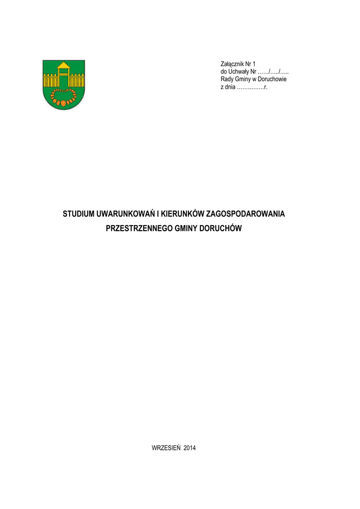 Załącznik Nr 1 do Uchwały Nr ……/…../….. Rady Gminy w Doruchowie z dnia ……………r. STUDIUM UWARUNKOWAŃ I KIERUNKÓW ZAGOSPODAROWANIA PRZESTRZENNEGO GMINY DORUCHÓW WRZESIEŃ 2014 SPIS TREŚCI WSTĘP 6 I. UWARUNKOWANIA 9 1. Uwarunkowania regionalne 9 2. Dotychczasowe przeznaczenie i zagospodarowanie terenu 11 2.1. Uzbrojenie terenu .................................................................................................................................... 12 3. Stan ładu przestrzennego i wymogi jego ochrony 12 3.1. Główne problemy i zagroŜenia ładu przestrzennego............................................................................... 12 4. Stan środowiska, w tym stan rolniczej i leśnej przestrzeni produkcyjnej, wielkość i jakość zasobów wodnych oraz wymogi ochrony środowiska i przyrody 13 4.1. Środowisko przyrodnicze......................................................................................................................... 13 4.1.1. PołoŜenie i rzeźba terenu ................................................................................................................... 13 4.1.2. Budowa geologiczna........................................................................................................................... 14 4.1.3. Wody powierzchniowe i podziemne.................................................................................................... 14 4.1.4. Gleby .................................................................................................................................................. 17 4.1.5. Warunki klimatyczne........................................................................................................................... 17 4.1.6. Szata roślinna i świat zwierzęcy ......................................................................................................... 18 4.2. Rolnicza i leśna przestrzeń produkcyjna ................................................................................................. 20 4.3. Obszary naturalnych zagroŜeń................................................................................................................ 21 4.3.1. Tereny naraŜone na niebezpieczeństwo powodzi .............................................................................. 21 4.3.2. Występowanie obszarów naturalnych zagroŜeń geologicznych ......................................................... 21 4.4. Zanieczyszczenie środowiska................................................................................................................... 21 4.3.3. Klimat akustyczny ............................................................................................................................... 27 4.3.4. Promieniowanie elektromagnetyczne ................................................................................................. 28 5. Stan dziedzictwa kulturowego i zabytków oraz dóbr kultury współczesnej 29 5.1. Rys historyczny ....................................................................................................................................... 29 5.2. Zasoby wpisane do rejestru zabytków..................................................................................................... 30 5.3. Zasoby o wartościach kulturowych i historycznych ................................................................................. 30 5.4. Zabytki archeologiczne............................................................................................................................ 34 5.5. Krajobraz kulturowy................................................................................................................................. 37 6. Warunki i jakość Ŝycia mieszkańców, w tym ochrona ich zdrowia oraz zagroŜenia bezpieczeństwa ludności i jej mienia 37 6.1. Sytuacja demograficzna .......................................................................................................................... 37 6.1.1. Liczebność populacji........................................................................................................................... 37 6.1.2. Struktura płci i wieku........................................................................................................................... 38 6.2. Rynek pracy ............................................................................................................................................ 41 6.3. Mieszkalnictwo ........................................................................................................................................ 41 6.4. Handel ..................................................................................................................................................... 42 6.5. Oświata ................................................................................................................................................... 42 6.6. Ochrona zdrowia i opieka społeczna....................................................................................................... 43 6.7. Bezpieczeństwo publiczne ...................................................................................................................... 44 7. Stan prawny gruntów 44 7.1. Struktura własności ................................................................................................................................. 44 7.2. Granice terenów zamkniętych i ich stref ochronnych .............................................................................. 45 8. Stan systemów komunikacji 45 8.1. Drogi wojewódzkie .................................................................................................................................. 45 8.2. Drogi powiatowe...................................................................................................................................... 45 8.3. Drog
