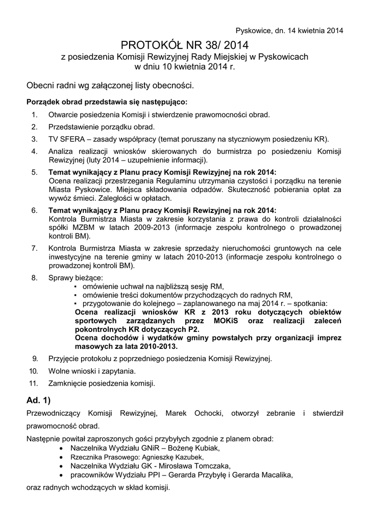 Pyskowice, dn. 14 kwietnia 2014 PROTOKÓŁ NR 38/ 2014 z posiedzenia Komisji Rewizyjnej Rady Miejskiej w Pyskowicach w dniu 10 kwietnia 2014 r. Obecni radni wg załączonej listy obecności. Porządek obrad przedstawia się następująco: 1. Otwarcie posiedzenia Komisji i stwierdzenie prawomocności obrad. 2. Przedstawienie porządku obrad. 3. TV SFERA – zasady współpracy (temat poruszany na styczniowym posiedzeniu KR). 4. Analiza realizacji wniosków skierowanych do burmistrza po posiedzeniu Komisji Rewizyjnej (luty 2014 – uzupełnienie informacji). 5. Temat wynikający z Planu pracy Komisji Rewizyjnej na rok 2014: Ocena realizacji przestrzegania Regulaminu utrzymania czystości i porządku na terenie Miasta Pyskowice. Miejsca składowania odpadów. Skuteczność pobierania opłat za wywóz śmieci. Zaległości w opłatach. 6. Temat wynikający z Planu pracy Komisji Rewizyjnej na rok 2014: Kontrola Burmistrza Miasta w zakresie korzystania z prawa do kontroli działalności spółki MZBM w latach 2009-2013 (informacje zespołu kontrolnego o prowadzonej kontroli BM). 7. Kontrola Burmistrza Miasta w zakresie sprzedaży nieruchomości gruntowych na cele inwestycyjne na terenie gminy w latach 2010-2013 (informacje zespołu kontrolnego o prowadzonej kontroli BM). 8. Sprawy bieżące: ▪ omówienie uchwał na najbliższą sesję RM, ▪ omówienie treści dokumentów przychodzących do radnych RM, ▪ przygotowanie do kolejnego – zaplanowanego na maj 2014 r. – spotkania: Ocena realizacji wniosków KR z 2013 roku dotyczących obiektów sportowych zarządzanych przez MOKiS oraz realizacji zaleceń pokontrolnych KR dotyczących P2. Ocena dochodów i wydatków gminy powstałych przy organizacji imprez masowych za lata 2010-2013. 9. Przyjęcie protokołu z poprzedniego posiedzenia Komisji Rewizyjnej. 10. Wolne wnioski i zapytania. 11. Zamknięcie posiedzenia komisji. Ad. 1) Przewodniczący Komisji Rewizyjnej, Marek Ochocki, otworzył zebranie prawomocność obrad. Następnie powitał zaproszonych gości przybyłych zgodnie z planem obrad: Naczelnika Wydziału GNiR – Bożenę Kubiak, Rzecznika Prasowego: Agnieszkę Kazubek, Naczelnika Wydziału GK - Mirosława Tomczaka, pracowników Wydziału PPI – Gerarda Przybyłę i Gerarda Macalika, oraz radnych wchodzących w skład komisji. i stwierdził Ad. 2) Przewodniczący przedstawił porządek spotkania, który został przyjęty bez zastrzeżeń przez pozostałych członków komisji. Ad. 3) TV SFERA – zasady współpracy (temat poruszany na styczniowym posiedzeniu KR). Przewodniczący przypomniał, że na posiedzeniu komisji w styczniu członkowie komisji zwrócili się do rzecznika prasowego, Agnieszki Kazubek, aby przed podpisaniem umowy ze Sferą TV Spółka z o.o. projekt umowy został przesłany do komisji RM. Niestety tak się nie stało, KR otrzymała (informację, że umowa została już podpisana radni usłyszeli na marcowej sesji RM) umowę już podpisaną ze Sferą TV. Rzecznik prasowy, Agnieszka Kazubek omówiła umowę oraz odpowiadała na pytania radnych. Przewodniczący zapytał, czy istnieje jakaś ustalona procedura przygotowywania materiałów do emisji przez UM. Rzecznik prasowy poinformowała, że już w zeszłym roku wszystkie jednostki i wydziały były powiadomione o możliwościach zgłaszania tematów do przygotowywanego programu. Po otrzymaniu materiały są omawiane w Biurze Promocji, które następnie decyduje, co i kiedy będzie nadawane w programie. Czas audycji jest ograniczony do 10 minut. Radny, Waldemar Paszkowski zapytał czy każdy radny będzie mógł przedstawić na antenie informację ze swojego okręgu. Rzecznik prasowy odpowiedziała, że prawdopodobnie o tym powinna zadecydować pani przewodnicząca RM. Radny, Waldemar Paszkowski nie rozumie, dlaczego radny sam nie może zgłosić nurtującego problemu do emisji w Sferze TV. Sugeruje wprowadzenie aneksu do umowy, który umożliwi to radnym. Radny, Marek Drobnicki odniósł się do treści umowy, gdzie wskazano, iż audycje dotyczyć będą „bieżących wydarzeń z życia miasta”, więc również radny powinien mieć możliwość przedstawienia ważnych wydarzeń z punku widzenia radnego. Radny, Arkadiusz Kotasiński zapytał, kto ostatecznie decydować będzie o tym, co znajdzie się w audycji. Rzecznik prasowy odpowiedziała, że to ona zgodnie z umową jest wskazana do podejmowania takich działań. Członkowie KR podkreślali, że umowa ze Sferą TV (umowa od 17 marca 2014 r.) nie umożliwiła (mieszkańcom Pyskowic) oglądania audycji, ponieważ telewizja kablowa Vectra nie nadaje w tej chwili tego programu. Ad. 4) Analiza realizacji wniosków skierowanych do burmistrza po posiedzeniu Komisji Rewizyjnej (luty 2014 – uzupełnienie informacji). Komisja Rewizyjna Rady Miejskiej w Pyskowicach Komisja wnioskuje do BM o przedstawienie informacji na temat ilości i wyników kontroli wysypiska śmieci w Pyskowicach (wraz z załączoną dokumentacją) prowadzonych w latach 2010-2013. 1. W odpowiedzi na wniosek głos zabrał Naczelnik Wydziału GK, Mirosław Tomczak, który w kilku zdaniach omówił kontrole przeprowadzone przez WIOŚ oraz przypomniał zalecenia pokontrolne. 2. Komisja wnioskuje do BM o podanie informacji na temat harmonogramu wypełniania kwater odpadami na wysypisku śmieci na lata 2006-2015. Odpowiedzi na poprzednim posiedzeniu udzielił Naczelnik Wydziału GK, Mirosław Tomczak (uzupełniono komplet materiałów). Radni dopytywali się o terminy zamknięcia kwater i ilości gromadzonych w nich odpadów. 3. Komisja wnioskuje do BM o przedstawienie i omówienie na kolejnym posiedzeniu Komisji Rewizyjnej dokumentacji projektowej oraz kosztorysu inwestorskiego związanych z budową drogi dojazdowej wraz z infrastrukturą towarzyszącą do strefy aktywizacji gospodarczej przy ul. Poznańskiej. Wniosek ten został szczegółowo omówiony na poprzedniej spotkaniu komisji przez Naczelnika Wydziału, Stanisława Kokota. Pracownicy wy