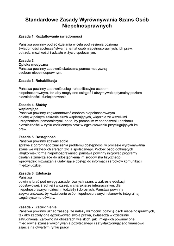 Standardowe Zasady Wyrównywania Szans Osób Niepełnosprawnych Zasada 1. Kształtowanie świadomości Państwa powinny podjąć działania w celu podniesienia poziomu świadomości społeczeństwa na temat osób niepełnosprawnych, ich praw, potrzeb, możliwości i udziału w życiu społecznym. Zasada 2. Opieka medyczna Państwa powinny zapewnić skuteczną pomoc medyczną osobom niepełnosprawnym. Zasada 3. Rehabilitacja Państwa powinny zapewnić usługi rehabilitacyjne osobom niepełnosprawnym, tak aby mogły one osiągać i utrzymywać optymalny poziom niezależności i funkcjonowania. Zasada 4. Służby wspierające Państwa powinny zagwarantować osobom niepełnosprawnym opiekę w pełnym zakresie służb wspierających, włącznie ze wszelkimi urządzeniami pomocniczymi, po to, by pomóc im w podnoszeniu poziomu niezależności w życiu codziennym oraz w egzekwowaniu przysługujących im praw. Zasada 5. Dostępność Państwa powinny zdawać sobie sprawę z ogromnego znaczenia problemu dostępności w procesie wyrównywania szans we wszystkich sferach życia społecznego. Wobec osób dotkniętych jakąkolwiek formą niepełnosprawności państwa powinny inicjować programy działania zmierzające do udostępnienia im środowiska fizycznego i wprowadzić rozwiązania ułatwiające dostęp do informacji i środków komunikacji międzyludzkiej. Zasada 6. Edukacja Państwa powinny brać pod uwagę zasadę równych szans w zakresie edukacji podstawowej, średniej i wyższej, o charakterze integracyjnym, dla niepełnosprawnych dzieci, młodzieży i dorosłych. Państwa powinny zagwarantować, by kształcenie osób niepełnosprawnych stanowiło integralną część systemu oświaty. Zasada 7. Zatrudnienie Państwa powinny uznać zasadę, że należy wzmocnić pozycję osób niepełnosprawnych, tak aby zaczęły one egzekwować swoje prawa, zwłaszcza w dziedzinie zatrudnienia. Zarówno na obszarach wiejskich, jak i miejskich powinny one mieć równe szanse wykonywania pożytecznego i satysfakcjonującego finansowo zajęcia na otwartym rynku pracy. Zasada 8. Środki utrzymania i zabezpieczenie socjalne Państwa są odpowiedzialne za bezpieczeństwo socjalne i zapewnienie środków utrzymania osobom niepełnosprawnym. Zasada 9. Życie rodzinne i integralność osobista Państwa powinny promować pełne uczestnictwo osób niepełnosprawnych w życiu rodzinnym. Powinny promować prawo do integralności osobistej i zagwarantować, by prawo nie dyskryminowało osób niepełnosprawnych ze względu na związki seksualne, małżeństwo i rodzicielstwo. Zasada 10. Kultura Państwa powinny zagwarantować osobom niepełnosprawnym integrację i możliwość uczestnictwa w wydarzeniach kulturalnych na równych prawach. Zasada 11. Sport i rekreacja Państwa podejmą działania, aby zapewnić osobom niepełnosprawnym równe możliwości uprawiania sportu i rekreacji. Zasada 12. Religia Państwa będą podejmować działania ułatwiające równoprawne uczestnictwo osób niepełnosprawnych w życiu religijnym ich społeczności. Zasada 13. Informacja i badania naukowe Państwa przyjmują główną odpowiedzialność za gromadzenie i rozpowszechnianie informacji na temat warunków życiowych osób niepełnosprawnych oraz promowanie badań naukowych dotyczących wszystkich aspektów ich życia, łącznie z analizowaniem przeszkód utrudniających im codzienne funkcjonowanie. Zasada 14. Kreowanie polityki i planowanie Państwa powinny zagwarantować, by problemy niepełnosprawności były uwzględniane w skali całego kraju w procesie kreowania polityki i planowania dotyczącego tych problemów. Zasada 15. Tworzenie prawa Państwa odpowiadają za tworzenie podstaw prawnych dla działań prowadzących do pełnego uczestnictwa i wyrównywania szans osób niepełnosprawnych. Zasada 16. Polityka ekonomiczna Państwa ponoszą odpowiedzialność finansową za krajowe programy i działania nakierowane na tworzenie równych szans osobom niepełnosprawnym. Zasada 17. Koordynacja działań Państwa są odpowiedzialne za ustanowienie i umacnianie pozycji krajowych komitetów koordynacyjnych lub innych podobnych organów, które służyłyby jako instancje ogniskujące na poziomie krajowym działania dotyczące problemów niepełnosprawności. Zasada 18. Organizacje osób niepełnosprawnych Państwa powinny określić prawo organizacji osób niepełnosprawnych do reprezentowania osób niepełnosprawnych na poziomach krajowym, regionalnym i lokalnym. Państwa powinny także uznać doradczą rolę organizacji osób niepełnosprawnych w kształtowaniu polityki społecznej w odniesieniu do tych osób. Zasada 19. Szkolenie personelu Państwa są odpowiedzialne za zapewnienie na wszystkich poziomach właściwego szkolenia personelu, zaangażowanego w planowanie i prowadzenie programów i usług dla osób niepełnosprawnych. Zasada 20. Monitoring krajowy i ocena programów dotyczących niepełnosprawności w zakresie wdrażania niniejszych zasad Państwa są odpowiedzialne za stałą kontrolę i ocenę wdrażania programów krajowych oraz służb i usług dotyczących wyrównywania szans osób niepełnosprawnych. Zasada 21. Współpraca techniczna i gospodarcza Obowiązkiem państw uprzemysłowionych i rozwijających się jest współpraca i podejmowanie działań na rzecz poprawy warunków życia osób niepełnosprawnych w krajach rozwijających się. Zasada 22. Współpraca międzynarodowa Państwa będą aktywnie uczestniczyć we współpracy międzynarodowej dotyczącej polityki wyrównywania szans osób niepełnosprawnych.