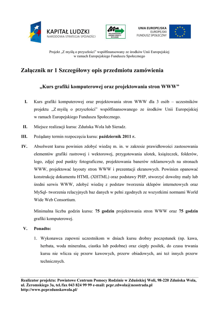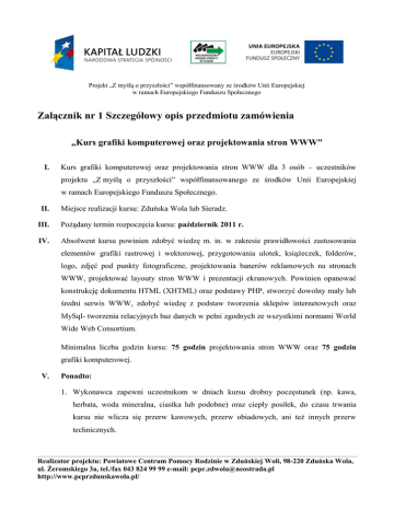 Projekt „Z myślą o przyszłości” współfinansowany ze środków Unii Europejskiej w ramach Europejskiego Funduszu Społecznego Załącznik nr 1 Szczegółowy opis przedmiotu zamówienia „Kurs grafiki komputerowej oraz projektowania stron WWW” I. Kurs grafiki komputerowej oraz projektowania stron WWW dla 3 osób – uczestników projektu „Z myślą o przyszłości” współfinansowanego ze środków Unii Europejskiej w ramach Europejskiego Funduszu Społecznego. II. Miejsce realizacji kursu: Zduńska Wola lub Sieradz. III. Pożądany termin rozpoczęcia kursu: październik 2011 r. IV. Absolwent kursu powinien zdobyć wiedzę m. in. w zakresie prawidłowości zastosowania elementów grafiki rastrowej i wektorowej, przygotowania ulotek, książeczek, folderów, logo, zdjęć pod punkty fotograficzne, projektowania banerów reklamowych na stronach WWW, projektować layouty stron WWW i prezentacji ekranowych. Powinien opanować konstrukcję dokumentu HTML (XHTML) oraz podstawy PHP, stworzyć dowolny mały lub średni serwis WWW, zdobyć wiedzę z podstaw tworzenia sklepów internetowych oraz MySql- tworzenia relacyjnych baz danych w pełni zgodnych ze wszystkimi normami World Wide Web Consortium. Minimalna liczba godzin kursu: 75 godzin projektowania stron WWW oraz 75 godzin grafiki komputerowej. V. Ponadto: 1. Wykonawca zapewni uczestnikom w dniach kursu drobny poczęstunek (np. kawa, herbata, woda mineralna, ciastka lub podobne) oraz ciepły posiłek, do czasu trwania kursu nie wlicza się przerw kawowych, przerw obiadowych, ani też innych przerw technicznych. Realizator projektu: Powiatowe Centrum Pomocy Rodzinie w Zduńskiej Woli, 98-220 Zduńska Wola, ul. Żeromskiego 3a, tel./fax 043 824 99 99 e-mail: [email protected] http://www.pcprzdunskawola.pl/ Projekt „Z myślą o przyszłości” współfinansowany ze środków Unii Europejskiej w ramach Europejskiego Funduszu Społecznego 2. Wykonawca zobowiązany jest do zapewnienia niezbędnego sprzętu i oprogramowani do przeprowadzenia kursu. 3. Wykonawca zobowiązany jest w przypadku organizacji kursu w Sieradzu zapewnić uczestnikom kursu transport ze Zduńskiej Woli do miejsca odbywania kursu i z powrotem. Koszty transportu należy ująć w koszcie kursu. 4. Wykonawca zobowiązany jest zapewnić ubezpieczenie uczestników w drodze na kurs, podczas jego trwania i z powrotem. Koszt ubezpieczenia NW należy ująć w koszcie kursu. 5. Wykonawca zobowiązany jest do przygotowania i druku materiałów dydaktycznych (dla każdego uczestnika kursu: program kursu i harmonogram zajęć zbindowane lub w inny sposób połączone, materiały szkoleniowe, długopis, notatnik, dodatkowe multimedialne lub/i papierowe materiały dydaktyczne oraz jeden komplet tak przygotowanych materiałów dla Zamawiającego, z naniesionymi odpowiednio logotypami, których wzór Wykonawca otrzyma od Zamawiającego. 6. Wykonawca w uzgodnieniu z Zamawiającym, wystawi uczestnikowi kursu zaświadczenie (certyfikat) uczestnictwa w kursie z logo Unii Europejskiej, EFS, Wojewódzkiego Urzędu Pracy w Łodzi, nazwą realizatora, tytułem projektu i nazwą programu. 7. Uczestnik na zakończenie kursu otrzyma zaświadczenie potwierdzające jego ukończenie na druku zgodnym z §6 Rozporządzenia Ministra Edukacji i Nauki z dnia 3 lutego 2006 r. w sprawie uzyskiwania i uzupełniania przez osoby dorosłe wiedzy ogólnej, umiejętności i kwalifikacji zawodowych w formach pozaszkolnych (Dz. U. Nr 31, poz. 216). Szczegółowych informacji w tej sprawie po stronie Zamawiającego udzieli koordynator projektu P. Joanna Grabowska, tel. 661180001. Realizator projektu: Powiatowe Centrum Pomocy Rodzinie w Zduńskiej Woli, 98-220 Zduńska Wola, ul. Żeromskiego 3a, tel./fax 043 824 99 99 e-mail: [email protected] http://www.pcprzdunskawola.pl/