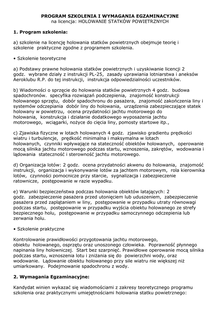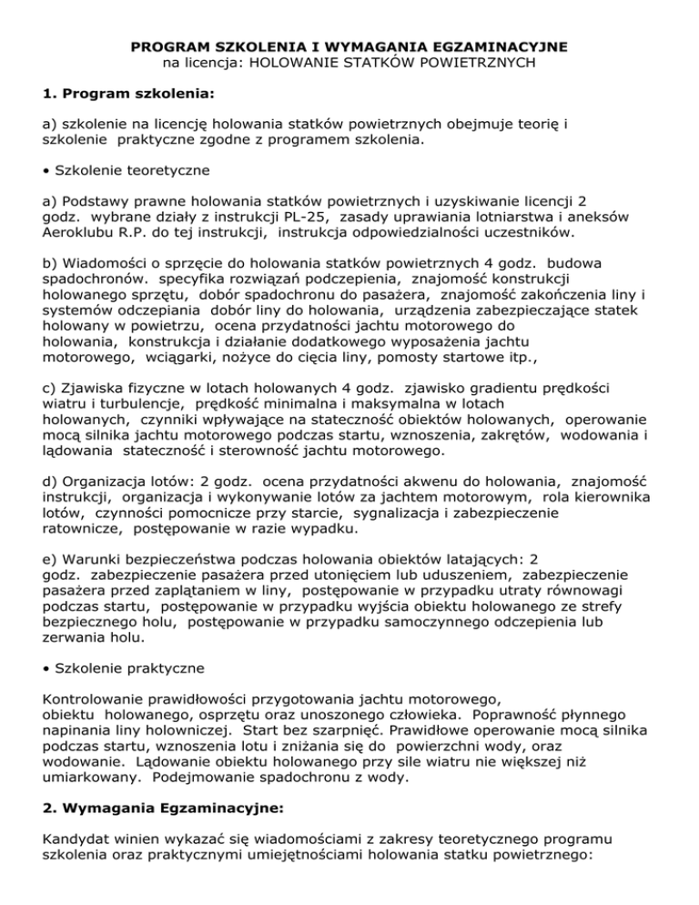 PROGRAM SZKOLENIA I WYMAGANIA EGZAMINACYJNE na licencja: HOLOWANIE STATKÓW POWIETRZNYCH 1. Program szkolenia: a) szkolenie na licencję holowania statków powietrznych obejmuje teorię i szkolenie praktyczne zgodne z programem szkolenia. • Szkolenie teoretyczne a) Podstawy prawne holowania statków powietrznych i uzyskiwanie licencji 2 godz. wybrane działy z instrukcji PL-25, zasady uprawiania lotniarstwa i aneksów Aeroklubu R.P. do tej instrukcji, instrukcja odpowiedzialności uczestników. b) Wiadomości o sprzęcie do holowania statków powietrznych 4 godz. budowa spadochronów. specyfika rozwiązań podczepienia, znajomość konstrukcji holowanego sprzętu, dobór spadochronu do pasażera, znajomość zakończenia liny i systemów odczepiania dobór liny do holowania, urządzenia zabezpieczające statek holowany w powietrzu, ocena przydatności jachtu motorowego do holowania, konstrukcja i działanie dodatkowego wyposażenia jachtu motorowego, wciągarki, nożyce do cięcia liny, pomosty startowe itp., c) Zjawiska fizyczne w lotach holowanych 4 godz. zjawisko gradientu prędkości wiatru i turbulencje, prędkość minimalna i maksymalna w lotach holowanych, czynniki wpływające na stateczność obiektów holowanych, operowanie mocą silnika jachtu motorowego podczas startu, wznoszenia, zakrętów, wodowania i lądowania stateczność i sterowność jachtu motorowego. d) Organizacja lotów: 2 godz. ocena przydatności akwenu do holowania, znajomość instrukcji, organizacja i wykonywanie lotów za jachtem motorowym, rola kierownika lotów, czynności pomocnicze przy starcie, sygnalizacja i zabezpieczenie ratownicze, postępowanie w razie wypadku. e) Warunki bezpieczeństwa podczas holowania obiektów latających: 2 godz. zabezpieczenie pasażera przed utonięciem lub uduszeniem, zabezpieczenie pasażera przed zaplątaniem w liny, postępowanie w przypadku utraty równowagi podczas startu, postępowanie w przypadku wyjścia obiektu holowanego ze strefy bezpiecznego holu, postępowanie w przypadku samoczynnego odczepienia lub zerwania holu. • Szkolenie praktyczne Kontrolowanie prawidłowości przygotowania jachtu motorowego, obiektu holowanego, osprzętu oraz unoszonego człowieka. Poprawność płynnego napinania liny holowniczej. Start bez szarpnięć. Prawidłowe operowanie mocą silnika podczas startu, wznoszenia lotu i zniżania się do powierzchni wody, oraz wodowanie. Lądowanie obiektu holowanego przy sile wiatru nie większej niż umiarkowany. Podejmowanie spadochronu z wody. 2. Wymagania Egzaminacyjne: Kandydat winien wykazać się wiadomościami z zakresy teoretycznego programu szkolenia oraz praktycznymi umiejętnościami holowania statku powietrznego: a) Przedmioty teoretyczne - Przepisy - Wiadomości o sprzęcie do holowania statków powietrznych - Warunki bezpieczeństwa podczas hol. statków powietrznych Organizacja lotów holowanych - Zjawiska fizyczne w lotach holowanych Przygotowanie miejsca startowego - Przygotowanie jachtu holującego Przygotowanie liny i spadochronu b) Praktyka - Podejmowanie spadochronu z wody - Napinanie liny przygotowanej na lądzie - Wydawanie liny z jachtu holującego - Manewry jachtem holującym - Loty po prostej na małej wysokości, zniżanie wodowanie - Loty po prostej, wznoszenie, lot poziomy, zniżanie, wodowanie, lądowanie - Loty połączone z zawracaniem