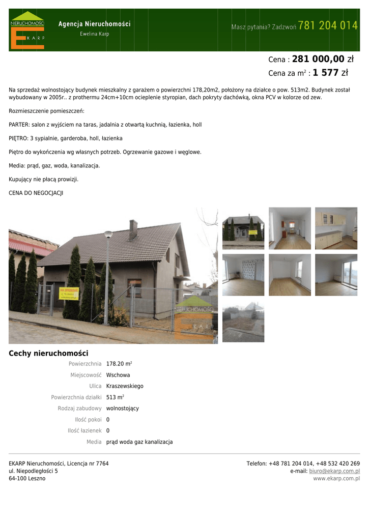Cena : 281 000,00 zł Cena za m2 : 1 577 zł Na sprzedaż wolnostojący budynek mieszkalny z garażem o powierzchni 178,20m2, położony na działce o pow. 513m2. Budynek został wybudowany w 2005r.. z prothermu 24cm+10cm ocieplenie styropian, dach pokryty dachówką, okna PCV w kolorze od zew. Rozmieszczenie pomieszczeń: PARTER: salon z wyjściem na taras, jadalnia z otwartą kuchnią, łazienka, holl PIĘTRO: 3 sypialnie, garderoba, holl, łazienka Piętro do wykończenia wg własnych potrzeb. Ogrzewanie gazowe i węglowe. Media: prąd, gaz, woda, kanalizacja. Kupujący nie płacą prowizji. CENA DO NEGOCJACJI Cechy nieruchomości Powierzchnia 178.20 m2 Miejscowość Wschowa Ulica Kraszewskiego Powierzchnia działki 513 m2 Rodzaj zabudowy wolnostojący Ilość pokoi 0 Ilość łazienek 0 Media prąd woda gaz kanalizacja EKARP Nieruchomości, Licencja nr 7764 ul. Niepodległości 5 64-100 Leszno Telefon: +48 781 204 014, +48 532 420 269 e-mail: [email protected] www.ekarp.com.pl