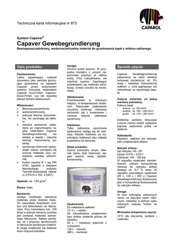 Techniczna karta informacyjna nr 873 System Capaver® Capaver Gewebegrundierung Bezrozpuszczalnikowy, wodorozcieńczalny materiał do gruntowania tapet z włókna szklanego. Opis produktu: Zastosowanie: Lekko wypełniający materiał stosowany jako warstwa gruntująca (pośrednia) na tapetach Capaver przed wykonaniem warstwy końcowej materiałami Capaver Acryl-Finish, CapaverEpoxi-Finish, czy też wysokiej jakości farbami lateksowymi. Właściwości: • Bezrozpuszczalnikowy, • wodorozcieńczalny, • pokrywa tkaninę równomiernie, nie zacierając jej faktury, • warstwa wierzchnia nakładana po zagruntowaniu tapety materiałem Capaver Gewebegrundierung nie wsiąka w tapetę i zasycha tworząc równomierną powłokę • wyrównuje chłonność tapety, dzięki czemu zmniejsza się zużycie materiału przy nakładaniu warstwy wierzchniej • trudno zapalny B 1 wg DIN 4102, zgodnie z atestami Niemieckiego Instytutu Techniki Budowlanej (atesty nr Z-PA-III 2.704, 2.2447). Uwaga: Chronić przed dziećmi. W przypadku kontaktu z oczami natychmiast przemyć je obficie wodą. Przy natryskiwaniu nie wdychać oparów. Zapobiegać przedostaniu się materiału kanalizacji. Unikać zrzutów do środowiska. Składowanie: Przechowywać w chłodnym miejscu, w temperaturach dodatnich. Napoczęte opakowanie szczelnie zamknąć. Ostrożnie obchodzić się z kontenerem i zwracać jedynie całkowicie opróżniony. Utylizacja: Tylko całkowicie opróżnione opakowania nadają się do utylizacji. Resztki materiału po wyschnięciu traktować jako odpady budowlane lub domowe. Skład produktu: Żywice polioctanu winylu, ditlenek tytanu (biel tytanowa), węglan wapnia, woda, dodatki, konserwanty. Gęstość: ok. 1,60 g/cm3 Barwa: biała. Barwienie: Istnieje możliwość barwienia materiału przez dodanie maks. 5% barwników Amphibolin Vollton- und Abtönfarben lub Alpinacolor. Przy zamówieniu min. 100 litrów w jednym odcieniu możliwa jest dostawa materiału barwionego fabrycznie. Należy pamiętać, że z przyczyn technicznych w fabrycznie barwionym materiale mogą znajdować się śladowe ilości rozpuszczalników. Opakowania: Do nakładania wałkiem: 12, 5 L – wiadro Do natryskiwania urządzeniem typu airless (materiał gotowy do obróbki): 25 L – metalowy pojemnik z uchwytami, 120 L – beczka, 480 L – kontener. Sposób użycia: Capaver Gewebegrundierung zabarwiony na kolor warstwy końcowej rozcieńczyć ok. 5% wody i nakładać równomiernie wałkiem z runa jagnięcego lub natryskiwać na wyschniętą tapetę. Zużycie materiału na jedną warstwę pośrednią: Faktura tapet: - drobna ok. 150 ml/m² średnia ok. 180 – 200 ml/m² gruba ok. 210 – 260 ml/m² Dokładne wartości dotyczące zużycia można ustalić wyłącznie poprzez wykonanie próby na obiekcie. Nakładanie: Pędzlem, wałkiem lub natryskiwać urządzeniami airless. Natrysk airless: kąt natrysku:·40 - 50° Dysza:·0,019 – 0,021” Ciśnienie:·150 - 180 bar W wypadku opakowań standardowych ustawić konsystencję roboczą do natrysku airless dodając ok. 5-7 % wody. W wypadku pozostałych opakowań (25 L, 120 L i 450 L) Capaver Gewebegrundierung dostarczany jest w konsystencji dostosowanej do natrysku Airless. Uwaga: W celu uniknięcia widocznych różnic na złączach pasm roboczych, nakładać w jednym cyklu roboczym metodą "mokre na mokre". Minimalna temperatura użycia: +5°C dla otoczenia, podłoża i materiału. Czas schnięcia: W temp. +20°C i względnej wilgotności powietrza 65% warstwa jest powierzchniowo sucha i nadaje się do powtórnego malowania po 6 - 12 godz. Powłoka jest całkowicie sucha i w pełni wytrzymała po ok. 3 dniach. W niższych temperaturach i przy wyższej wilgotności powietrza czasy te ulegają wydłużeniu. Czyszczenie narzędzi: Natychmiast po użyciu wodą. Tolerancja na inne materiały: W celu zachowania specjalnych właściwości materiału Capaver Gebebegrundierung nie wolno mieszać z innymi materiałami. Doradztwo techniczne: W karcie niniejszej niemożliwe jest opisanie sposobów przygotowania wszystkich występujących w praktyce podłoży. W przypadkach, które nie zostały opisane powyżej, pomocnym może okazać się kontakt z naszym Działem technicznym. Chętnie udzielimy Państwu szczegółowych informacji związanych z konkretnym obiektem. Tel. (22) 544 20 40 Fax (22) 544 20 41 [email protected] Techniczna karta informacyjna Nr 873. Stan: luty 2005 Niniejsza karta informacyjna została sporządzona na bazie najnowszych osiągnięć techniki i naszych doświadczeń. Ze względu na różnorodność możliwych podłoży i warunków wykonawstwa każdorazowy Kupujący / Użytkownik jest zobowiązany sprawdzić na własną odpowiedzialność przydatność naszych produktów do zamierzonego celu przy każdorazowym uwzględnieniu warunków obiektowych wykonawstwa oraz wymogów i zasad sztuki i rzemiosła. Po ukazaniu się następnej wersji niniejsza karta traci swoją ważność. Caparol Polska Sp. z o. o.; ul. Baletowa 5C; PL – 02-867 Warszawa; tel. 022 544 20 40, faks 022 544 20 41; internet: www.caparol.com.pl Caparol Farben Lacke Bautenschutz GmbH; Roßdörfer Straße 50; D – 64372 Ober Ramstadt; tel. +49 6154 71-0; faks +49 6154 711391; internet: www.caparol.de