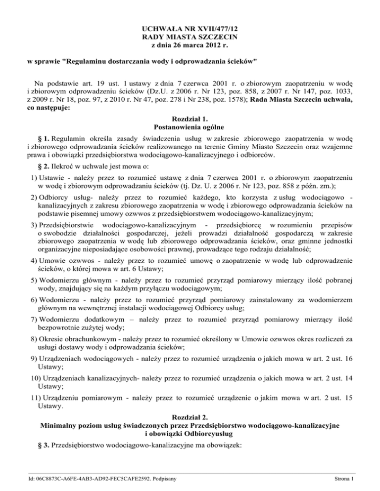 UCHWAŁA NR XVII/477/12 RADY MIASTA SZCZECIN z dnia 26 marca 2012 r. w sprawie "Regulaminu dostarczania wody i odprowadzania ścieków" Na podstawie art. 19 ust. 1 ustawy z dnia 7 czerwca 2001 r. o zbiorowym zaopatrzeniu w wodę i zbiorowym odprowadzeniu ścieków (Dz.U. z 2006 r. Nr 123, poz. 858, z 2007 r. Nr 147, poz. 1033, z 2009 r. Nr 18, poz. 97, z 2010 r. Nr 47, poz. 278 i Nr 238, poz. 1578); Rada Miasta Szczecin uchwala, co następuje: Rozdział 1. Postanowienia ogólne § 1. Regulamin określa zasady świadczenia usług w zakresie zbiorowego zaopatrzenia w wodę i zbiorowego odprowadzania ścieków realizowanego na terenie Gminy Miasto Szczecin oraz wzajemne prawa i obowiązki przedsiębiorstwa wodociągowo-kanalizacyjnego i odbiorców. § 2. Ilekroć w uchwale jest mowa o: 1) Ustawie - należy przez to rozumieć ustawę z dnia 7 czerwca 2001 r. o zbiorowym zaopatrzeniu w wodę i zbiorowym odprowadzaniu ścieków (tj. Dz. U. z 2006 r. Nr 123, poz. 858 z późn. zm.); 2) Odbiorcy usług- należy przez to rozumieć każdego, kto korzysta z usług wodociągowo kanalizacyjnych z zakresu zbiorowego zaopatrzenia w wodę i zbiorowego odprowadzania ścieków na podstawie pisemnej umowy ozwwos z przedsiębiorstwem wodociągowo-kanalizacyjnym; 3) Przedsiębiorstwie wodociągowo-kanalizacyjnym - przedsiębiorcę w rozumieniu przepisów o swobodzie działalności gospodarczej, jeżeli prowadzi działalność gospodarczą w zakresie zbiorowego zaopatrzenia w wodę lub zbiorowego odprowadzania ścieków, oraz gminne jednostki organizacyjne nieposiadające osobowości prawnej, prowadzące tego rodzaju działalność; 4) Umowie ozwwos - należy przez to rozumieć umowę o zaopatrzenie w wodę lub odprowadzenie ścieków, o której mowa w art. 6 Ustawy; 5) Wodomierzu głównym - należy przez to rozumieć przyrząd pomiarowy mierzący ilość pobranej wody, znajdujący się na każdym przyłączu wodociągowym; 6) Wodomierzu - należy przez to rozumieć przyrząd pomiarowy zainstalowany za wodomierzem głównym na wewnętrznej instalacji wodociągowej Odbiorcy usług; 7) Wodomierzu dodatkowym – należy przez to rozumieć przyrząd pomiarowy mierzący ilość bezpowrotnie zużytej wody; 8) Okresie obrachunkowym - należy przez to rozumieć określony w Umowie ozwwos okres rozliczeń za usługi dostawy wody i odprowadzania ścieków; 9) Urządzeniach wodociągowych - należy przez to rozumieć urządzenia o jakich mowa w art. 2 ust. 16 Ustawy; 10) Urządzeniach kanalizacyjnych- należy przez to rozumieć urządzenia o jakich mowa w art. 2 ust. 14 Ustawy; 11) Urządzeniu pomiarowym - należy przez to rozumieć urządzenie o jakim mowa w art. 2 ust. 15 Ustawy. Rozdział 2. Minimalny poziom usług świadczonych przez Przedsiębiorstwo wodociągowo-kanalizacyjne i obowiązki Odbiorcyusług § 3. Przedsiębiorstwo wodociągowo-kanalizacyjne ma obowiązek: ————————————————————————————————————————————————————————— Id: 06C8873C-A6FE-4AB3-AD92-FEC5CAFE2592. Podpisany Strona 1 1) zapewnić zdolność posiadanych Urządzeń wodociągowych i Urządzeń kanalizacyjnych do realizacji dostaw wody o odpowiednim ciśnieniu w maksymalnej, określonej w Umowie ozwwos ilości oraz jakości zgodnej z obowiązującymi przepisami oraz zapewnić dostawę wody i odprowadzanie ścieków w sposób ciągły i niezawodny; 2) zapewnić ogólne wymagania w zakresie jakości materiałów do budowy Urządzeń wodociągowych i Urządzeń kanalizacyjnych zgodnie z obowiązującymi normami i wewnętrznymi aktami normatywnymi Przedsiębiorstwa wodociągowo-kanalizacyjnego; 3) zapewnić ogólne wymagania dotyczące projektowania i wykonania sieci i przyłączy wodociągowych oraz sieci kanalizacyjnych i przyłączy kanalizacyjnych, w zakresie których mają wpływ na jakość usług; 4) spełniać wymagania w zakresie jakości usług wodociągowych i usług kanalizacyjnych określone w zezwoleniu na prowadzenie zbiorowego zaopatrzenia w wodę i zbiorowego odprowadzania ścieków; 5) zapewnić prawidłową eksploatację i naprawę Urządzeń wodociągowych i Urządzeń kanalizacyjnych, 6) prowadzenia wewnętrznej kontroli jakości dostarczanej wody; 7) zainstalowania na własny koszt i utrzymania u Odbiorcy Wodomierza głównego na przyłączu wodociągowym. § 4. Odbiorca usług zobowiązany jest do korzystania z zaopatrzenia w wodę i odprowadzania ścieków w sposób zgodny z przepisami Ustawy i nie powodujący pogorszenia jakości usług świadczonych przez Przedsiębiorstwo wodociągowo-kanalizacyjne oraz nie utrudniający działalności Przedsiębiorstwu wodociągowo-kanalizacyjnemu, w szczególności do: 1) użytkowania instalacji wodociągowej w sposób eliminujący możliwość wystąpienia skażenia chemicznego lub bakteriologicznego wody w sieci wodociągowej poprzez montaż oraz utrzymanie zaworów antyskażeniowych w przypadkach i na warunkach określonych odrębnymi przepisami; 2) utrzymania i odpowiedniego zabezpieczenia pomieszczenia (studzienki), w którym zainstalowany jest Wodomierz główny lub Urządzenie pomiarowe, przed uszkodzeniami mechanicznymi lub skutkami niskich temperatur oraz przed dostępem osób nieuprawnionych, jak również powiadomienia Przedsiębiorstwo wodociągowo-kanalizacyjne o wszelkich stwierdzonych uszkodzeniach Wodomierza głównego, Wodomierza dodatkowego lub Urządzenia pomiarowego, w tym o zerwaniu plomby; 3) użytkowania instalacji kanalizacyjnej w sposób nie powodujący zakłóceń funkcjonowania sieci kanalizacyjnej i umożliwienie kontroli jakości ścieków wprowadzanych do sieci, 4) umożliwienia upoważnionym przedstawicielom Przedsiębiorstwa wodociągowo-kanalizacyjnego wstępu na teren nieruchomości i do pomieszczeń w celach określonych przepisami Ustawy oraz niniejszego Regulaminu; 5) poinformowania Przedsiębiorstwa wodociągowo-kanalizacyjnego o własnych uj