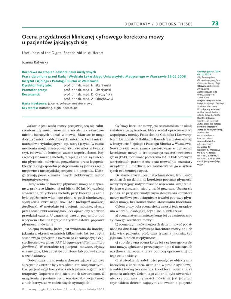 DOKTORATY / DOCTORS THESES 73 Ocena przydatności klinicznej cyfrowego korektora mowy u pacjentów jąkających się Usefulness of the Digital Speech Aid In stutterers Joanna Ratyńska Rozprawa na stopień doktora nauk medycznych Praca obroniona przed Radą I Wydziału Lekarskiego Uniwersytetu Medycznego w Warszawie 29.05.2008 Instytut Fizjologii i Patologii Słuchu w Warszawie Dyrektor Instytutu: prof. dr hab. med. H. Skarżyński Promotor pracy: prof. dr hab. med. H. Skarżyński Recenzenci: prof. dr hab. med. D. Gryczyńska prof. dr hab. med. A. Obrębowski Hasła indeksowe: jąkanie, cyfrowy korektor mowy Key words: stuttering, digital speech aid Jąkanie jest wadą mowy przejawiającą się zaburzeniem płynności mówienia na skutek skurczów mięśni biorących udział w mowie. Skurcze te mogą dotyczyć mięśni oddechowych, mięśni krtani i mięśni narządów artykulacyjnych, np. warg i języka. W czasie mówienia mogą występować skurcze mięśni twarzy, szyi, tułowia lub kończyn, zwane współruchami. Najczęściej stosowaną metodą terapii jąkania są ćwiczenia płynności mówienia prowadzone przez logopedę. Efekty takiego sposobu postępowania są jednak często niepewne i niesatysfakcjonujące dla pacjenta. Dlatego trwają poszukiwania innych efektywnych metod terapeutycznych. Urządzenia do korekcji płynności mowy są używane w praktyce klinicznej od blisko 50 lat. Najczęściej stosowaną dotychczas metodą przy korekcji jąkania było opóźnienie własnego głosu w pętli słuchowego sprzężenia zwrotnego, tzw. DAF (delayed auditory feedback). W metodzie tej pacjent, mówiąc, słyszy przez słuchawki własny głos, lecz opóźniony o pewien przedział czasu. U znacznej części pacjentów pod wpływem DAF następuje natychmiastowa poprawa płynności mówienia. Kolejną metodą, która jest wdrażana do korekcji jąkania w okresie ostatnich kilkunastu lat, jest pętla słuchowego sprzężenia zwrotnego z transpozycją częstotliwościową głosu FAF ( frequency-shifted auditory feedback). W metodzie tej pacjent, mówiąc, słyszy własny głos, który zostaje obniżony lub podwyższony o część oktawy. Dotychczas urządzenia wykorzystujące słuchowe sprzężenie zwrotne były urządzeniami stacjonarnymi, tzn. pacjent mógł korzystać z nich jedynie w gabinecie terapeuty. Dopiero w ostatnich latach stwierdzono, iż urządzenia te powinny być przenośne, aby pacjent mógł z nich korzystać w codziennych sytuacjach. O t o l a r y ngo l og i a Po l sk a t o m 6 3 , nr 1, s t yc ze ń – l u t y 2 0 0 9 Cyfrowy korektor mowy jest nowatorskim na skalę światową urządzeniem, który został opracowany we współpracy między Politechniką Gdańską i Uniwersytetem Dalhousie w Halifax w Kanadzie a testowany był w Instytucie Fizjologii i Patologii Słuchu w Warszawie. Nowatorskie rozwiązania zastosowane w cyfrowym korektorze mowy to transpozycja częstotliwościowa głosu (FAF), możliwość połączenia DAF i FAF o różnych wartościach parametrów oraz niewielkie rozmiary urządzenia, umożliwiające zastosowanie go w sytuacjach codziennego życia. Działanie aparatu jest natychmiastowe, tzn. u osób podatnych na działanie korektora poprawa płynności mowy występuje natychmiast po włączeniu urządzenia. Po jego wyłączeniu niepłynność powraca. Uważa się jednak, że przy systematycznym stosowaniu korektora mowy możliwe jest osiągnięcie trwałej poprawy płynności mowy, bez konieczności stosowania korektora. Celem pracy była ocena efektywności tego urządzenia w terapii osób jąkających się, a zwłaszcza: a) ocena natychmiastowej korzyści po zastosowaniu cyfrowego korektora mowy; b) ocena czynników mogących determinować podatność na działanie cyfrowego korektora mowy, takich jak: wiek pacjenta, płeć, czas trwania jąkania, typ jąkania, stopień niepłynności; c) subiektywna ocena korzyści z cyfrowego korektora mowy, zgłaszana przez pacjenta po 6 miesiącach użytkowania, oceniana za pomocą opracowanej do tego celu ankiety; d) stwierdzenie zależności pomiędzy obiektywną korzyścią z korektora, ocenianą w próbie sylabowej, a subiektywną korzyścią z korektora, ocenianą za pomocą ankiety. Celem tego zadania było stwierdzenie, czy poprawa płynności mówienia jest jedynym czynnikiem determinującym zadowolenie pacjenta Otolaryngol Pol 2009; 63 (1): 73-75 ©by Towarzystwo Otorynolaryngologów – Chirurgów Głowy i Szyi Otrzymano/Received: 29.08.2008 Zaakceptowano do druku/Accepted: 12.09.2008 Miejsca pracy autorów Instytut Fizjologii i Patologii Słuchu w Warszawie Wkład pracy autorów/ Authors contribution: Jolanta Ratyńska 100% Konflikt interesu/ Conflicts of interest: Autor pracy nie zgłasza konfliktu interesów Adres do korespondencji/ Address for correspondence: imię i nazwisko: Joanna Ratyńska adres pocztowy: ul. Mokra 17 Kajetany k. Warszawy 05-830 Nadarzyn tel. +48 22 3560321 fax +48 22 35 60 367 e-mail j.ratynska@ifps. org.pl 74 DOKTORATY / DOCTORS THESES z terapii, czy też korzystanie z korektora wpływa również na zachowania społeczne pacjenta, niezależnie od poprawy płynności mówienia. Badaniami objęto 335 pacjentów z niepłynnością mówienia w wieku od 6 do 64 lat. Średnia wieku w badanej grupie wyniosła 17,9 lat (odchylenie standardowe 9,0 lat). W grupie znajdowało się 268 mężczyzn (80%) i 67 kobiet (20%). Byli to kolejni pacjenci, którzy zgłosili się do Kliniki Foniatrii Instytutu Fizjologii i Patologii Słuchu w Warszawie w latach 2003–2006 z powodu zaburzeń płynności mowy. Pacjenci ci korzystali z terapii logopedycznej lub/i psychologicznej, lecz uważali, że terapia ta była lub jest nieskuteczna lub niewystarczająco skuteczna w ich przypadku. Dopasowanie cyfrowego korektora mowy dokonywano w ramach hospitalizacji w Klinice Foniatrii Instytutu Fizjologii i Patologii Słuchu w Warszawie. Przed rozpoczęciem dopasowania korektora u każdego pacjenta przeprow