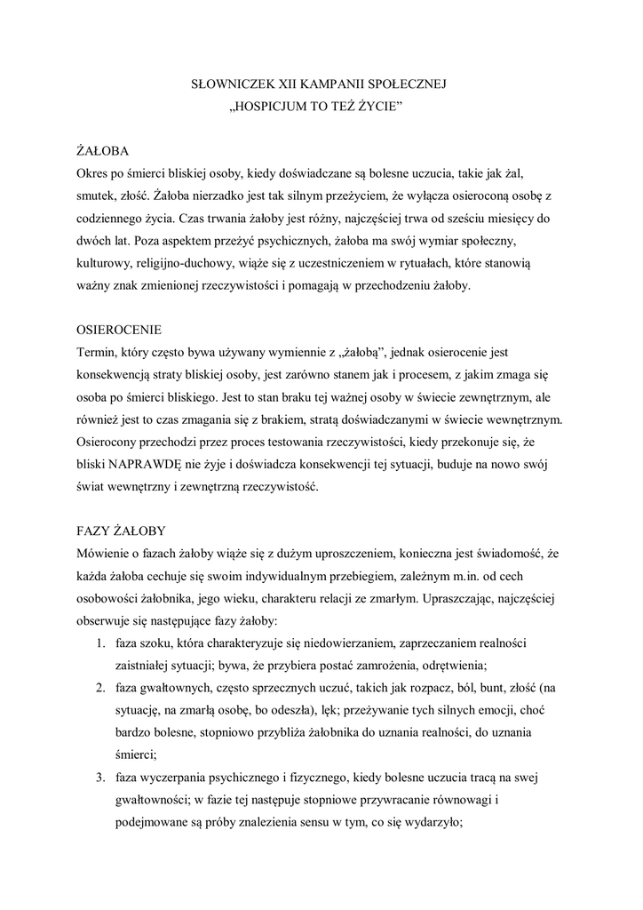 SŁOWNICZEK XII KAMPANII SPOŁECZNEJ „HOSPICJUM TO TEŻ ŻYCIE” ŻAŁOBA Okres po śmierci bliskiej osoby, kiedy doświadczane są bolesne uczucia, takie jak żal, smutek, złość. Żałoba nierzadko jest tak silnym przeżyciem, że wyłącza osieroconą osobę z codziennego życia. Czas trwania żałoby jest różny, najczęściej trwa od sześciu miesięcy do dwóch lat. Poza aspektem przeżyć psychicznych, żałoba ma swój wymiar społeczny, kulturowy, religijno-duchowy, wiąże się z uczestniczeniem w rytuałach, które stanowią ważny znak zmienionej rzeczywistości i pomagają w przechodzeniu żałoby. OSIEROCENIE Termin, który często bywa używany wymiennie z „żałobą”, jednak osierocenie jest konsekwencją straty bliskiej osoby, jest zarówno stanem jak i procesem, z jakim zmaga się osoba po śmierci bliskiego. Jest to stan braku tej ważnej osoby w świecie zewnętrznym, ale również jest to czas zmagania się z brakiem, stratą doświadczanymi w świecie wewnętrznym. Osierocony przechodzi przez proces testowania rzeczywistości, kiedy przekonuje się, że bliski NAPRAWDĘ nie żyje i doświadcza konsekwencji tej sytuacji, buduje na nowo swój świat wewnętrzny i zewnętrzną rzeczywistość. FAZY ŻAŁOBY Mówienie o fazach żałoby wiąże się z dużym uproszczeniem, konieczna jest świadomość, że każda żałoba cechuje się swoim indywidualnym przebiegiem, zależnym m.in. od cech osobowości żałobnika, jego wieku, charakteru relacji ze zmarłym. Upraszczając, najczęściej obserwuje się następujące fazy żałoby: 1. faza szoku, która charakteryzuje się niedowierzaniem, zaprzeczaniem realności zaistniałej sytuacji; bywa, że przybiera postać zamrożenia, odrętwienia; 2. faza gwałtownych, często sprzecznych uczuć, takich jak rozpacz, ból, bunt, złość (na sytuację, na zmarłą osobę, bo odeszła), lęk; przeżywanie tych silnych emocji, choć bardzo bolesne, stopniowo przybliża żałobnika do uznania realności, do uznania śmierci; 3. faza wyczerpania psychicznego i fizycznego, kiedy bolesne uczucia tracą na swej gwałtowności; w fazie tej następuje stopniowe przywracanie równowagi i podejmowane są próby znalezienia sensu w tym, co się wydarzyło; 4. faza, w której powraca zainteresowanie światem zewnętrznym, co wiąże się z uznaniem straty; pojawiają się plany na przyszłość i radość życia. Czas trwania wymienionych faz może się różnić, a poszczególne etapy wzajemnie się przenikają. . ŻAŁOBA DZIECKA Przeżywanie jej jest uzależnione od wieku dziecka i stopnia rozwoju emocjonalnopoznawczego. Uczucia są bardzo zbliżone do tych, które przeżywają dorośli. Są jedynie inaczej wyrażane – zazwyczaj nie w formie przekazu werbalnego lecz poprzez zachowanie. Dziecko do prawidłowego przeżywania żałoby znacznie bardziej niż dorosły potrzebuje akceptacji ze strony otoczenia. Strata bliskiej osoby może też silniej naruszyć poczucie własnej wartości oraz bezpieczeństwa w świecie. POWIKŁANA/NIEPRZEŻYTA ŻAŁOBA Termin określa taką sytuację wewnętrzną, w której osoba nie wyraziła swojej żałoby (nie pozwoliła sobie lub nie dostała takiego pozwolenia od otoczenia), co skutkuje poważnymi konsekwencjami dla dalszego funkcjonowania psychospołecznego.Taka osoba żyje w cieniu zmarłego, co sprawia, że nie podejmuje wyzwań, jakie niesie życie, bo nie uznała straty lub nie zakończyła żałoby. Najczęstszą konsekwencją takiej sytuacji jest depresja. WSPARCIE EMOCJONALNE Towarzyszenie w przeżywaniu straty poprzez współodczuwanie, rozumienie i nazywanie pojawiających się stanów emocjonalnych. Pomaga przejść przez wszystkie fazy żałoby. Wspierająca postawa polega na dążeniu do zrozumienia świata wewnętrznego osieroconego bez uprzedzeń i osądzania. WSPARCIE SOCJALNE Pomaga zachować równe szanse w edukacji i rozwoju społecznym dzieci osieroconych. Odgrywa ważną rolę w budowaniu zdrowej samooceny, która po stracie opiekuna bywa poważnie zagrożona. TERAPIA DZIECKA W ŻAŁOBIE Stałe regularne spotkania dziecka z wyszkolonym psychoterapeutą. Może okazać się konieczna, jeśli dziecko przejawia wyjątkowe trudności emocjonalne i nie jest w stanie przyjmować pomocy od wspierającego otoczenia (np. nie wchodzi z nim w relacje lub regularnie niszczy dobrą więź). HOSPICJUM Termin hospicjum (z łac. hospes – gość) ma piękny źródłosłów. Przywołuje skojarzenia dobrej przystani, w której utrudzeni długą drogą wędrowcy mogą spotkać się z życzliwym przyjęciem i opieką. Pierwsze hospicja tworzono już na mocy uchwał soboru nicejskiego (IV w. n.e.) jako wyraz troski wspólnot miejskich o biednych i potrzebujących. W średniowiecznej Europie, poprzecinanej pielgrzymimi szlakami, powstało ich dużo więcej. Bowiem czasy katedr były też czasami hospicjów, zazwyczaj działających przy klasztorach jako miejsca odpoczynku dla podróżnych czy chorych. Autorką współczesnego modelu hospicjum jest Angielka Cicely Saunders, z której inicjatywy w 1967 roku powstało w Londynie Hospicjum św. Krzysztofa, otaczające wszechstronną opieką terminalnie chorych, a zarazem tworzące standardy postępowania dla pojawiających się coraz częściej kolejnych tego typu placówek na całym świecie. Kiedy w walce z chorobą medycyna przegrywa i może jedynie uporczywie przedłużać życie, skazując chorych na cierpienie i samotność, opieka hospicyjna ofiarowuje im pomoc zespołu profesjonalistów z wielu dziedzin oraz wolontariuszy, wspólnie podnoszących jakość ostatnich dni swoich pacjentów, opiekujących się ich ciałem i ich duszą. ZESPÓŁ HOSPICYJNY Zespół hospicyjny ma charakter interdyscyplinarny – w jego skład wchodzą lekarze, pielęgniarki, fizjoterapeuci, psycholodzy, pracownicy socjalni, wolontariusze bez przygotowania medycznego oraz osoby duchowne. Ich rola polega na pomocy osobie ciężko chorej (najczęściej terminalnie) i