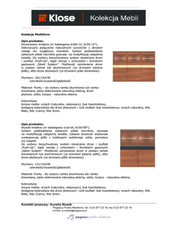 informacja prasowa Kolekcja Multiform Opis produktu: Nowoczesny kredens (nr katalogowy 6160-12, 6150-12*). Dekoracyjne połączenie naturalnych surowców z akrylem nadaje mu wyjątkowy charakter. System podświetlania szklanych półek microline pozwala na modyfikację natężenia światła. Do wyboru bezuchwytowy system otwierania drzwi i szuflad „Push-Up”, bądź wersja z uchwytami i tłumikami gazowymi „Silent System”. Możliwość zamówienia drzwi w postaci ramek lub aluminiowych (za drzwiami szklane półki), albo drzwi płytowych (za drzwiami półki drewniane). Wymiary: 181/142/40 szerokość/wysokość/głębokość Materiał: fronty – do wyboru ramka aluminiowa lub ramka drewniana, płyta okleinowana naturalną okleiną, drzwi płytowe, szkło; korpus - naturalna okleina. Kolorystyka: korpus mebla: orzech (naturalny, olejowany), buk twardzielowy, dostępna kolorystyka dla drzwi płytowych i czół szuflad: buk twardzielowy, orzech naturalny, RAL Biały, RAL Czarny, RAL Krem. Opis produktu: Wysoki kredens (nr katalogowy 6160-09, 6150-09*). System podświetlania szklanych półek microline, pozwala na modyfikację natężenia światła. Szklane drzwiczki doskonale wyeksponują półki z kolekcjami ozdobnego szkła, porcelany czy książek. Do wyboru bezuchwytowy system otwierania drzwi i szuflad „Push-Up”, bądź wersja z uchwytami i tłumikami gazowymi „Silent System”. Możliwość zamówienia drzwi w postaci ramek drewnianych lub aluminiowych (za drzwiami szklane półki), albo drzwi płytowych (za drzwiami półki drewniane). Wymiary: 121/142/40 szerokość/wysokość/głębokość Materiał: fronty - do wyboru ramka aluminiowa lub ramka drewniana, płyta okleinowana naturalną okleiną, szkło; korpus - naturalna okleina. Kolorystyka: korpus mebla: orzech (naturalny, olejowany), buk twardzielowy, dostępna kolorystyka dla drzwi płytowych i czół szuflad: buk twardzielowy, orzech naturalny, RAL Biały, RAL Czarny, RAL Krem. Kontakt prasowy: Aurelia Nowik Pegasus Public Relations, tel. 0-22 877 22 18, fax 0-22 877 22 19 e-mail: [email protected] informacja prasowa Opis produktu: Niska komoda TV (nr katalogowy 6160-51, 6150-51*). Dostawka do komody (nr katalogowy 6160-69, 6150-69*). Dostawka do komody pozwala na funkcjonalną kompozycję mebli wokół telewizora. Lekka forma bryły stanowi dopełnienie prostej linii komody nadając całości oryginalnego charakteru. Do wyboru bezuchwytowy system otwierania szuflad „PushUp”, bądź wersja z uchwytami i tłumikami gazowymi „Silent System”. Wymiary komody: 121/38/54 szerokość/wysokość/głębokość Wymiary dostawki do komody: 241/49/30 szerokość/wysokość/głębokość Materiał: fronty - płyta okleinowana naturalną okleiną; korpus - naturalna okleina, Kolorystyka: korpus mebla: orzech (naturalny, olejowany), buk twardzielowy, dostępna kolorystyka dla czół szuflad: buk twardzielowy, orzech naturalny, RAL Biały, RAL Czarny, RAL Krem. Opis produktu: Witryna wisząca (nr katalogowy 6160-03, 6150-03*). Możliwość zamówienia drzwi w postaci ramek drewnianych lub aluminiowych (za drzwiami szklane półki), albo drzwi płytowych (za drzwiami półki drewniane). Do wyboru bezuchwytowy system otwierania drzwi „Push-Up”, bądź wersja z uchwytami i tłumikami gazowymi „Silent System”. Wymiary: 121/127/30 szerokość/wysokość/głębokość Materiał: fronty - do wyboru ramka aluminiowa lub ramka drewniana, płyta okleinowana naturalną okleiną, szkło; korpus - naturalna okleina. Kolorystyka: korpus mebla: orzech (naturalny, olejowany), buk twardzielowy, dostępna kolorystyka dla drzwi płytowych: buk twardzielowy, orzech naturalny, RAL Biały, RAL Czarny, RAL Krem. Kontakt prasowy: Aurelia Nowik Pegasus Public Relations, tel. 0-22 877 22 18, fax 0-22 877 22 19 e-mail: [email protected] informacja prasowa Opis produktu: Kredens podwieszany (nr katalogowy 6160-36, 6150-36*). Fronty szuflad pokryte akrylowym tworzywem oryginalnie połączone z drewnianymi drzwiczkami. Zastosowany system do podwieszania umożliwia ekspozycję bryły kredensu w niebanalny sposób. Możliwość zamówienia drzwi w postaci ramek drewnianych lub aluminiowych (za drzwiami szklane półki), albo drzwi płytowych (za drzwiami półki drewniane). Do wyboru bezuchwytowy system otwierania drzwi „Push-Up”, bądź wersja z uchwytami i tłumikami gazowymi „Silent System”. Wymiary: 241/67/40 szerokość/wysokość/głębokość Materiał: fronty - do wyboru ramka aluminiowa lub ramka drewniana, płyta okleinowana naturalną okleiną, korpus - naturalna okleina. Kolorystyka: korpus mebla: orzech (naturalny, olejowany), buk twardzielowy, dostępna kolorystyka dla drzwi płytowych i czół szuflad: buk twardzielowy, orzech naturalny, RAL Biały, RAL Czarny, RAL Krem. Opis produktu: Niski kredens (nr katalogowy 6160-33, 6150-33*). Eklektyczne połączenie drewnianych frontów drzwi z akrylem nadaje bryle oryginalnego charakteru. Możliwość zamówienia drzwi w postaci ramek drewnianych lub aluminiowych (za drzwiami szklane półki), albo drzwi płytowych (za drzwiami półki drewniane). Do wyboru bezuchwytowy system otwierania drzwi „PushUp”, bądź wersja z uchwytami i tłumikami gazowymi „Silent System”. Wymiary: 241/69/40 szerokość/wysokość/głębokość Materiał: fronty - do wyboru ramka aluminiowa lub ramka drewniana, płyta okleinowana naturalną okleiną, korpus naturalna okleina. Kolorystyka: korpus mebla: orzech (naturalny, olejowany), buk twardzielowy, dostępna kolorystyka dla drzwi płytowych i czół szuflad: buk twardzielowy, orzech naturalny, RAL Biały, RAL Czarny, RAL Krem. Kontakt prasowy: Aurelia Nowik Pegasus Public Relations, tel. 0-22 877 22 18, fax 0-22 877 22 19 e-mail: [email protected] informacja prasowa Opis produktu: Kredens (nr katalogowy 6160-42, 6150-42*). Nowoczesność i elegancja formy. Fronty szuflad pokryte akrylowym tworzywem oryginalnie połączone z drewnianymi drz