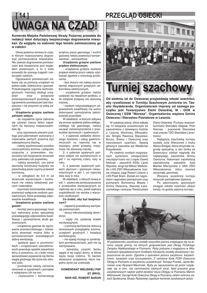 [ 14 ] PRZEGLĄD OSIECKI UWAGA NA CZAD! Komenda Miejska Państwowej Straży Pożarnej przesłała do redakcji tekst dotyczący bezpiecznego dogrzewania mieszkań. Ze względu na ważność tego tematu zamieszczamy go w całości. Okres jesienno-zimowy to czas, w którym rozpoczynamy dogrzewać pomieszczenia mieszkalne. Nie zawsze dogrzewanie pomieszczeń jest bezpieczne pod względem pożarowym, a to z kolei prowadzi do szeregu tragedii i nieszczęść ludzkich. Ogrzewanie pomieszczeń odbywa się za pomocą urządzeń na paliwo stałe, elektryczne i gazowe. Przestrzeganie rygorów technologicznych, instrukcji obsługi urządzeń oraz przepisów przeciwpożarowych powoduje, że ogrzewanie pomieszczeń jest bezpieczne i nie przynosi za sobą zagrożeń. Urządzenia grzejne zasilane paliwem stałym: - do rozpalenia ognia zabrania się używać cieczy łatwo zapalnych, np. benzyny, rozpuszczalników itp. - przy ogrzewaniu piecami podłoga pod paleniskiem wykonana z materiałów palnych powinna być zabezpieczona blachą, - należy wyeliminować wszelkie nieszczelności komina i połączeń czopucha z przewodem, nieszczelne lub niesprawne drzwiczki przy palenisku lub popielniku, - należy sprawdzić, czy palne elementy konstrukcji budynku nie przechodzą przez czynny przewód kominowy, - w odległości do 0,5 m od drzwiczek wycierowych i kontrolnych nie należy składować palnych materiałów, - czynności kominiarskie należy powierzyć wyłącznie osobom upoważnionym, które posiadają odpowiednie kwalifikacje. Urządzenia grzejne zasilane gazem: - montaż pieca gazowego musi być wykonany przez specjalistę posiadającego odpowiednie kwalifikacje i upoważnienia służb gazowniczych, - urządzenia gazowe do ogrzewania promiennikowego i oświetlenia stosować można tylko w pomieszczeniach posiadających dobrą wentylację, - spalanie gazu w promiennikach i urządzeniach oświetleniowych powoduje spadek zawartości tlenu w powietrzu, co z kolei może spowodować pojawienie się tlenku węgla groźnego dla życia lub zdrowia ludzi, - promienniki należy ostrożnie stosować w sypialniach i pamiętać o wyłączeniu ich na noc, - czyszczenie i konserwację wnętrza pieca gazowego i kuchni gazowej należy powierzyć konserwantowi - serwisantowi. Urządzenia grzejne zasilane prądem elektrycznym. - urządzenia grzejne zasilane prądem elektrycznym należy użytkować zgodnie z instrukcją producenta, - bez dozoru nie należy pozostawiać włączonych grzejnych odbiorników elektrycznych, - urządzenia grzejne należy ustawiać na niepalnym podłożu, o ile odrębne przepisy nie stanowią inaczej, - osobom nieposiadającym odpowiednich kwalifikacji nie wolno dokonywać samodzielnie jakichkolwiek przeróbek. W obiektach, w których odbywa się proces spalania paliwa stałego, ciekłego lub gazowego, należy usuwać zanieczyszczenia z przewodów dymowych i spalinowych: 1. z palenisk zakładów zbiorowego żywienia i usług gastronomicznych co najmniej raz w miesiącu, jeżeli przepisy miejscowe nie stanowią inaczej, 2. z palenisk opalanych paliwem stałym nie wymienionych w pkt 1 co najmniej cztery razy w roku, 3. z palenisk opalanych paliwem płynnym i gazowym niewymienionych w pkt 1. co najmniej dwa razy w roku. W obiektach, o których mowa w ust. 1. usuwa się zanieczyszczenia z przewodów wentylacyjnych co najmniej raz w roku, jeżeli większa częstotliwość nie wynika z warunków użytkowych. Co zrobić, aby być bezpiecznym? - zapewnij prawidłową wentylację pomieszczeń, - stosuj mikrowentylację okien i drzwi, - nigdy nie zasłaniaj kratek wentylacyjnych, - z pomocą fachowców dokonuj okresowych przeglądów komina, urządzeń grzejnych i instalacji wentylacyjnej, - nie spalaj niczego w zamkniętych pomieszczeniach, jeśli nie są wentylowane, - zainstaluj czujniki tlenku węgla w tej części domu, w której sypia twoja rodzina. To bardzo skuteczne urządzenia, które niejedno życie już uratowały. KOMENDANT MIEJSKIEJ PSP ST. BRYG. MGR INŻ. ROBERT BARAN Turniej szachowy Od siedmiu lat do Osiecznej przyjeżdżają młodzi szachiści, aby Turnieju Szachowym Juniorów Tasb rywalizować li ćwT i j S h J i ó iim. T silo Heydebranda. Organizatorem imprezy od samego początku jest Towarzystwo Ziemi Osieckiej, M - GOK w Osiecznej i SSM "Morena". Organizatorów wspiera Gmina Osieczna i Starostwo Powiatowe w Lesznie. W ostatniej edycji, która odbyła się 14 listopada uczestniczyło 44 zawodników z dziewięciu klubów z: Leszna, Wschowy, Włoszakowic, Śmigla, Rawicza, Stęszewa, Bucza, Śremu i Osiecznej oraz niezrzeszeni szachiści. Sędzią głównym zawodów był Waldemar Kopydłowski. Po siedmiu rundach rozgrywanych systemem szwajcarskim zwyciężył trzeci raz z rzędu Dawid Niekraś - zawodnik ASSz Lipno Stęszew, drugi był Miłosz Walkowski z KS ZSO Włoszakowice, trzecie miejsce zajął Robert Lisiecki z LKS Piast Śrem. Zostali oni nagrodzeni nagrodami pieniężnymi oraz pucharami Burmistrza Miasta i Gminy Osieczna, Starosty Leszczyńskiego i prezesa Towarzystwa Ziemi Osieckiej. Puchary wręczyli: burmistrz Stanisław Glapiak, Piotr Giernas - pracownik Starostwa oraz prezes TZO Stanisław Lenartowicz. Najlepszą szachistką turnieju została Julia Wieczorek z klubu Wieża Śmigiel, która otrzymała nagrodę specjalną, a Jan Dutka ze Świerczyny zdobył nagrodę dla najlepszego zawodnika Gminy Osieczna. Natomiast najmłodszą zawodniczką zawodów była Blanka Mierzyńska z UKS ZSO Włoszakowice, która również otrzymała upominek. Wszyscy uczestnicy turnieju otrzymali pamiątkowe dyplomy. Po zakończeniu sportowych zmagań młodzi szachiści złożyli kwiaty na grobie patrona turnieju. W październiku zarybione zostały wszystkie jeziora znajdujące się na terenie naszej gminy, na których gospodarzem jest Okręg Polskiego Związku Wędkarskiego w Poznaniu. Ryby pobrane z magazynu w Wojnowicach specjalistycznymi środkami transportu zostały dowiezione i wypuszczone 