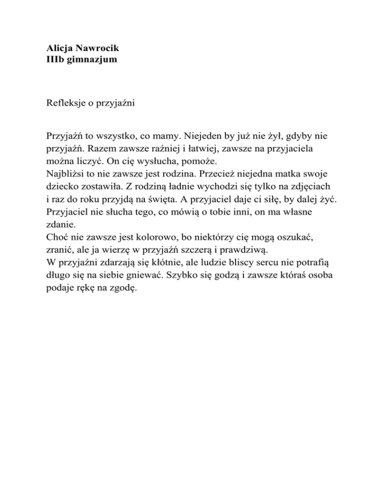 Alicja Nawrocik IIIb gimnazjum Refleksje o przyjaźni Przyjaźń to wszystko, co mamy. Niejeden by już nie żył, gdyby nie przyjaźń. Razem zawsze raźniej i łatwiej, zawsze na przyjaciela można liczyć. On cię wysłucha, pomoże. Najbliżsi to nie zawsze jest rodzina. Przecież niejedna matka swoje dziecko zostawiła. Z rodziną ładnie wychodzi się tylko na zdjęciach i raz do roku przyjdą na święta. A przyjaciel daje ci siłę, by dalej żyć. Przyjaciel nie słucha tego, co mówią o tobie inni, on ma własne zdanie. Choć nie zawsze jest kolorowo, bo niektórzy cię mogą oszukać, zranić, ale ja wierzę w przyjaźń szczerą i prawdziwą. W przyjaźni zdarzają się kłótnie, ale ludzie bliscy sercu nie potrafią długo się na siebie gniewać. Szybko się godzą i zawsze któraś osoba podaje rękę na zgodę.