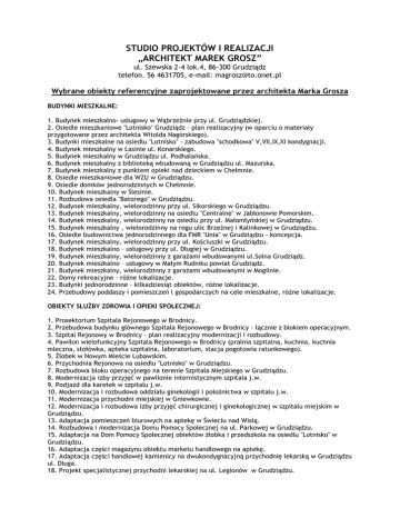 STUDIO PROJEKTÓW I REALIZACJI „ARCHITEKT MAREK GROSZ” ul. Szewska 2-4 lok.4, 86-300 Grudziądz telefon. 56 4631705, e-mail: [email protected] Wybrane obiekty referencyjne zaprojektowane przez architekta Marka Grosza BUDYNKI MIESZKALNE: 1. Budynek mieszkalno- usługowy w Wąbrzeźnie przy ul. Grudziądzkiej. 2. Osiedle mieszkaniowe "Lotnisko" Grudziądz - plan realizacyjny (w oparciu o materiały przygotowane przez architekta Witolda Nagórskiego). 3. Budynki mieszkalne na osiedlu "Lotnisko" - zabudowa "schodkowa" V,VII,IX,XI kondygnacji. 4. Budynek mieszkalny w Łasinie ul. Konarskiego. 5. Budynek mieszkalny w Grudziądzu ul. Podhalańska. 6. Budynek mieszkalny z biblioteką wbudowaną w Grudziądzu ul. Mazurska. 7. Budynek mieszkalny z punktem opieki nad dzieckiem w Chełmnie. 8. Osiedle mieszkaniowe dla WZU w Grudziądzu. 9. Osiedle domków jednorodzinnych w Chełmnie. 10. Budynek mieszkalny w Ślesinie. 11. Rozbudowa osiedla "Batorego" w Grudziądzu. 12. Budynek mieszkalny, wielorodzinny przy ul. Sikorskiego w Grudziądzu. 13. Budynek mieszkalny, wielorodzinny na osiedlu "Centralne" w Jabłonowie Pomorskim. 14. Budynek mieszkalny, wielorodzinny na osiedlu przy ul. Małomłyńskiej w Grudziądzu. 15. Budynek mieszkalny , wielorodzinny na rogu ulic Brzeźnej i Kalinkowej w Grudziądzu. 16. Osiedle budownictwa jednorodzinnego dla FMR "Unia" w Grudziądzu - koncepcja. 17. Budynek mieszkalny, wielorodzinny przy ul. Kościuszki w Grudziądzu. 18. Budynek mieszkalno – usługowy przy ul. Długiej w Grudziądzu. 19. Budynek mieszkalny, wielorodzinny z garażami wbudowanymi ul.Solna Grudziądz. 20. Budynek mieszkalno – usługowy w Małym Rudniku powiat Grudziądz. 21. Budynek mieszkalny, wielorodzinny z garażami wbudowanymi w Mogilnie. 22. Domy rekreacyjne - różne lokalizacje. 23. Budynki jednorodzinne - kilkadziesiąt obiektów, różne lokalizacje. 24. Przebudowy poddaszy i pomieszczeń l gospodarczych na cele mieszkalne, różne lokalizacje. OBIEKTY SŁUŻBY ZDROWIA I OPIEKI SPOŁECZNEJ: 1. Prosektorium Szpitala Rejonowego w Brodnicy. 2. Przebudowa budynku głównego Szpitala Rejonowego w Brodnicy - łącznie z blokiem operacyjnym. 3. Szpital Rejonowy w Brodnicy - plan realizacyjny modernizacji i rozbudowy. 4. Pawilon wielofunkcyjny Szpitala Rejonowego w Brodnicy (pralnia szpitalna, kuchnia, kuchnia mleczna, stołówka, apteka szpitalna, laboratorium, stacja pogotowia ratunkowego). 5. Żłobek w Nowym Mieście Lubawskim. 6. Przychodnia Rejonowa na osiedlu "Lotnisko" w Grudziądzu. 7. Rozbudowa bloku operacyjnego na terenie Szpitala Miejskiego w Grudziądzu. 8. Modernizacja izby przyjęć w pawilonie internistycznym szpitala j.w. 9. Podjazd dla karetek w szpitalu j.w. 10. Modernizacja i rozbudowa oddziału ginekologii i położnictwa w szpitalu j.w. 11. Modernizacja przychodni miejskiej w Gniewkowie. 12. Modernizacja i rozbudowa izby przyjęć chirurgicznej i ginekologicznej w szpitalu miejskim w Grudziądzu. 13. Adaptacja pomieszczeń biurowych na aptekę w Świeciu nad Wisłą. 14. Rozbudowa i modernizacja Domu Pomocy Społecznej na ul. Parkowej w Grudziądzu. 15. Adaptacja na Dom Pomocy Społecznej obiektów żłobka i przedszkola na osiedlu "Lotnisko" w Grudziądzu. 16. Adaptacja części magazynu obiektu marketu handlowego na aptekę. 17. Adaptacja części handlowej kamienicy na dwukondygnacyjną przychodnię lekarską w Grudziądzu ul. Długa. 18. Projekt specjalistycznej przychodni lekarskiej na ul. Legionów w Grudziądzu. 19. Projekt modernizacji bloku operacyjnego na oddziale ginekologii ZK nr 1 w Grudziądzu. 20. Adaptacja części parteru budynku wielorodzinnego na przychodnię weterynaryjną w Grudziądzu ul. Kalinkowa. 21. Budynek przychodni weterynaryjnej w Grudziądzu ul. Łęgi . 22. Apteka wbudowana w obiekt usługowo-handlowy ul. Tęczowa Kwidzyn. 23. Centrum protetyki stomatologicznej ul. M. Curie - Skłodowskiej w Grudziądzu. 24. Przychodnia Specjalistyczna ul. Legionów w Grudziądzu. 25. Ośrodek geotermalny „Marusza” w Grudziądzu. 26. Piramida tężniowa ul. Warszawska w Grudziądzu. 27. Chirurgia Jednego Dnia ul. Legionów 57 w Grudziądzu. 28. Apteka w Gminnym Centrum Usługowym w Łysomicach. 29. Rozbudowa i modernizacja Szpitala Powiatowego w Chełmży. 30. Przychodnia weterynaryjna ul. Kustronia Grudziądz. BUDYNKI OŚWIATY: l. Szkoła podstawowa z pływalnią, salą gimnastyczną i budynkami mieszkalnym dla nauczycieli w Górznie - koncepcja. 2. Rozbudowa szkoły podstawowej w Osiu, powiat Świecie o salę gimnastyczną, hall wejściowy i trzy sale do nauki. 3. Rozbudowa i modernizacja szkoły podstawowej w Nicwałdzie , gmina Gruta, powiat Grudziądz. 4. Modernizacja i rozbudowa budynku dawnej Przychodni Gminnej w Grucie (po adaptacji przychodnia, apteka , mieszkania dla lekarzy i segment szkolny). 5. Rozbudowa i modernizacja szkoły podstawowej w Boguszewie, gmina Gruta, powiat Grudziądz. 6. Szkoła Podstawowa z basenem i salą gimnastyczną na osiedlu "Lotnisko" w Grudziądzu. 7. Szkoła podstawowa z salą sportowo - widowiskową w Karnkowie, powiat Lipno. 8. Gimnazjum z salą sportowo – widowiskową w Jabłonowie Pomorskim. OBIEKTY SPORTU i REKREACJI: 1. Osada Młodzieży Spółdzielczej "GRUD" w Grudziądzu - kompleks sportowo - rekreacyjny. 2. Trybuny stadionu miejskiego w Jabłonowie Pomorskim. 3. Centrum rekreacyjno – rozrywkowe w miejscowości Marusza powiat Grudziądz – koncepcja programowo – urbanistyczna. 4. Centrum rekreacyjno – kongresowe (pole golfowe z domem klubowym, hotelem, restauracją, salami konferencyjnymi itp.) w Pokrzywnie powiat Grudziądz – koncepcja programowo urbanistyczna. 5. Centrum Rozrywki dla dzieci „Boboland” w Bydgoszczy. 6. Sala gimnastyczna z trybunami w gimnazjum w Jabłonowie Pom. 7. Rozbudowa szkoły w Osiu woj. Kujawsko-Pomorskie – koncepcja. OBIEKTY KULTURY: 1. Muzeum Obrony Przeciwlotniczej na terenie WSWOP w Koszalinie (współautorstwo). 2. Przebudowa i modernizacja pomieszczeń f