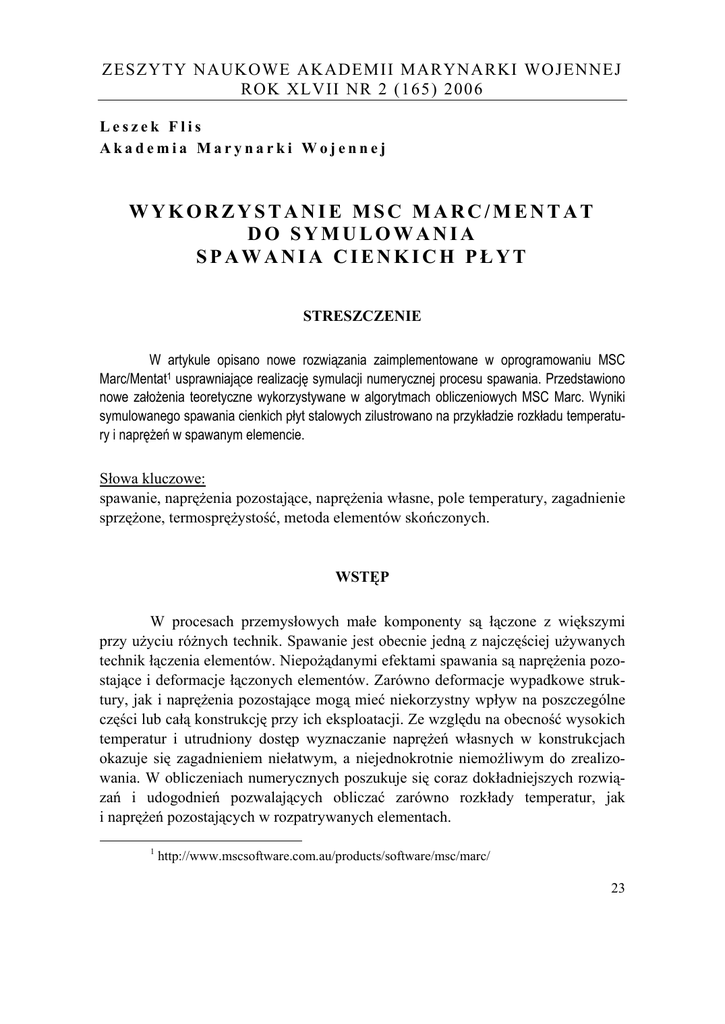 ZESZYTY NAUKOWE AKADEMII MARYNARKI WOJENNEJ ROK XLVII NR 2 (165) 2006 Leszek Flis Akademia Marynarki Wojennej WYKORZYSTANIE MSC MARC/MENTAT DO SYMULOWANIA SPAWANIA CIENKICH PŁYT STRESZCZENIE W artykule opisano nowe rozwiązania zaimplementowane w oprogramowaniu MSC Marc/Mentat1 usprawniające realizację symulacji numerycznej procesu spawania. Przedstawiono nowe założenia teoretyczne wykorzystywane w algorytmach obliczeniowych MSC Marc. Wyniki symulowanego spawania cienkich płyt stalowych zilustrowano na przykładzie rozkładu temperatury i naprężeń w spawanym elemencie. Słowa kluczowe: spawanie, naprężenia pozostające, naprężenia własne, pole temperatury, zagadnienie sprzężone, termosprężystość, metoda elementów skończonych. WSTĘP W procesach przemysłowych małe komponenty są łączone z większymi przy użyciu różnych technik. Spawanie jest obecnie jedną z najczęściej używanych technik łączenia elementów. Niepożądanymi efektami spawania są naprężenia pozostające i deformacje łączonych elementów. Zarówno deformacje wypadkowe struktury, jak i naprężenia pozostające mogą mieć niekorzystny wpływ na poszczególne części lub całą konstrukcję przy ich eksploatacji. Ze względu na obecność wysokich temperatur i utrudniony dostęp wyznaczanie naprężeń własnych w konstrukcjach okazuje się zagadnieniem niełatwym, a niejednokrotnie niemożliwym do zrealizowania. W obliczeniach numerycznych poszukuje się coraz dokładniejszych rozwiązań i udogodnień pozwalających obliczać zarówno rozkłady temperatur, jak i naprężeń pozostających w rozpatrywanych elementach. 1 http://www.mscsoftware.com.au/products/software/msc/marc/ 23 Leszek Flis Analiza metodą elementów skończonych procesów spawania była jak dotąd przedmiotem wielu badań. W MSC Marc wymagało to zastosowania specjalizowanych procedur użytkownika. Procedury takie zorientowane na problem wymagały wygenerowania skomplikowanego kodu, aby poradzić sobie z modelowaniem materiału spoiny, złożonymi ścieżkami spawania itp. Aby ułatwić symulację spawania, w preprocesorze MSC Mentat zaimplementowano kilka udogodnień, które przedstawiono w artykule na przykładzie symulacji spawania cienkich płyt. NOWE MOŻLIWOŚCI I UDOGODNIENIA SYMULACJI PROCESU SPAWANIA W MSC MARC W MSC Marc 2005 dokonano wielu udogodnień w celu prowadzenia efektywnej symulacji procesu spawania. Najważniejsze elementy wspomagające symulację to: 1. Standardowe źródło ciepła zamodelowane jako dysk (dla powierzchni) lub podwójna elipsoida (dla objętości) bezpośrednio w opcji WELD FLUX. Użytkownik może zastosować podprogram UWELDFLUX do zamodelowania arbitralnego źródła ciepła. 2. Liczne opcje dostępne do opisania ruchu źródła ciepła. Opcja WELD PATH służy do orientacji łuku elektrody wzdłuż ścieżki spawania. Użytkownik może zastosować podprogram UWELDPATH do opisania arbitralnej ścieżki spawania. 3. Zautomatyzowane wypełnianie miejsca spawania materiałem spoiny. Tworzenie adekwatnych warunków brzegowych na granicy spawania umożliwia opcja WELD FILL. Specjalne opcje zostały zaimplementowane, aby ułatwić modelowanie spawania kilkoma przejściami. Dodatkowo dostępne są następujące funkcje: 1. Obliczenia jedno- i wieloprocesorowe. 2. Obydwie metody obliczeń ze stałym (TRANSIENT NON AUTO) i adaptacyjnym krokiem czasowym (AUTO STEP). 3. Spawanie można modelować dla zadań płaskich 2-D, płyt, osiowej symetrii, continuum 3-D. Mogą być prowadzone analizy cieplne i cieplno-mechaniczne. 4. Dostępna jest lokalna adaptacja siatki elementów skończonych w obszarze spawania. Zdolność zgrubnego wykańczania siatki MES po ustaniu źródła ciepła także jest dostępna. 24 Zeszyty Naukowe AMW Wykorzystanie MSC Marc/Mentat do symulowania spawania cienkich płyt ZAŁOŻENIA TEORETYCZNE Spawanie jest procesem cieplnym, w którym uwzględnia się szczególne warunki graniczne. Warunki brzegowo-początkowe można zadawać, wykorzystując opcję WELD FLUX w połączeniu z procedurami WELD PATH i WELD FILL. Użycie powyższych opcji umożliwia zastosowanie dwóch różnych technik do symulowania przebiegu spawania: 1. Modelowanie źródła ciepła spawania poprzez podanie jego mocy przy wykorzystaniu opcji WELD FLUX. Temperatury topnienia lub inne temperatury w punktach kontrolnych nie są wyszczególniane w opcji WELD FILL dla materiału spoiny ani dla żadnego innego materiału. 2. Modelowanie źródła ciepła poprzez podanie temperatury topnienia materiału spoiny w opcji WELD FILL lub innych temperatur kontrolnych. Moc źródła ciepła nie występuje. Możliwa jest również kombinacja powyższych przypadków. Dla obu metod ścieżka źródła ciepła jest określana opcją WELD PATH. Moc źródła ciepła Rozkład źródła ciepła w postaci dysku w zadaniach i dla „modeli płaskich” oraz w formie podwójnej elipsoidy w zadaniach i dla „modeli przestrzennych” można określić w opcji WELD FLUX. Dla bardziej złożonych rozkładów źródeł ciepła można użyć procedury użytkownika UWELDFLUX. Kształt dysku proponowanego przez V. Pavelica dla rozkładu źródła ciepła i adekwatnego do obszaru działania tzw. „jeziorka” ciekłego metalu jest wyrażony zgodnie z (1) (rys. 1.) [3]: q( x, y , z ) = gdzie: q − 3x 2 − 3z 2 3Q 2 , exp exp r2 r πr 2 (1) – ciepło spawania dostarczane na jednostkę powierzchni [J/(sm2)]; Q = ηUI – wytwarzana moc łuku elektrycznego w [J/s] przy sprawności łuku elektrycznego η , napięciu U [V] i natężeniu prądu I [A]; r z x 2 (165) 2006 – promień dysku; – współrzędna lokalna określona wzdłuż ścieżki spawania; – współrzędna lokalna określona wzdłuż prostopadłej do ścieżki spawania. 25 Leszek Flis Rozkład źródła ciepła modelowany jako dysk może być użyty w zadaniach 2-D i 3-D, gdzie głębokość penetracji ciepła spawania jest pomijana. Rys. 1. Rozkład źródła cie