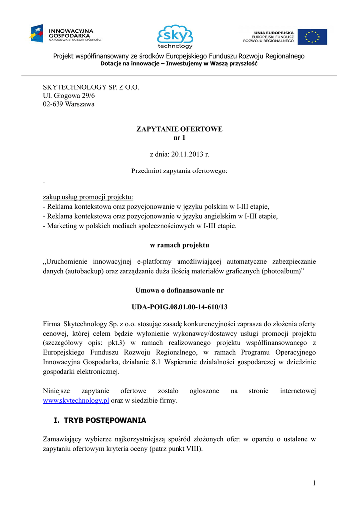 Projekt współfinansowany ze środków Europejskiego Funduszu Rozwoju Regionalnego Dotacje na innowacje – Inwestujemy w Waszą przyszłość SKYTECHNOLOGY SP. Z O.O. Ul. Głogowa 29/6 02-639 Warszawa ZAPYTANIE OFERTOWE nr 1 z dnia: 20.11.2013 r. Przedmiot zapytania ofertowego: zakup usług promocji projektu: - Reklama kontekstowa oraz pozycjonowanie w języku polskim w I-III etapie, - Reklama kontekstowa oraz pozycjonowanie w języku angielskim w I-III etapie, - Marketing w polskich mediach społecznościowych w I-III etapie. w ramach projektu „Uruchomienie innowacyjnej e-platformy umożliwiającej automatyczne zabezpieczanie danych (autobackup) oraz zarządzanie duża ilością materiałów graficznych (photoalbum)” Umowa o dofinansowanie nr UDA-POIG.08.01.00-14-610/13 Firma Skytechnology Sp. z o.o. stosując zasadę konkurencyjności zaprasza do złożenia oferty cenowej, której celem będzie wyłonienie wykonawcy/dostawcy usługi promocji projektu (szczegółowy opis: pkt.3) w ramach realizowanego projektu współfinansowanego z Europejskiego Funduszu Rozwoju Regionalnego, w ramach Programu Operacyjnego Innowacyjna Gospodarka, działanie 8.1 Wspieranie działalności gospodarczej w dziedzinie gospodarki elektronicznej. Niniejsze zapytanie ofertowe zostało www.skytechnology.pl oraz w siedzibie firmy. ogłoszone na stronie internetowej I. TRYB POSTĘPOWANIA Zamawiający wybierze najkorzystniejszą spośród złożonych ofert w oparciu o ustalone w zapytaniu ofertowym kryteria oceny (patrz punkt VIII). 1 Projekt współfinansowany ze środków Europejskiego Funduszu Rozwoju Regionalnego Dotacje na innowacje – Inwestujemy w Waszą przyszłość II. INFORMACJE O ZAMAWIAJĄCYM SKYTECHNOLOGY SP. Z O.O. Ul. Głogowa 29/6 02-639 Warszawa NIP: 5213633370 REGON: 146200533 KRS: 0000426381 III.OPIS PRZEDMIOTU ZAPYTANIA OFERTOWEGO zakup usług promocji projektu: 1. Reklama kontekstowa oraz pozycjonowanie w jez. polskim: - SEO - pozycjonowanie serwisu prowadzenie stałych działań zmierzających do osiągniecia satysfakcjonujących i wysokich wyników obecności serwisu wśród wyników najważniejszych wyszukiwarek internetowych, w szczególności Google, - SEM (wybrane frazy kluczowe). 2. Reklama kontekstowa oraz pozycjonowanie w jez. angielskim: - SEO - pozycjonowanie serwisu prowadzenie stałych działań zmierzających do osiągniecia satysfakcjonujących i wysokich wyników obecności serwisu wśród wyników najważniejszych wyszukiwarek internetowych, w szczególności Google, - SEM (wybrane frazy kluczowe). 3. Marketing w polskich mediach społecznosciowych: - działania w mediach społecznościach, profil na portalu Facebook, promocja e-usług wśród odbiorców indywidualnych, - działania e-PR oraz marketing wirusowy, - niestandardowe kampanie promocyjne prowadzone wspólnie z partnerami biznesowymi promocje, okazje itp. IV. TERMIN WYKONANIA PRZEDMIOTU ZAPYTANIA OFERTOWEGO Realizacja usługi powinna nastąpić w trzech etapach określonych terminami. Etap I: od dnia podpisania umowy z wykonawcą do dnia 31.01.2014r. zostaną wykonane / dostarczone wyszczególnione zadania: - Reklama kontekstowa oraz pozycjonowanie w języku polskim, - Reklama kontekstowa oraz pozycjonowanie w języku angielskim, - Marketing w polskich mediach społecznościowych. 2 Projekt współfinansowany ze środków Europejskiego Funduszu Rozwoju Regionalnego Dotacje na innowacje – Inwestujemy w Waszą przyszłość Etap II: 01.02.2014 do 31.05.2014r. zostaną wykonane / dostarczone wyszczególnione zadania: - Reklama kontekstowa oraz pozycjonowanie w języku polskim, - Reklama kontekstowa oraz pozycjonowanie w języku angielskim, - Marketing w polskich mediach społecznościowych. Etap III: od 01.06.2014r. do 31.10.2014r. zostaną wykonane / dostarczone wyszczególnione zadania: - Reklama kontekstowa oraz pozycjonowanie w języku polskim, - Reklama kontekstowa oraz pozycjonowanie w języku angielskim, - Marketing w polskich mediach społecznościowych. V. WYMAGANIA DOT. WYKONAWCY Wykonawca musi posiadać doświadczenie w prowadzeniu działań promocyjnych w kanale internetowym. VI.INNE ISTOTNE WARUNKI ZAPYTANIA OFERTOWEGO − Powyższe zapytanie ofertowe nie stanowi oferty zawarcia umowy ani też oferty prowadzenia negocjacji w tym celu i jest skierowane do wielu adresatów. − Zamawiający zastrzega sobie prawo do nieskorzystania z otrzymanej oferty bez podania przyczyny oraz do wystąpienia z zapytaniem dotyczącym dodatkowych informacji, dokumentów lub wyjaśnień. − W przypadku zakwalifikowania do dalszego postępowania, wybrany Wykonawca zostanie powiadomiony indywidualnie. − Z Wykonawcą, którego oferta zostanie wybrana jako najkorzystniejsza zostanie podpisana umowa pomiędzy nim a Zamawiającym w uzgodnionym przez strony terminie. − Zamawiający nie dopuszcza składania ofert częściowych. VII. PRZYGOTOWANIE OFERTY Wykonawca, który posiada możliwość wykonania/dostarczenia odpowiednio usługi zgodnie z opisem pkt.3 i jest zainteresowany realizacją zamówienia, powinien przygotować i złożyć do zamawiającego ofertę wg formularza ofertowego stanowiącego załącznik do niniejszego zapytania. Oferta powinna zawierać: a. b. c. d. e. Dane teleadresowe oferenta Datę sporządzenia oferty Cenę netto, kwotę VAT i cenę brutto Termin realizacji Termin ważności oferty 3 Projekt współfinansowany ze środków Europejskiego Funduszu Rozwoju Regionalnego Dotacje na innowacje – Inwestujemy w Waszą przyszłość f. Czytelny podpis wykonawcy wraz z pieczątką. Termin związania ofertą powinien wynosić nie mniej niż 60 dni od dnia upływu terminu składania ofert. VIII. KRYTERIUM OCENY OFERT Kryterium Waga (%) Cena 80% Doświadczenie 20% Punktacja 10 pkt – najniższa cena 8 pkt – druga najniższa cena 6 pkt – trzecia najniższa cena 4 pkt – pozostałe oferty 10 pkt - posiadanie minimum 2 referencji wystawionych później niż 01.01.2010 r. na przeprowadzenie kampanii int