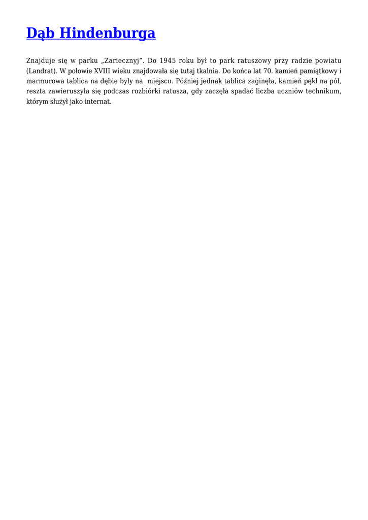 Dąb Hindenburga Znajduje się w parku „Zariecznyj”. Do 1945 roku był to park ratuszowy przy radzie powiatu (Landrat). W połowie XVIII wieku znajdowała się tutaj tkalnia. Do końca lat 70. kamień pamiątkowy i marmurowa tablica na dębie były na miejscu. Później jednak tablica zaginęła, kamień pękł na pół, reszta zawieruszyła się podczas rozbiórki ratusza, gdy zaczęła spadać liczba uczniów technikum, którym służył jako internat.