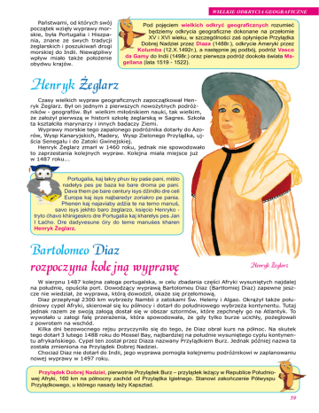 WIELKIE ODKRYCIA GEOGRAFICZNE Państwami, od których swój początek wzięły wyprawy morskie, była Portugalia i Hiszpania, znane ze swych tradycji żeglarskich i poszukiwań drogi morskiej do Indii. Niewątpliwy wpływ miało także położenie obydwu krajów. Pod pojęciem wielkich odkryć geograficznych rozumieć będziemy odkrycia geograficzne dokonane na przełomie XV i XVI wieku, w szczególności zaś opłynięcie Przylądka Dobrej Nadziei przez Diaza (1488r.), odkrycie Ameryki przez Kolumba (12.X.1492r.), a następnie jej podbój, podróż Vasco da Gamy do Indii (1498r.) oraz pierwsza podróż dookoła świata Magellana (lata 1519 - 1522). Henryk Żeglarz Czasy wielkich wypraw geograficznych zapoczątkował Henryk Żeglarz. Był on jednym z pierwszych nowożytnych podróżników - geografów. Był wielkim miłośnikiem nauki, tak wielkim, że założył pierwszą w historii szkołę żeglarską w Sagres. Szkoła ta kształciła marynarzy i innych badaczy Ziemi. Wyprawy morskie tego zapalonego podróżnika dotarły do Azorów, Wysp Kanaryjskich, Madery, Wysp Zielonego Przylądka, ujścia Senegalu i do Zatoki Gwinejskiej. Henryk Żeglarz zmarł w 1460 roku, jednak nie spowodowało to zaprzestania kolejnych wypraw. Kolejna miała miejsce już w 1487 roku... Portugalia, kaj łakry phuv isy paśe pani, miśto nadełys pes pe baza ke bare droma pe pani. Dava them pe bare century isys dźindło dre celi Europa kaj isys najbaredyr zoriakro pe pania. Phenen kaj najaviaby adźia te na terno manuś, savo isys jekhto baro żeglarzo, księcio Henryko tryto ćhavo khinigeskro dre Portugalia kaj kharełys pes Jan I Łaćho. Dre dadyvesune ćiry do terne manuśes kharen Henryk Żeglarz. Bartolomeo Diaz rozpoczyna kolejną wyprawę Henryk Żeglarz W sierpnu 1487 kolejna załoga portugalska, w celu zbadania części Afryki wysuniętych najdalej na południe, opuściła port. Dowodzący wyprawą Bartolomeu Diaz (Bartłomiej Diaz) zapewne jeszcze nie wiedział, że wyprawa, którą dowodził, okaże się przełomową. Diaz przepłynął 2300 km wybrzeży Nambii z zatokami Św. Heleny i Algao. Okrążył także południowy cypel Afryki, skierował się ku północy i dotarł do południowego wybrzeża kontynentu. Tutaj jednak razem ze swoją załogą dostał się w obszar sztormów, które zepchnęły go na Atlantyk. To wywołało u załogi falę przerażenia, która spowodowała, że gdy tylko burze ucichły, pożeglowali z powrotem na wschód. Kilka dni bezowocnego rejsu przyczyniło się do tego, że Diaz obrał kurs na północ. Na skutek tego dotarł 3 lutego 1488 roku do Mossel Bay, najbardziej na południe wysuniętego cyplu kontynentu afrykańskiego. Cypel ten został przez Diaza nazwany Przylądkiem Burz. Jednak później nazwa ta została zmieniona na Przylądek Dobrej Nadziei. Chociaż Diaz nie dotarł do Indii, jego wyprawa pomogła kolejnemu podróżnikowi w zaplanowaniu nowej wyprawy w 1497 roku. Przylądek Dobrej Nadziei, pierwotnie Przylądek Burz – przylądek leżący w Republice Południowej Afryki, 160 km na północny zachód od Przylądka Igielnego. Stanowi zakończenie Półwyspu Przylądkowego, u którego nasady leży Kapsztad. 59