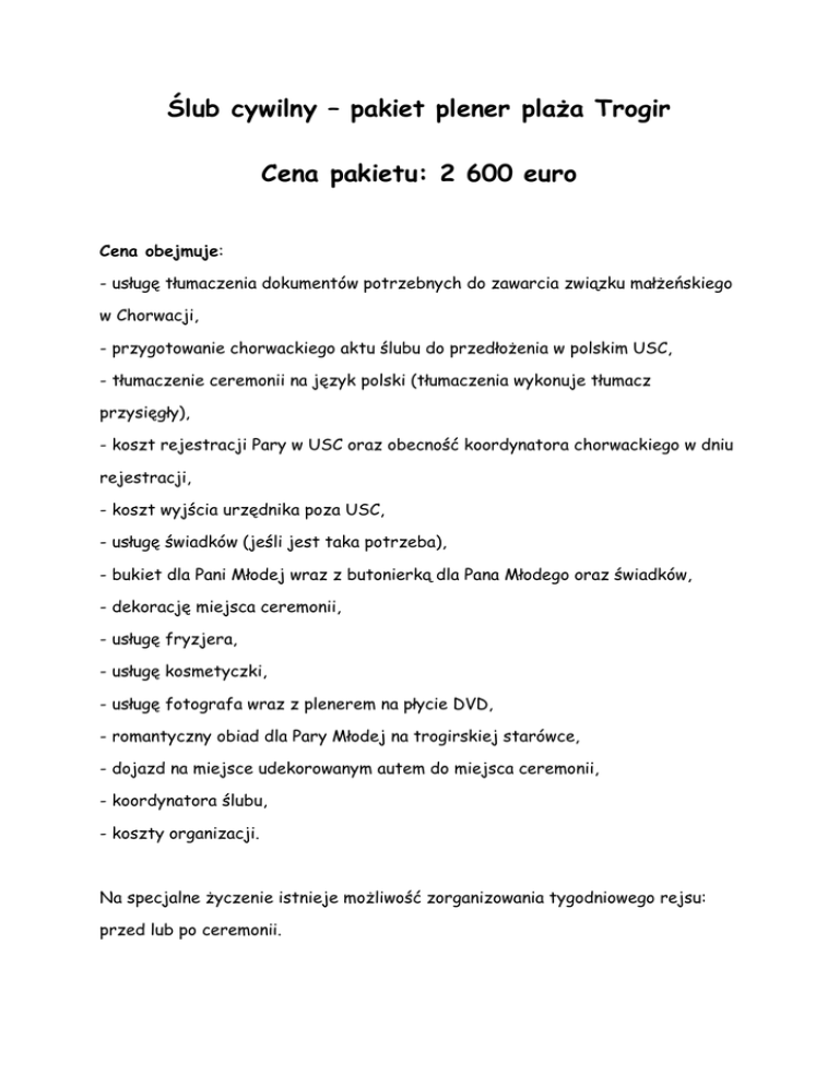 Ślub cywilny – pakiet plener plaża Trogir Cena pakietu: 2 600 euro Cena obejmuje: - usługę tłumaczenia dokumentów potrzebnych do zawarcia związku małżeńskiego w Chorwacji, - przygotowanie chorwackiego aktu ślubu do przedłożenia w polskim USC, - tłumaczenie ceremonii na język polski (tłumaczenia wykonuje tłumacz przysięgły), - koszt rejestracji Pary w USC oraz obecność koordynatora chorwackiego w dniu rejestracji, - koszt wyjścia urzędnika poza USC, - usługę świadków (jeśli jest taka potrzeba), - bukiet dla Pani Młodej wraz z butonierką dla Pana Młodego oraz świadków, - dekorację miejsca ceremonii, - usługę fryzjera, - usługę kosmetyczki, - usługę fotografa wraz z plenerem na płycie DVD, - romantyczny obiad dla Pary Młodej na trogirskiej starówce, - dojazd na miejsce udekorowanym autem do miejsca ceremonii, - koordynatora ślubu, - koszty organizacji. Na specjalne życzenie istnieje możliwość zorganizowania tygodniowego rejsu: przed lub po ceremonii.