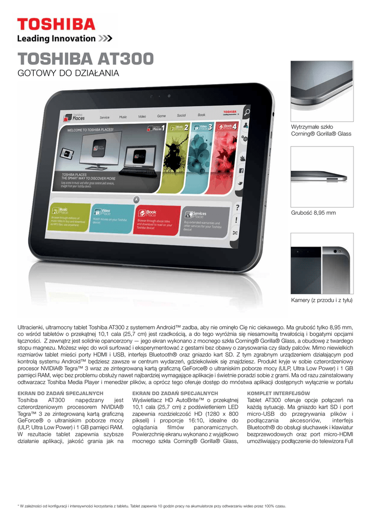 TOSHIBA AT300 GOTOWY DO DZIAŁANIA Wytrzymałe szkło Corning® Gorilla® Glass Grubość 8,95 mm Kamery (z przodu i z tyłu) Ultracienki, ultramocny tablet Toshiba AT300 z systemem Android™ zadba, aby nie ominęło Cię nic ciekawego. Ma grubość tylko 8,95 mm, co wśród tabletów o przekątnej 10,1 cala (25,7 cm) jest rzadkością, a do tego wyróżnia się niesamowitą trwałością i bogatymi opcjami łączności. Z zewnątrz jest solidnie opancerzony — jego ekran wykonano z mocnego szkła Corning® Gorilla® Glass, a obudowę z twardego stopu magnezu. Możesz więc do woli surfować i eksperymentować z gestami bez obawy o zarysowania czy ślady palców. Mimo niewielkich rozmiarów tablet mieści porty HDMI i USB, interfejs Bluetooth® oraz gniazdo kart SD. Z tym zgrabnym urządzeniem działającym pod kontrolą systemu Android™ będziesz zawsze w centrum wydarzeń, gdziekolwiek się znajdziesz. Produkt kryje w sobie czterordzeniowy procesor NVIDIA® Tegra™ 3 wraz ze zintegrowaną kartą graficzną GeForce® o ultraniskim poborze mocy (ULP, Ultra Low Power) i 1 GB pamięci RAM, więc bez problemu obsłuży nawet najbardziej wymagające aplikacje i świetnie poradzi sobie z grami. Ma od razu zainstalowany odtwarzacz Toshiba Media Player i menedżer plików, a oprócz tego oferuje dostęp do mnóstwa aplikacji dostępnych wyłącznie w portalu EKRAN DO ZADAŃ SPECJALNYCH EKRAN DO ZADAŃ SPECJALNYCH KOMPLET INTERFEJSÓW Toshiba AT300 napędzany jest czterordzeniowym procesorem NVIDIA® Tegra™ 3 ze zintegrowaną kartą graficzną GeForce® o ultraniskim poborze mocy (ULP, Ultra Low Power) i 1 GB pamięci RAM. W rezultacie tablet zapewnia szybsze działanie aplikacji, jakość grania jak na Wyświetlacz HD AutoBrite™ o przekątnej 10,1 cala (25,7 cm) z podświetleniem LED zapewnia rozdzielczość HD (1280 x 800 pikseli) i proporcje 16:10, idealne do oglądania filmów panoramicznych. Powierzchnię ekranu wykonano z wyjątkowo mocnego szkła Corning® Gorilla® Glass, Tablet AT300 oferuje opcje połączeń na każdą sytuację. Ma gniazdo kart SD i port micro-USB do przegrywania plików i podłączania akcesoriów, interfejs Bluetooth® do obsługi słuchawek i klawiatur bezprzewodowych oraz port micro-HDMI umożliwiający podłączenie do telewizora Full * W zależności od konfiguracji i intensywności korzystania z tabletu. Tablet zapewnia 10 godzin pracy na akumulatorze przy odtwarzaniu wideo przez 100% czasu. Procesor/ Technologia Procesor NVIDIA® Tegra® 3 z czterordzeniowym procesorem mobilnym 4-PLUS-1™ i piątym rdzeniem oszczędzającym energię akumulatora. (1.3 GHz, 1 MB Pamięć podręczna drugiego poziomu) System operacyjny / platforma Android™ 4.0 Ice Cream Sandwich Wykończenie w kolorze srebrnego aluminium z chropowatą fakturą Kolor obudowy Ekran 10,1 cala (25,7 cm) Wyświetlacz TFT WXGA Toshiba TruBrite® HD o wysokiej jasności z odpornego na zarysowania szkła Corning® Gorilla® Glass i o proporcjach 16: 10 z podświetleniem LED, Rozdzielczość wewnętrzna: 1280 x 800 32GB eMMC Solid State Drive 1 GB (na płycie) , Możliwość rozszerzenia do: , Technologia: Pamięć RAM DDR3L (667 MHz) Pamięć systemowa Mobilny procesor NVIDIA® Tegra® 3 Karta graficzna • Czterordzeniowy Super 4-PLUS-1™ z piątym rdzeniem oszczędzającym energię akumulatora • 12-rdzeniowy procesor graficzny NVIDIA® o wysokiej wydajności, do 256 MB pamięci wspólnej przy zainstalowanym 1 GB pamięci systemowej Mysz wirtualna (obsługuje zewnętrzną mysz przez interfejs USB lub Bluetooth) Urządzenie wskazujące Komunikacja bezprzewodowa System dźwiękowy Interfejsy Bezprzewodowa sieć LAN 802.11b/g/n (Broadcom®), Bluetooth® 3.0 (Broadcom®), UMTS/3G (HSDPA 14,4 Mb/s, HSPA Evolution 21 Mb/s, HSUPA 5,76 Mb/s) UMTS/HSPA o częstotliwości 2100 MHz oraz cztery pasma GSM/GPRS/EDGE o częstotliwości 850/900/1800/1900 MHz (Ericsson) Wbudowany głośnik stereofoniczny , Pokrętło regulacji głośności: Za pomocą przycisku głośności, Wolfson 1 x Wejście mikrofonu zewnętrznego współużytkowane z gniazdem słuchawek , 2 x Zintegrowany aparat fotograficzny o rozdzielczości 5 megapikseli z automatycznym ustawianiem ostrości z tyłu obudowy i kamera internetowa o rozdzielczości 2 megapikseli z wbudowanym mikrofonem z przodu obudowy , 1 x Wejście zasilające (prąd stały) , 1 x Multi-Card Reader (supports SD™ Card up to 2 GB, miniSD™/microSD™ Card with adapter up to 2 GB, SDHC™ Card up to 32 GB, MultiMedia Card™ up to 2 GB and SDXC with exFat support) , 1 x micro-USB , 1 x Wyjście micro-HDMI z obsługą formatu sygnału 1080p Technologia: Polimer litowo-jonowy, Szacowane dane przykładowe: Akumulator 10 godz. odtwarzania wideo 100% 36 godz. odtwarzania dźwięku 100% 12 godz. 10% dźwięku (ekran LCD wyłączony)/60% przeglądanie stron internetowych/10% odtwarzanie wideo/20% stan gotowości 14 godz. odtwarzania MPEG4 + tryb bezczynności (najniższa jasność ekranu LCD)/2 48 godz. w trybie bezczynności (system włączony, ekran LCD wyłączony) 168 godz. w trybie gotowości (system wyłączony, ekran LCD wyłączony) ZGODNE AKCESORIA FIRMY TOSHIBA ••TOSHIBA AT300 SCREEN PROTECTOR, PX1808E-1NAC ••TOSHIBA AT300 STAND CASE, PX1807E-1NCA ••TOSHIBA AT300 DOCK, PA5015E-1PAP Ochrona ekranu do tabletu Toshiba AT300 Etui-podstawka do tabletu Toshiba AT300 Stacja dokująca do tabletu Toshiba AT300 Wydajność procesora może być różna od podanych specyfikacji w określonych warunkach, na przykład podczas używania akumulatora zamiast zasilania sieciowego, w przypadku używania urządzeń zewnętrznych, aplikacji multimedialnych lub połączeń sieciowych i oprogramowania do modelowania złożonego, a także w obszarach o niskim ciśnieniu atmosferycznym spowodowanym dużą wysokością (1000 metrów nad poziomem morza) i/lub w pewnych temperaturach. Różnice w wydajności procesora mogą być również spowodowane konfiguracją konstrukcji. 