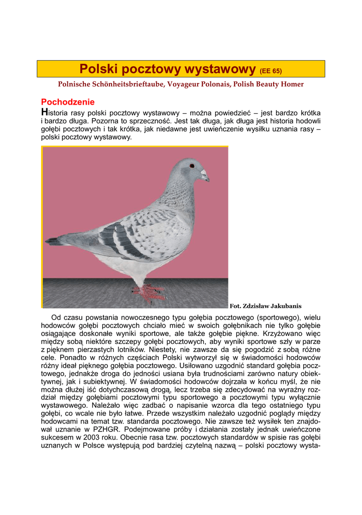 Polski pocztowy wystawowy (EE 65) Polnische Schönheitsbrieftaube, Voyageur Polonais, Polish Beauty Homer Pochodzenie Historia rasy polski pocztowy wystawowy – moŜna powiedzieć – jest bardzo krótka i bardzo długa. Pozorna to sprzeczność. Jest tak długa, jak długa jest historia hodowli gołębi pocztowych i tak krótka, jak niedawne jest uwieńczenie wysiłku uznania rasy – polski pocztowy wystawowy. Fot. Zdzisław Jakubanis Od czasu powstania nowoczesnego typu gołębia pocztowego (sportowego), wielu hodowców gołębi pocztowych chciało mieć w swoich gołębnikach nie tylko gołębie osiągające doskonałe wyniki sportowe, ale takŜe gołębie piękne. KrzyŜowano więc między sobą niektóre szczepy gołębi pocztowych, aby wyniki sportowe szły w parze z pięknem pierzastych lotników. Niestety, nie zawsze da się pogodzić z sobą róŜne cele. Ponadto w róŜnych częściach Polski wytworzył się w świadomości hodowców róŜny ideał pięknego gołębia pocztowego. Usiłowano uzgodnić standard gołębia pocztowego, jednakŜe droga do jedności usiana była trudnościami zarówno natury obiektywnej, jak i subiektywnej. W świadomości hodowców dojrzała w końcu myśl, Ŝe nie moŜna dłuŜej iść dotychczasową drogą, lecz trzeba się zdecydować na wyraźny rozdział między gołębiami pocztowymi typu sportowego a pocztowymi typu wyłącznie wystawowego. NaleŜało więc zadbać o napisanie wzorca dla tego ostatniego typu gołębi, co wcale nie było łatwe. Przede wszystkim naleŜało uzgodnić poglądy między hodowcami na temat tzw. standarda pocztowego. Nie zawsze teŜ wysiłek ten znajdował uznanie w PZHGR. Podejmowane próby i działania zostały jednak uwieńczone sukcesem w 2003 roku. Obecnie rasa tzw. pocztowych standardów w spisie ras gołębi uznanych w Polsce występują pod bardziej czytelną nazwą – polski pocztowy wysta- Polski pocztowy wystawowy wowy. UmoŜliwiło to tym samym zgłoszenie rasy do Europejskiej Federacji Hodowców Gołębi Rasowych, Drobiu i Królików. Opis budowy Jeśli śląski tarczowy zdecydowanie przypomina gołębia pocztowego dawnego typu, to mniej do pocztowego typu sportowego podobny jest polski pocztowy wystawowy. Hodowcy polscy, głównie hodowcy na Śląsku posługiwali się w procesie tworzenia rasy takŜe innymi pocztowymi wystawowymi, w tym takŜe giant homerem i show racerem. Dlatego budowa polskiego pocztowego wystawowego jest bardziej zwarta i zaokrąglona. Patrząc z boku, wyraźnie zauwaŜalna jest klinowata budowa jego korpusu. Wszystkie części jego ciała są mocne i zaokrąglone, chociaŜ gołębie zbyt duŜe nie są darzone szczególnymi względami. Polski pocztowy wystawowy ma głowę zaokrągloną, bez załamań, zbliŜoną do spłaszczonej półkuli. Tył głowy łagodnym łukiem łączy się ze stosunkowo krótką, mocną i szeroką szyją, która począwszy od podgardla łagodnie zaokrąglonego stopniowo się rozszerza w kierunku szerokiej i dobrze zaokrąglonej, lekko podniesionej piersi. Fot. Zdzisław Jakubanis Polski pocztowy wystawowy ma duŜe oczy, od pomarańczowego do czerwonego koloru. Dopuszcza się oczy perłowe, albo rybie, szklane, czyli – jak mówi się na Śląsku typu glazer. Białe gołębie mają oko ciemne. Brew jak u gołębi pocztowych powinna być wąska koloru cielistego lub szaro-cielistego. Linia szerokiego, nieznacznie spłaszczonego czoła bez znacznego załamania łączy się z linią klinowatego, średniej długości dzioba. Kolor dzioba zaleŜny jest od barwy upierzenia. Woskówki powinny być gładkie, szerokie, białe lub szarobiałe. PrzedłuŜenie linii między górną a dolną częścią dzioba przebiega przez środek dzioba. Szerokie plecy, szczególnie w ramionach, stopniowo zwęŜają się i lekko opadają w kierunku średniej długości ogona o dwunastu sterówkach. Lotki zdecydowanie mocnych i szerokich skrzydeł powinny spoczywać na ogonie. 2 Polski pocztowy wystawowy Wzorzec opisuje nogi u polskich pocztowych wystawowych jako średniej długości, lekko ugięte i szeroko rozstawione. Dobrze upierzone uda w kształcie klina. Kolor pazurków powinien być zgodny z kolorem dzioba, a więc zaleŜny od barwy upierzenia. Wszystko w budowie, co jest niezgodne z wymaganiami wzorca, a więc wąski, wydłuŜony korpus, wąska szyja i pierś, kanciasta, niewypełniona głowa, szerokie i czerwone brwi, zbyt cienki dziób, obwisłe skrzydła, szeroki ogon, zbyt krótkie lub zbyt długie nogi – uwaŜa się za duŜe wady. Kolory i rysunek Polskie pocztowe wystawowe mogą być jednobarwne i pstre. Jednobarwne występują w następujących kolorach: białym, czarnym, czerwonym dominującym, Ŝółtym dominującym, niebieskim, srebrnym, niebieskopłowym, czerwonopłowym, Ŝółtopłowym. Szymle występują w kolorze niebieskim, czerwonym, Ŝółtym i czarnym (ciemne) i powinny mieć równomierną pigmentację. Grochowe znane są w kolorze niebieskim, niebieskopłowym, czerwonopłowym i Ŝółtopłowym. Pstre występują we wszystkich wyŜej wymienionych kolorach. U pstrych rysunek powinien być symetrycznie rozłoŜony, a u grochowych rysunek powinien być wyraźny i równy na całych tarczach. For. Zdzisław Jakubanis Wadami w kolorze są: nieczyste kolory upierzenia, nierównomierna szymlowatość, u grochowych nierówne plamki na skrzydłach. Wadą jest takŜe niewłaściwy kolor oczu, dzioba i pazurków. Uwagi dotyczące hodowli Polskie pocztowe wystawowe mogą być trzymane w wolnej hodowli i w wolierach. Mają podobne wymagania jak gołębie pocztowe. Ale wyraźnie utraciły zdolności lotne, występujące u ich przodków, a więc u gołębi pocztowych. 3 Polski pocztowy wystawowy Niewskazane są małe boksy do gniazdowania. Dobrze wychowują swoje potomstwo. Rumuni wyhodowali podobnego do naszego gołębia pocztowego wystawowego. Nieco przypomina on naszego pocztowego wystawowego, który jednak wyraźnie róŜni się kilkoma cechami od rumuńskich wysta
