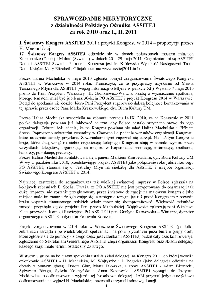 SPRAWOZDANIE MERYTORYCZNE z działalności Polskiego Ośrodka ASSITEJ za rok 2010 oraz I., II. 2011 I. Światowy Kongres ASSITEJ 2011 i projekt Kongresu w 2014 – propozycja prezes H. Machulskiej 17. Światowy Kongres ASSITEJ odbędzie się w dwóch połączonych mostem miastach Kopenhadze (Dania) i Malmö (Szwecja) w dniach 20 – 29 maja 2011. Organizatorami są ASSITEJ Dania i ASSITEJ Szwecja. Patronem Kongresu jest Jej Królewska Wysokość Następczyni Tronu Danii Księżna Mary Elizabeth. Oficjalna strona www.assitej2011.info . Prezes Halina Machulska w maju 2010 zgłosiła pomysł zorganizowania Światowego Kongresu ASSITEJ w Warszawie w 2014 roku. Tłumaczyła, że to przyspieszy uzyskanie od Miasta Teatralnego Młyna dla ASSITEJ (więcej informacji o Młynie w punkcie XI.) Wysłano 7 maja 2010 pismo do Pani Prezydent Warszawy H. Gronkiewicz-Waltz z prośbą o wyznaczenie spotkania, którego tematem miał być jubileusz 30-lecia PO ASSITEJ i projekt Kongresu 2014 w Warszawie. Dotąd do spotkania nie doszło, biuro Pani Prezydent sugerowało dalszą kolejność kontaktowania w tej sprawie przez osobę Pana Marka Kraszewskiego, dyr. Biura Kultury UM. Prezes Halina Machulska stwierdziła na zebraniu zarządu 14.IX. 2010, że na Kongresie w 2011 polska delegacja powinna już lobbować za tym, aby Polsce zostało przyznane prawo do jego organizacji. Zebrani byli zdania, że na Kongres powinna się udać Halina Machulska i Elżbieta Socha. Poproszono sekretariat generalny w Chorwacji o podanie warunków organizacji Kongresu, które następnie zostały przysłane. Z warunkami tymi zapoznał się zarząd. Na każdym Kongresie kraje, które chcą wziąć na siebie organizację kolejnego Kongresu stają w szranki wyboru przez wszystkich delegatów, organizując na miejscu w Kopenhadze promocję, informację, spotkania, bankiety, publikacje, prezenty. Prezes Halina Machulska kontaktowała się z panem Markiem Kraszewskim, dyr. Biura Kultury UM W-wy w październiku 2010, przedstawiając projekt ASSITEJ jako połączenie roku jubileuszowego PO ASSITEJ, starania się o Teatralny Młyn na siedzibę dla ASSITEJ i miejsce organizacji Światowego Kongresu ASSITEJ w 2014. Najwięcej zastrzeżeń do zorganizowana tak wielkiej światowej imprezy w Polsce zgłaszała na kolejnych zebraniach E. Socha. Uważa, że PO ASSITEJ nie jest przygotowany do organizacji tak dużej imprezy, nie zostanie przegłosowany przez światowe delegacje na majowym kongresie jako miejsce mało im znane i że zgłaszając się, a następnie rezygnując tuż przed Kongresem z powodu braku wsparcia finansowego polskich władz może się skompromitować. Większość członków zarządu przychyla się do projektu Pani prezes Machulskiej. Wątpliwości zgłaszają pani Wiesława Klata przewodn. Komisji Rewizyjnej PO ASSITEJ i pani Grażyna Karwowska – Winiarek, dyrektor organizacyjna ASSITEJ i dyrektor Festiwalu Korczak. Projekt zorganizowania w 2014 roku w Warszawie Światowego Kongresu ASSITEJ (po kilku zebraniach zarządu i po wielokrotnych spotkaniach na polu prywatnym poza biurem grupy osób, które zgłosiły się do pomocy - z czego część jest członkami ASSITEJ) budził cały czas kontrowersje. Zgłoszenie do Sekretariatu Generalnego ASSITEJ chęci organizacji Kongresu oraz składu delegacji każdego kraju miało termin ostateczny 23 lutego. W styczniu grupa na kolejnym spotkaniu ustaliła skład delegacji na Kongres 2011, do której weszli : członkowie ASSITEJ - H. Machulska, M. Wojtyszko i J. Rogacka (jako delegacja oficjalna na obrady z prawem głosu), Dorota Glac, Marta Jalowska, a spoza ASSITEJ - Adam Biernacki, Sylwester Biraga, Sylwia Kolczyńska i Anna Kozłowska. ASSITEJ wystąpił do Instytutu Mickiewicza o dofinansowanie wyjazdu tej 9-osobowej delegacji. IAM przyznał jedynie częściowe dofinansowanie na wyjazd H. Machulskiej, pozostali otrzymali odmowę dotacji. 1 Na zebraniu zarządu 9 lutego br. D. Szczuka oświadczyła, że grupa wychowanek H. Machulskiej z różnych lat postanowiła wesprzeć ją w staraniach o organizację kongresu ASSITEJ w Warszawie. Napisała „ostateczna decyzja, czy kongres się odbędzie, zależy od wielu czynników, na które nie mamy wpływu. Zdecyduje o tym z jednej strony Komitet Wykonawczy, a z drugiej możliwości pozyskania funduszy na ten cel. Starania mogą więc nie przynieść efektu, ale ze względu na osobę i dorobek Haliny Machulskiej, powinniśmy je podjąć. M. Wojtyszko był zdania, że sprawy nie powinno się traktować w kategoriach wstydu, nawet gdybyśmy byli zmuszeni wycofać się. Podkreślił też, że jego zdaniem nie mamy dużych szans na akceptację ze strony Komitetu Wykonawczego, ponieważ to jest trochę „biuro podróży”. Członkowie komitetu wybierają miejsca na kolejne kongresy też trochę pod kątem ich atrakcyjności turystycznej, a tegoroczny kongres odbędzie już w Europie.” (protokół z zebrania 9.02.) Zebrani połączyli się telefonicznie ze Zbigniewem Rudzińskim z Poznania, członkiem oficjalnej delegacji (wraz z E. Sochą) na Kongres 2008 w Australii, który oprócz odmowy kandydowania do Światowego Komitetu Wykonawczego sugerował, że realizacja Kongresu w Polsce w 2014 jest mało możliwa i proponował przeniesienie projektu na kolejny termin w 2017 roku. Powiedział, że ośrodki realizujące kongresy są bardzo dobrze dofinansowane w swoich krajach, zorganizowane i opiniotwórcze na forum ASSITEJ. Centra skandynawskie po Australii zapewne w tym roku jeszcze wzniosą poziom wyżej. Dnia 9 lutego 2011 zostały wysłane pisma przez grupę przygotowującą projekt Kongresu do : - pana Marka Kraszewskiego, dyr. Biura Kultury UM W-wy o sfinansowanie projektów przygotowywanych na Kongres w 2011 roku – wydawnictwa informacyjnego pokazującego osiągnięcia teatru dla dzieci i młodzieży w Polsce i 5 minutowego filmu promocyjnego na 35.000 zł - pana Marka Kraszewskiego o możliwość dofinansowania przez miasto Kongre