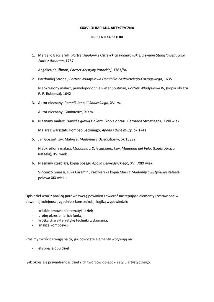 XXXVI OLIMPIADA ARTYSTYCZNA OPIS DZIEŁA SZTUKI 1. Marcello Bacciarelli, Portret Apolonii z Ustrzyckich Poniatowskiej z synem Stanisławem, jako Flora z Amorem, 1757 Angelica Kauffman, Portret Krystyny Potockiej, 1783/84 2. Bartłomiej Strobel, Portret Władysława Dominika Zasławskiego-Ostrogskiego, 1635 Nieokreślony malarz, prawdopodobnie Pieter Soutman, Portret Władysława IV, (kopia obrazu P. P. Rubensa), 1642 3. Autor nieznany, Pomnik Jana III Sobieskiego, XVII w. Autor nieznany, Ganimedes, XIX w. 4. Nieznany malarz, Dawid z głową Goliata, (kopia obrazu Bernarda Strozziego), XVIII wiek Malarz z warsztatu Pompeo Batoniego, Apollo i dwie muzy, ok 1741 5. Jan Gossart, zw. Mabuse, Madonna z Dzieciątkiem, ok 1533? Nieokreślony malarz, Madonna z Dzieciątkiem, tzw. Madonna del Velo, (kopia obrazu Rafaela), XVI wiek 6. Nieznany rzeźbiarz, kopia posągu Apolla Belwederskiego, XVIII/XIX wiek Vincenzo Gaiassi, Luka Caramini, rzeźbiarska kopia Marii z Madonny Sykstyńskiej Rafaela, połowa XIX wieku Opis dzieł wraz z analizą porównawczą powinien zawierać następujące elementy (zestawione w dowolnej kolejności, zgodnie z konstrukcją i logiką wypowiedzi): - krótkie omówienie tematyki dzieł; próbę określenia ich funkcji; krótką charakterystykę techniki wykonania; analizę kompozycji Prosimy zwrócić uwagę na to, jak powyższe elementy wpływają na: - ekspresję obu dzieł i jak określają przynależność dzieł i ich twórców do epoki i stylu artystycznego.