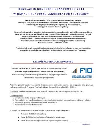 REGULAMIN KONKURSU GRANTOWEGO 2014 W RAMACH F UNDUSZU „A KUMULATOR SPOŁE CZNY” AKUMULATOR SPOŁECZNY to przyjazny, trwały i innowacyjny fundusz, mający na celu pobudzanie aktywności społecznej mieszkanek i mieszkańców Pomorza. Skierowany jest do grup nieformalnych i organizacji pozarządowych, działających na rzecz dobra wspólnego. Fundusz budowany jest w partnerstwie organizacji pozarządowych z województwa pomorskiego: Centrum Inicjatyw Obywatelskich, Stowarzyszenia EDUQ, Fundacji Pokolenia, Fundacji Parasol, Regionalnego Centrum Informacji i Wspomagania Organizacji Pozarządowych, Fundacji Lokalna Grupa Działania – Naszyjnik Północy oraz Stowarzyszenia Morena. Otwartość, zaufanie i solidarność to wartości naszego partnerstwa i fundamenty Funduszu AKUMULATOR SPOŁECZNY. Profesjonalnie wspieramy działania mieszkanek i mieszkańców Pomorza poprzez doradztwo, szkolenia, animację i granty. Zasilamy społeczną energię i pomysłowość Pomorzan. I.ZAŁOŻENIA ORAZ CEL K ONKURSU Fundusz AKUMULATOR SPOŁECZNY powstał w ramach realizacji zadania „Pomorski aktywator społeczny – małe inicjatywy, duże zmiany”, dofinansowanego ze środków Programu Fundusz Inicjatyw Obywatelskich Ministerstwa Pracy i Polityki Społecznej. Wszystkie projekty realizowane dzięki dotacjom muszą pośrednio zmierzać do osiągnięcia celu głównego i celów szczegółowych Programu Fundusz Inicjatyw Obywatelskich na lata 2014-2020 tj.: Cel główny: zwiększenie zaangażowania obywateli i organizacji pozarządowych w życie publiczne. Cele szczegółowe: 1. Zwiększenie liczby inicjatyw oddolnych. 2. Wzrost liczby obywateli angażujących się w działania organizacji pozarządowych i inicjatywy lokalne. 3. Wzrost partycypacji obywateli w sprawach publicznych. 4. Wzmocnienie potencjału III sektora. W ramach konkursu można się ubiegać o jeden z następujących rodzajów dotacji: Minigrant do 500 zł na inicjatywę, Grant do 5000 zł na działania ze sfery pożytku publicznego, Grant do 5000 zł na wsparcie młodej organizacji pozarządowej. strona 1 z 6 Dotacje można przeznaczyć na: 1. realizację projektu w dowolnej ze sfer pożytku publicznego, tj. w sferze: 1) pomocy społecznej, w tym pomocy rodzinom i osobom w trudnej sytuacji życiowej oraz wyrównywania szans tych rodzin i osób; 1a) wspierania rodziny i systemu pieczy zastępczej; 2) działalności na rzecz integracji i reintegracji zawodowej i społecznej osób zagrożonych wykluczeniem społecznym; 3) działalności charytatywnej; 4) podtrzymywania i upowszechniania tradycji narodowej, pielęgnowania polskości oraz rozwoju świadomości narodowej, obywatelskiej i kulturowej; 5) działalności na rzecz mniejszości narodowych i etnicznych oraz języka regionalnego; 6) ochrony i promocji zdrowia; 7) działalności na rzecz osób niepełnosprawnych; 8) promocji zatrudnienia i aktywizacji zawodowej osób pozostających bez pracy i zagrożonych zwolnieniem z pracy; 9) działalności na rzecz równych praw kobiet i mężczyzn; 10) działalności na rzecz osób w wieku emerytalnym; 11) działalności wspomagającej rozwój gospodarczy, w tym rozwój przedsiębiorczości; 12) działalności wspomagającej rozwój techniki, wynalazczości i innowacyjności oraz rozpowszechnianie i wdrażanie nowych rozwiązań technicznych w praktyce gospodarczej; 13) działalności wspomagającej rozwój wspólnot i społeczności lokalnych; 14) nauki, szkolnictwa wyższego, edukacji, oświaty i wychowania; 15) wypoczynku dzieci i młodzieży; 16) kultury, sztuki, ochrony dóbr kultury i dziedzictwa narodowego; 17) wspierania i upowszechniania kultury fizycznej; 18) ekologii i ochrony zwierząt oraz ochrony dziedzictwa przyrodniczego; 19) turystyki i krajoznawstwa; 20) porządku i bezpieczeństwa publicznego; 21) obronności państwa i działalności Sił Zbrojnych Rzeczypospolitej Polskiej; 22) upowszechniania i ochrony wolności i praw człowieka oraz swobód obywatelskich, a także działań wspomagających rozwój demokracji; 23) ratownictwa i ochrony ludności; 24) pomocy ofiarom katastrof, klęsk żywiołowych, konfliktów zbrojnych i wojen w kraju i za granicą; 25) upowszechniania i ochrony praw konsumentów; 26) działalności na rzecz integracji europejskiej oraz rozwijania kontaktów i współpracy między społeczeństwami; 27) promocji i organizacji wolontariatu; 28) pomocy Polonii i Polakom za granicą; 29) działalności na rzecz kombatantów i osób represjonowanych; 30) promocji Rzeczypospolitej Polskiej za granicą; 31) działalności na rzecz rodziny, macierzyństwa, rodzicielstwa, upowszechniania i ochrony praw dziecka; 32) przeciwdziałania uzależnieniom i patologiom społecznym; 33) działalności na rzecz organizacji pozarządowych oraz podmiotów wymienionych w art. 3 ust. 3 ustawy o działalności pożytku publicznego i o wolontariacie , w zakresie określonym w pkt 1-32. 2. na rozwój młodej organizacji pozarządowej zarejestrowanej na terenie woj. pomorskiego poprzez: zakup sprzętu biurowego, sprzętu związanego z obszarem działań organizacji, oprogramowania komputerowego, oprogramowania księgowego, adaptację lokalu (który organizacja ma prawo wykorzystywać dla swojej działalności przez okres co najmniej 6 miesięcy po zakończeniu projektu), podniesienie kwalifikacji pracowników lub wolontariuszy, częściowe finansowanie kosztów osobowych związanych z obsługą księgową, prawną lub informatyczną, strona 2 z 6 poszerzenie zakresu świadczonych usług, pomoc w opracowaniu merytorycznych planów rozwoju (w tym również związanych z przyznaną dotacją – tutaj: maks. 10% kwoty dotacji) na okres co najmniej 12 miesięcy. Adresatami projektów muszą być osoby mieszkające w województwie pomorskim! II. KTO MOŻE UBIEGAĆ SIĘ O DOTACJE? Program adresowany jest do: o młodych organizacji pozarządowych posiadających osobowość prawną (wpisanych do rejestru nie wcześniej niż 18 miesięcy