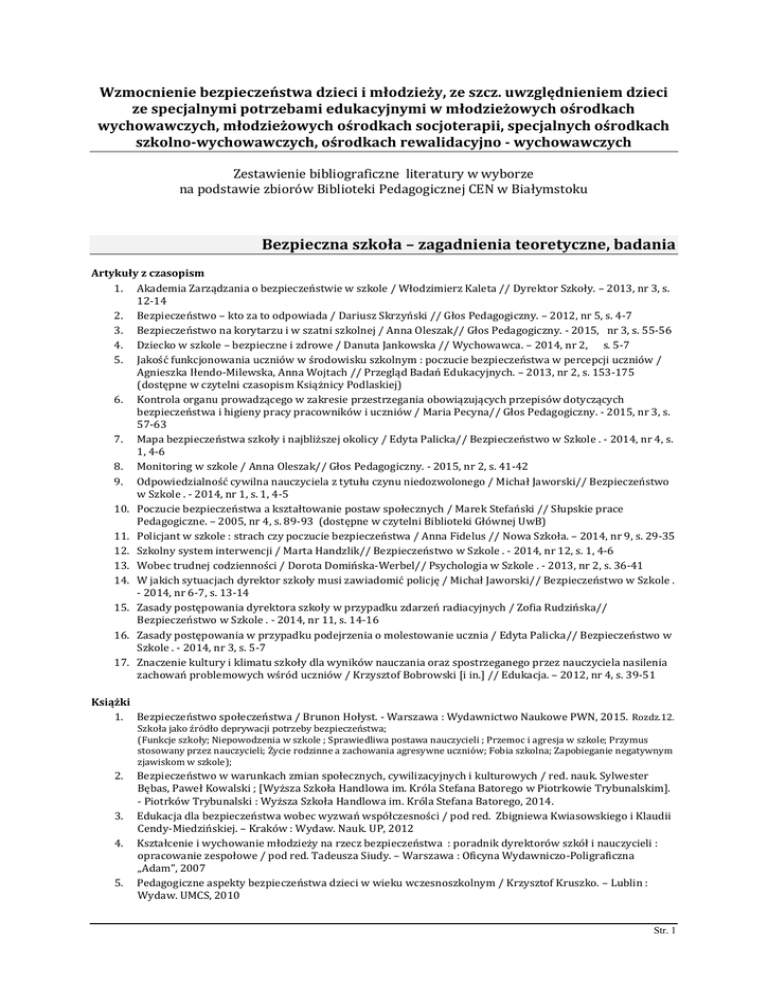 Wzmocnienie bezpieczeństwa dzieci i młodzieży, ze szcz. uwzględnieniem dzieci ze specjalnymi potrzebami edukacyjnymi w młodzieżowych ośrodkach wychowawczych, młodzieżowych ośrodkach socjoterapii, specjalnych ośrodkach szkolno-wychowawczych, ośrodkach rewalidacyjno - wychowawczych Zestawienie bibliograficzne literatury w wyborze na podstawie zbiorów Biblioteki Pedagogicznej CEN w Białymstoku Bezpieczna szkoła – zagadnienia teoretyczne, badania Artykuły z czasopism 1. Akademia Zarządzania o bezpieczeństwie w szkole / Włodzimierz Kaleta // Dyrektor Szkoły. – 2013, nr 3, s. 12-14 2. Bezpieczeństwo – kto za to odpowiada / Dariusz Skrzyński // Głos Pedagogiczny. – 2012, nr 5, s. 4-7 3. Bezpieczeństwo na korytarzu i w szatni szkolnej / Anna Oleszak// Głos Pedagogiczny. - 2015, nr 3, s. 55-56 4. Dziecko w szkole – bezpieczne i zdrowe / Danuta Jankowska // Wychowawca. – 2014, nr 2, s. 5-7 5. Jakość funkcjonowania uczniów w środowisku szkolnym : poczucie bezpieczeństwa w percepcji uczniów / Agnieszka Iłendo-Milewska, Anna Wojtach // Przegląd Badań Edukacyjnych. – 2013, nr 2, s. 153-175 (dostępne w czytelni czasopism Książnicy Podlaskiej) 6. Kontrola organu prowadzącego w zakresie przestrzegania obowiązujących przepisów dotyczących bezpieczeństwa i higieny pracy pracowników i uczniów / Maria Pecyna// Głos Pedagogiczny. - 2015, nr 3, s. 57-63 7. Mapa bezpieczeństwa szkoły i najbliższej okolicy / Edyta Palicka// Bezpieczeństwo w Szkole . - 2014, nr 4, s. 1, 4-6 8. Monitoring w szkole / Anna Oleszak// Głos Pedagogiczny. - 2015, nr 2, s. 41-42 9. Odpowiedzialność cywilna nauczyciela z tytułu czynu niedozwolonego / Michał Jaworski// Bezpieczeństwo w Szkole . - 2014, nr 1, s. 1, 4-5 10. Poczucie bezpieczeństwa a kształtowanie postaw społecznych / Marek Stefański // Słupskie prace Pedagogiczne. – 2005, nr 4, s. 89-93 (dostępne w czytelni Biblioteki Głównej UwB) 11. Policjant w szkole : strach czy poczucie bezpieczeństwa / Anna Fidelus // Nowa Szkoła. – 2014, nr 9, s. 29-35 12. Szkolny system interwencji / Marta Handzlik// Bezpieczeństwo w Szkole . - 2014, nr 12, s. 1, 4-6 13. Wobec trudnej codzienności / Dorota Domińska-Werbel// Psychologia w Szkole . - 2013, nr 2, s. 36-41 14. W jakich sytuacjach dyrektor szkoły musi zawiadomić policję / Michał Jaworski// Bezpieczeństwo w Szkole . - 2014, nr 6-7, s. 13-14 15. Zasady postępowania dyrektora szkoły w przypadku zdarzeń radiacyjnych / Zofia Rudzińska// Bezpieczeństwo w Szkole . - 2014, nr 11, s. 14-16 16. Zasady postępowania w przypadku podejrzenia o molestowanie ucznia / Edyta Palicka// Bezpieczeństwo w Szkole . - 2014, nr 3, s. 5-7 17. Znaczenie kultury i klimatu szkoły dla wyników nauczania oraz spostrzeganego przez nauczyciela nasilenia zachowań problemowych wśród uczniów / Krzysztof Bobrowski [i in.] // Edukacja. – 2012, nr 4, s. 39-51 Książki 1. Bezpieczeństwo społeczeństwa / Brunon Hołyst. - Warszawa : Wydawnictwo Naukowe PWN, 2015. Rozdz.12. Szkoła jako źródło deprywacji potrzeby bezpieczeństwa; (Funkcje szkoły; Niepowodzenia w szkole ; Sprawiedliwa postawa nauczycieli ; Przemoc i agresja w szkole; Przymus stosowany przez nauczycieli; Życie rodzinne a zachowania agresywne uczniów; Fobia szkolna; Zapobieganie negatywnym zjawiskom w szkole); 2. 3. 4. 5. Bezpieczeństwo w warunkach zmian społecznych, cywilizacyjnych i kulturowych / red. nauk. Sylwester Bębas, Paweł Kowalski ; [Wyższa Szkoła Handlowa im. Króla Stefana Batorego w Piotrkowie Trybunalskim]. - Piotrków Trybunalski : Wyższa Szkoła Handlowa im. Króla Stefana Batorego, 2014. Edukacja dla bezpieczeństwa wobec wyzwań współczesności / pod red. Zbigniewa Kwiasowskiego i Klaudii Cendy-Miedzińskiej. – Kraków : Wydaw. Nauk. UP, 2012 Kształcenie i wychowanie młodzieży na rzecz bezpieczeństwa : poradnik dyrektorów szkół i nauczycieli : opracowanie zespołowe / pod red. Tadeusza Siudy. – Warszawa : Oficyna Wydawniczo-Poligraficzna „Adam”, 2007 Pedagogiczne aspekty bezpieczeństwa dzieci w wieku wczesnoszkolnym / Krzysztof Kruszko. – Lublin : Wydaw. UMCS, 2010 Str. 1 6. Poczucie bezpieczeństwa społecznego młodzieży w małym środowisku / Tomasz Biernat, Janusz Gierszewski. - Toruń : Wydawnictwo Edukacyjne "Akapit", 2013. 7. Profilaktyka zachowań ryzykownych dzieci i młodzieży jako wyzwanie dla współczesnej szkoły / Katarzyna Borzucka-Sitkiewicz, Katarzyna Kowalczewska-Grabowska// W: Współczesna szkoła w następstwie przemian społeczno-kulturowych / red. nauk. Agata Rzymełka-Frąckiewicz. - Toruń 2014. - S. 199-219. 8. Profilaktyka agresji i przemocy w szkole – przykłady rozwiązań europejskich / Agnieszka Pawluk-Skrzypek // W : Współczesne determinanty profilaktyki i resocjalizacji nieletnich / red. nauk. Sylwester Bębas. – Radom, 2010. – S. 393-400 9. Sprawcy przemocy szkolnej / Beata Kohlman // W : Współczesne determinanty profilaktyki i resocjalizacji nieletnich / red. nauk. Sylwester Bębas. – Radom, 2010. – S. 401-414 10. Szkoła dobrze rządzona i zorganizowana / Maria Dąbrowska-Bąk, Katarzyna Pawełek// W: Opresja w szkole / Marie Dąbrowska-Bąk, Katarzyna Pawełek. - Warszawa 2014. - S. 253-275. 11. Zarządzanie wiedzą o zagrożeniach i bezpieczeństwie uczniów w rozwijaniu szkolnych systemów bezpieczeństwa / Janusz Ziarko. – Kraków : Wydaw UJ, 2011 Uczeń o specjalnych potrzebach edukacyjnych Książki 1. ABC pedagoga specjalnego : razem łatwiej : nowe doświadczenia / Aleksandra Tomkiewicz-Bętkowska ; [współpraca: Alicja Krztoń]. - Kraków : Oficyna Wydawnicza "Impuls", 2015. 2. Dydaktyka specjalna : wybrane zagadnienia / red. nauk. Janina Wyczesany. - Gdańsk : Wydawnictwo Harmonia Universalis, 2014. 3. Dzieci o specjalnych potrzebach edukacyjnych - implikacje dydaktyczne i wychowawcze / red. nauk. Danuta Umiastowska, Jolanta Gebreselassie. - Gorzów Wielkopolski : Wydawnictwo Naukowe Państwowe