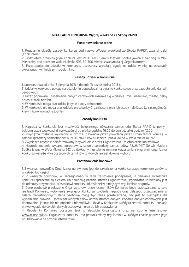 REGULAMIN KONKURSU- Wygraj weekend ze Skodą RAPID Postanowienia wstępne 1. Regulamin określa zasady konkursu pod nazwą „Wygraj weekend ze Skodą RAPID”, zwanej dalej „Konkursem”. 2. Podmiotem organizującym Konkurs jest P.U.H. MKT Serwis Maziarz Spółka Jawna z siedzibą w Woli Mieleckiej, pod adresem Wola Mielecka 592, 39-300 Mielec, zwanym dalej „Organizatorem”. 3. Przystępując do udziału w Konkursie, uczestnicy wyrażają zgodę na udział w niej na zasadach określonych w niniejszym regulaminie. Zasady udziału w konkursie 1. Konkurs trwa od dnia 12 sierpnia 2013 r. do dnia 13 października 2013 r. 2. Udział w konkursie polega na udzieleniu odpowiedzi na pytanie konkursowe oraz uzupełnieniu danych osobowych. 3. Przez poprawne uzupełnienie danych osobowych rozumie się wpisanie: imię i nazwisko, miasto, pełny adres, e-mail, telefon. 4. W Konkursie mogą brać udział jedynie osoby pełnoletnie. 5. W Konkursie nie mogą brać udziału pracownicy Organizatora oraz ich osoby najbliższe (w szczególności krewni i powinowaci I stopnia). Zasady konkursu 1. Nagrodą w konkursie jest możliwość bezpłatnego używania samochodu Skoda RAPID (z pełnym bakiem) przez weekend, tj. najwcześniej od piątku godziny 16.00 do poniedziałku godziny 12.00. 2. Zwycięzca zostanie wyłoniony w drodze losowania przez powołaną przez Organizatora komisję w salonie sprzedaży samochodów w P.U.H. MKT Serwis Maziarz Spółka Jawna w Wola Mielecka 592. 3. Zwycięzca zostanie poinformowany indywidualnie przez Organizatora - telefonicznie lub mailowo. 4. Nagroda zostanie wydana laureatowi w salonie sprzedaży samochodów P.U.H. MKT Serwis Maziarz Spółka Jawna w Wola Mielecka 592 po dokładnym ustaleniu terminu korzystania z wygranej (organizator konkursu wskaże kilka dostępnych terminów, z których laureat dokona wyboru). Postanowienia końcowe 1. Z ważnych powodów Organizator uprawniony jest do zakończenia konkursu przed terminem, zarówno w całości lub części. 2. Z ważnych powodów, w szczególności w razie zaistnienia podejrzenia, iż działania Uczestnika konkursu sprzeczne są z celem lub naruszają istotnie interes Organizatora, Organizator uprawniony jest do odmowy przyznania Uczestnikowi konkursu określonej w niniejszym regulaminie nagrody. 3. Dane osobowe przekazane Organizatorowi przez uczestników Konkursu będą przetwarzane w celu realizacji Konkursu, wyłonienia zwycięzcy Konkursu, wydania nagrody oraz dalszego przetwarzania w celach marketingowych. Dane osobowe mogą być także przetwarzane, gdy jest to niezbędne dla wypełnienia prawnie usprawiedliwionych celów administratora danych. Podanie danych osobowych jest dobrowolne, jednak ich nie podanie uniemożliwia udział w Konkursie. Każdy uczestnik Konkursu posiada prawo wglądu do swoich danych osobowych oraz do ich poprawiania. 4. Regulamin Konkursu dostępny jest w siedzibie Organizatora oraz na stronie internetowej www.mktserwis.pl. Organizator konkursu ma prawo zmiany regulaminu w każdym czasie poprzez jego opublikowanie na stronie internetowej.