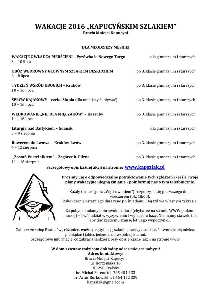 WAKACJE 2016 „KAPUCYŃSKIM SZLAKIEM” Bracia Mniejsi Kapucyni DLA MŁODZIEŻY MĘSKIEJ WAKACJE Z WŁADCĄ PIERŚCIENI – Pyzówka k. Nowego Targu 3 – 10 lipca dla gimnazjum i starszych OBÓZ WĘDROWNY GŁÓWNYM SZLAKIEM BESKIDZKIM 3 – 8 lipca po 3. klasie gimnazjum i starszych TYDZIEŃ WŚRÓD UBOGICH – Kraków 10 – 16 lipca po 3. klasie gimnazjum i starszych SPŁYW KAJAKOWY – rzeka Słupia (dla umiejących pływać) 10 – 16 lipca po 3. klasie gimnazjum i starszych WĘDROWANIE „NIE DLA MIĘCZAKÓW” – Kaszuby 11 – 16 lipca po 3. klasie gimnazjum i starszych Liturgia nad Bałtykiem – Gdańsk 3 – 9 sierpnia dla gimnazjum i starszych Rowerem do Lwowa – Kraków-Lwów 4 – 12 sierpnia po 3. klasie gimnazjum i starszych „Zostań Pustelnikiem” – Zagórze k. Pilzna 11 – 16 sierpnia Szczegółowy opis każdej akcji na stronie: po 3. klasie gimnazjum i starszych www.kapszlak.pl Prosimy Cię o odpowiedzialne potraktowanie tych zgłoszeń i - jeśli Twoje plany wakacyjne ulegną zmianie - poinformuj nas o tym telefonicznie. Każdy turnus (poza „Wędrowaniem”) rozpoczyna się pierwszego dnia wieczorem (ok. 18:00). Zakończenie ostatniego dnia rano po śniadaniu. Dojazd we własnym zakresie. Za pobyt składamy dobrowolną ofiarę (chyba, że na stronie WWW podano inaczej) – Twój udział w wyżywieniu i wynajęciu bazy. Nie mamy stawek, tak aby dać każdemu szansę letniego wypoczynku. Zabierz ze sobą: Pismo św., różaniec, ważną legitymację szkolną, rzeczy osobiste, śpiwór, ciepłą odzież, pieniądze i jakieś jedzenie do wspólnej kuchni. Szczegółowe informacje, co zabrać znajdziesz przy opisie każdej akcji na stronie www. W domu zostaw rodzicom dokładny adres miejsca pobytu! Adres kontaktowy: Bracia Mniejsi Kapucyni ul. Korzeniaka 16 30-298 Kraków br. Michał Ferenc tel. 795 451 233 br. Artur Borkowski tel. 664 172 339 [email protected] ZGŁOSZENIE UCZESTNICTWA W WAKACJACH 2016 „KAPUCYŃSKIM SZLAKIEM” Imię i nazwisko ......................................................................................................................................................................................... ulica i nr domu .......................................................................................................................................................................................... Kod i miejscowość .................................................................................................................................................................................... Data urodzenia ...............................................… Nr ewid. PESEL ....................................................................................................... Tel. kom. ............................................................. e-mail ............................................................................................................................ Zakład ubezpieczeniowy i numer polisy ........................................................................................................................................ (dopytać w sekretariacie szkoły) Zgłaszam swoje uczestnictwo w rekolekcjach prowadzonych przez Braci Kapucynów: Miejsce ................................................................................................................. Data .............................................................................. ………………………………………………….. podpis uczestnika ……………………………………………... podpis rodzica lub opiekuna INFORMACJA O STANIE ZDROWIA Wszystkie nasze wakacyjne akcje (góry/rower/kajaki) domagają się dobrego stanu zdrowia uczestnika. Poniżej należy ujawnić wszelkiego rodzaju choroby, których objawy mogą wystąpić podczas turnusu, a zwłaszcza alergie, astmę, choroby przewlekłe itp. Prosimy o podanie wszelkich wiadomości o stanie zdrowia uczestnika (choroby, uczulenia, leki, które musi lub ewentualnie nie może przyjmować), które pomogą prowadzącym w zapewnieniu właściwej opieki. ................................................................................................................................................................... ................................................................................................................................................................... ......................……….………………………………………………………………………………………. Stwierdzam, że podałem (-am) wszystkie znane mi informacje o synu, które mogą pomóc w zapewnieniu właściwej opieki w czasie pobytu na turnusie. Wyrażam zgodę na zabiegi lecznicze i leczenie szpitalne w stanach zagrażających zdrowiu lub życiu dziecka. Zgadzam się na udział mojego syna w wycieczkach górskich i rowerowych. W przypadku złego zachowania i niestosowanie się do poleceń opiekunów, organizatorzy mogą odesłać uczestnika do domu przed zakończeniem turnusu! Telefon kontaktowy z Rodzicami …………………………....…………………. …………………………………………………………… podpis rodzica lub opiekuna /powyżej 18-go roku życia – podpis uczestnika/ Wypełnij dokładnie tę kartę i przywieź ze sobą na turnus.