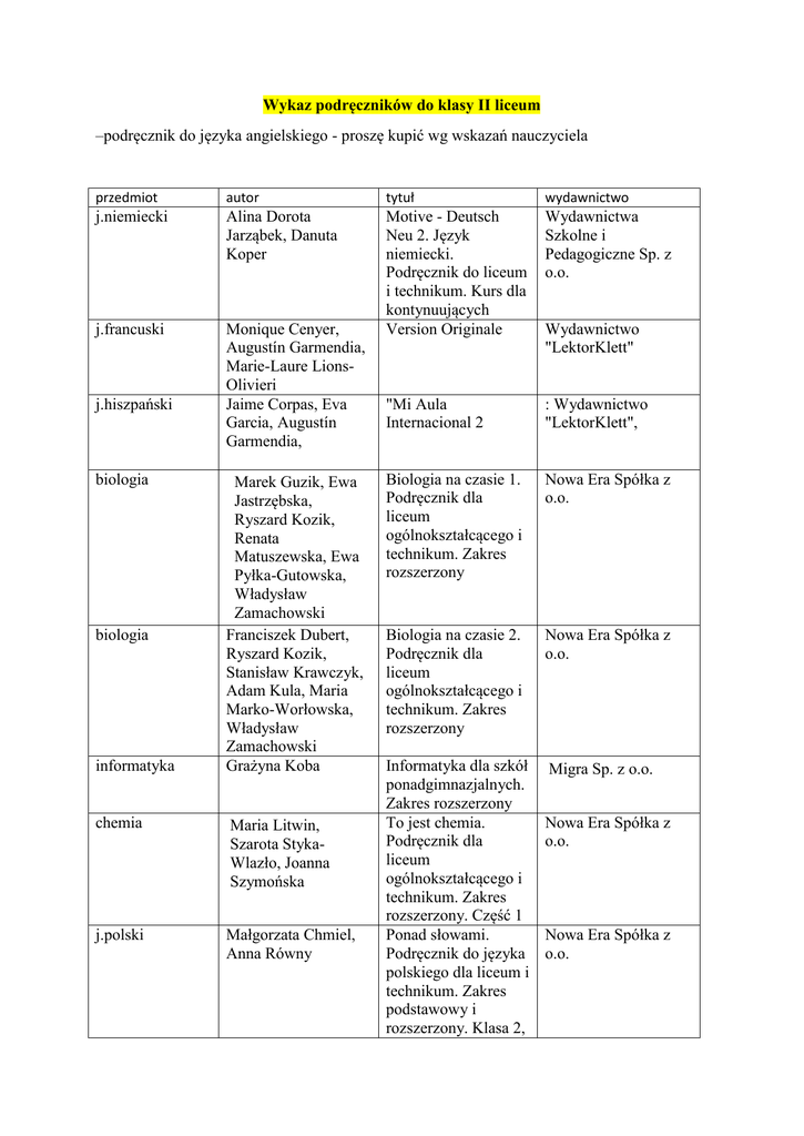 Wykaz podręczników do klasy II liceum –podręcznik do języka angielskiego - proszę kupić wg wskazań nauczyciela przedmiot autor tytuł wydawnictwo j.niemiecki Alina Dorota Jarząbek, Danuta Koper Wydawnictwa Szkolne i Pedagogiczne Sp. z o.o. j.francuski Monique Cenyer, Augustín Garmendia, Marie-Laure LionsOlivieri Jaime Corpas, Eva Garcia, Augustín Garmendia, Motive - Deutsch Neu 2. Język niemiecki. Podręcznik do liceum i technikum. Kurs dla kontynuujących Version Originale "Mi Aula Internacional 2 : Wydawnictwo "LektorKlett", Biologia na czasie 1. Podręcznik dla liceum ogólnokształcącego i technikum. Zakres rozszerzony Nowa Era Spółka z o.o. Biologia na czasie 2. Podręcznik dla liceum ogólnokształcącego i technikum. Zakres rozszerzony Nowa Era Spółka z o.o. Informatyka dla szkół ponadgimnazjalnych. Zakres rozszerzony To jest chemia. Podręcznik dla liceum ogólnokształcącego i technikum. Zakres rozszerzony. Część 1 Ponad słowami. Podręcznik do języka polskiego dla liceum i technikum. Zakres podstawowy i rozszerzony. Klasa 2, Migra Sp. z o.o. j.hiszpański biologia biologia informatyka Marek Guzik, Ewa Jastrzębska, Ryszard Kozik, Renata Matuszewska, Ewa Pyłka-Gutowska, Władysław Zamachowski Franciszek Dubert, Ryszard Kozik, Stanisław Krawczyk, Adam Kula, Maria Marko-Worłowska, Władysław Zamachowski Grażyna Koba chemia Maria Litwin, Szarota StykaWlazło, Joanna Szymońska j.polski Małgorzata Chmiel, Anna Równy Wydawnictwo "LektorKlett" Nowa Era Spółka z o.o. Nowa Era Spółka z o.o. j.polski Matematyka 2a,2b,2d,2e Matematyka 2c geografia geografia geografia geografia fizyka historia część 1 Małgorzata Chmiel, Ponad słowami. Ewa MirkowskaPodręcznik do języka Treugutt, Anna polskiego dla liceum i Równy technikum. Klasa 2. Część 2 Marcin Kurczab, Matematyka. Elżbieta Kurczab, Podręcznik do liceów Elżbieta Świda i techników. Zakres podstawowy i rozszerzony. Klasa 2 Maciej Antek, Prosto do matury. Krzysztof Belka, Piotr Podręcznik do Grabowski matematyki dla szkół ponadgimnazjalnych. Klasa 2. Kształcenie ogólne w zakresie podstawowym Roman Malarz, Oblicza geografii 1. Marek Więckowski Podręcznik dla liceum ogólnokształcącego i technikum. Zakres rozszerzony Tomasz Rachwał Oblicza geografii 2 Podręcznik dla liceum ogólnokształcącego i technikum, zakres rozszerzony, Anna Karaś, Ewa Oblicza geografii Grząba Maturalne karty pracy 1, zakres rozszerzony, Jadwiga Brożyńska, Oblicza geografii Ewa Jaworska, Anna Maturalne karty pracy Karaś 2, zakres rozszerzony Barbara Sagnowska, Z fizyką w Maria Fiałkowska, przyszłość. Jadwiga Salach : Podręcznik dla szkół ponadgimnazjalnych. Zakres rozszerzony. Część 1 +2 Ryszard Kulesza, Krzysztof Kowalewski Zrozumieć przeszłość. Starożytność i średniowiecze. Podręcznik do historii dla liceum ogólnokształcącego i technikum. Zakres rozszerzony Nowa Era Spółka z o.o. Oficyna Edukacyjna Krzysztof Pazdro Sp. z o.o Nowa Era Spółka z o.o wyd. Nowa Era wyd. Nowa Era wyd. Nowa Era wyd. Nowa Era Zamkor Nowa Era Spółka z o.o. historia Paweł Klint, Piotr Galik Zrozumieć przeszłość. Dzieje nowożytne. Podręcznik do historii dla liceum ogólnokształcącego i technikum. Zakres rozszerzony. Część 2 Nowa Era Spółka z o.o historia i społeczeństwo Marcin Markowicz, Olga Pytlińska, Agata Wyroda WSIP historia i społeczeństwo Marcin Markowicz, Olga Pytlińska, Agata Wyroda historia i społeczeństwo Marcin Markowicz, Olga Pytlińska, Agata Wyroda historia i społeczeństwo Marcin Markowicz, Olga Pytlińska, Agata Wyroda j.angielski – V. Evans,J. Dooley Historia i społeczeństwo. Ojczysty Panteon i ojczyste spory. Podręcznik. Liceum i technikum Historia i społeczeństwo. Europa i świat. Podręcznik. Liceum i technikum Historia i społeczeństwo. Wojna i wojskowość. Liceum i technikum Historia i społeczeństwo. Rządzący i rządzeni. Liceum i technikum On Screen j.angielski- S. Kay, V. Jones Matura Focus wyd. Pearson Wos (poziom rozszerzony) Arkadiusz Janicki,Justyna Kięczkowska, Mariusz Menz, " W centrum Uwagi" zakres rozszerzony cz.1 Nowa Era Spółka z o.o. WSIP WSIP WSIP wyd. Egis . .