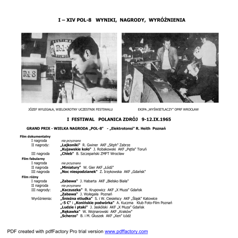 I – XIV POL-8 WYNIKI, NAGRODY, WYRÓŻNIENIA JÓZEF WYLEGAŁA, WIELOKROTNY UCZESTNIK FESTIWALU EKIPA „WYŚWIETLACZY” OPRF WROCŁAW I FESTIWAL POLANICA ZDRÓJ 9-12.IX.1965 GRAND PRIX - WIELKA NAGRODA „POL-8" - „Elektrotonsi" R. Heith Poznań Film dokumentalny I nagroda II nagrody: III nagroda nie przyznano „Lajkoniki" R. Gwiner AKF „Sitph" Zabrze „Kujawskie koło" J. Robakowski AKF „Pętla" Toruń „Chleb" B. Szczepański ZMFT Wrocław Film fabularny I nagroda II nagroda III nagroda nie przyznano „Miniatury" W. Gier AKF „Łódź" „Noc niespodzianek" Z. Irzykowska AKF „Gdańsk" Film różny I nagroda II nagroda III nagrody: Wyróżnienia: „Zabawa" J. Habarta AKF „Bielsko Biała" nie przyznano „Kaczuszka" R. Krupowicz AKF „X Muza" Gdańsk „Zabawa" J. Wylegała Poznań „Śnieżna etiudka" S. i W. Ciesielscy AKF „Śląsk" Katowice „-5 C" i „Konińskie podwórka" A. Kuczma Klub Foto-Film Poznań „Ludzie i ptaki" J. Jaskólski AKF „X Muza" Gdańsk „Rękawka" W. Wojnarowski AKF „Kraków" „Scherzo" B. i M. Głuszek AKF „Xen" Łódź PDF created with pdfFactory Pro trial version www.pdffactory.com II FESTIWAL POLANICA ZDRÓJ 16-18.IX.1966 GRAND PRIX - WIELKA NAGRODA „POL-8” - nie przewidziano w regulaminie Film dokumentalny I nagroda II nagrody: III nagrody: Wyróżnienia: „Szałamaje" M. Szemalikowski AKF „Śląsk" Katowice „Chałupnicy" M. Hirschorn AKF NIT Wrocław „W kręgu rozwianych nadziei" Z. Miotliński AKF „Sosnowiec" „Pucybuty" i „Na zdrowie" Z. Kobak AKF „NOT” Wrocław ”Szynki" B. Szczepański AKF „NOT” Wrocław „Milleniun Poloniae" J. Gębala AKF „Biprohut" Gliwice „Karuzela" Marian Jarosz AKF „Projektor" Białystok „Bazary Pragi" A. Chrobry-Krzywdziakowa, J. Piechura i R. Szatko COPSA Warszawa Film fabularny I nagroda II nagroda III nagrody: Wyróżnienia: Film różny I nagroda II nagroda III nagroda Wyróżnienie nie przyznano „Przerwa" W. Grażewicz AKF „Wrocław" „Kotek" J. Gabszewicz Elbląg „Uśmiech szeryfa" M. Benedyktynowicz t J. Łukawski AKF „Histrion" Warszawa „Nieprzygotowany" J. Glensk i H. Tłłoczko AKF „Opole" „Fundusz" J. Marks i T. Krzemiński AKF „Bawełna" Kudowa Zdr. „Dziura" Z. Karge AKF „Biprohut" Gliwice „Nasze wakacje" J. Rink AKF „Oleśnica" „Oczekiwany dzień” E. Leśniak AKF „Horyzont" Świnoujście „Jabłko" J. Wylegała Poznań III FESTIWAL POLANICA ZDRÓJ 15-17.IX.1967 GRAND PRIX - WIELKA NAGRODA „POL-8" - nie przewidziano w regulaminie Film dokumentalny I nagroda II nagroda III nagrody: „Matka" J. Sapa AKF „Zagłębie" Dąbrowa Górnicza nie przyznano „Czernina wieś" J. Lesiak, A. Kowalski, T. Zieliński GKF przy PDK późn. AKF „Profil" Góra Śl. „Wielka stawka" A. Zaczkiewicz AKF „Metalowiec" Czechowice Film fabularny I nagroda II nagroda III nagroda „On" Marian Jarosz AKF „Projektor" Białystok „Portret" I. Kunc Cieszyn „Tata ma hobby" K. Kwinta, J. Piechura, J. Dygasiewicz, D. Krywald i M. Matuszewska COPSA Warszawa Film różny I nagroda II nagrody III nagroda nie przyznano „Elegia rewolucyjna" S. Miłoś, K. Niedzielska COPSA Warszawa „Alpinista" R. Maścianica AKF „Wrocław" „Wynalazcy" J. Gębala AKF „Biprohut" Gliwice PDF created with pdfFactory Pro trial version www.pdffactory.com Wyróżnienia: „Jej jeden dzień" E. Kreja AKF „X Muza" Gdańsk „Głos człowieka" J. Ludmirski, K. Łoś Wrocław „Badania ultradźwiękowe w przemyśle" J. Gębala AKF „Biprohut" Gliwice Nagrody specjalne: „Namiętność" P. Pawełko AKF „Kręciołek" Opole „Ja tu byłem" M. Hirschorn, Z. Kobak AKF „NOT” Wrocław „Budownictwo pasterskie w Tatrach Polskich" W. Mierzwa Sosnowiec „Problem" W. Grażewicz AKF „Wrocław" „Wasyl Błażenny" Z. Kobak AKF „Wrocław" „Kamień i serce" J. Kredoszyński Bolków „Bohaterom Warszawy" Z. Karge AKF „Biprohut" Gliwice „Anna German śpiewa" T. Rzepkiewicz AKF „Katowice-Piotrowice Nagroda Specjalna Komisji Filmowców Amatorów „Mówią sami o sobie" A. Kotleszka, W. Felich Koło IV FESTIWAL POLANICA ZDRÓJ 13-15.IX.1968 GRAND PRIX - WIELKA NAGRODA „POL-8” - nie przewidziano w regulaminie Film dokumentalny I nagroda II nagroda III nagroda Film fabularny I nagroda II nagroda 1II nagroda „Maniuś" S. Cinal Skawina „Staromiejski pejzaż" R. Filipowicz AKF „Wrocław" „List z Olsztyna" H. Brol AKF „Chorzowka-8" „On"' R. Dzienis AKF „Projektor" Białystok „Czar kółek" Marian Jarosz AKF „Projektor" Białystok „C'est la vie" W. Gier AKF „Łódź" Film różny I nagroda II nagroda III nagroda Wyróżnienia: „Pomnik" J. Wylegała Poznań „Rzeczywistość" W. Mierzwa Sosnowiec „Pająk" R. Maścianica AKF „Wrocław" „Hobby" H. Nojman Poznań „Divertimento porcelanowe" A. Mrówczyński AKF „Kalejdoskop" Turek „Cross" Z. Pak, J. Krokoszyński Klub Hutniczy Legnica Nagrody specjalne: „Pociechy" J. Lesiak i T. Zieliński Góra Śl. „Chłopcy" W. Piętrzy k. J. Fengler, B. Niemierenko AKF „Radok" Rawicz „Kwarc" J. Gabszewicz Elbląg „Campanella" J. Prochal AKF „Świdnica" „Piekarnia mechaniczna" L. Wacławczyk Chwałowice „Rejów" T. Ławacz AKT „Tęcza" Skarżysko Kamienna „Warszawa Powstańcom Śląskim" J. Bommershbach AKF im. A. Munka Sosnowiec „List z Olsztyna" H. Broll AKF „Chorzowska ósemka" „Hobby" J. Lesiak i T. Zieliński Góra Śląska „Pierwszy raz" A. Fuchs AKF „Śląsk" Katowice „Piasku, pamiętasz ?" Z. Michalik, M. Turek Garwolin PDF created with pdfFactory Pro trial version www.pdffactory.com V FESTIWAL POLANICA ZDRÓJ 19-21.IX.1969 GRAND PRIX - WIELKA NAGRODA „POL-8" Film dokumentalny I nagroda II nagroda III nagroda Film fabularny I nagroda II nagroda III nagroda nie przyznano „Tytułu nie będzie" J. Ludmirski, K. Łoś AKF „Wrocław" „Na zaporze" A. Mętlewicz AKF „Lipno" „Białe pomniki" Z. Kobak AKF „NOT” Wrocław „Biała kula" T. T