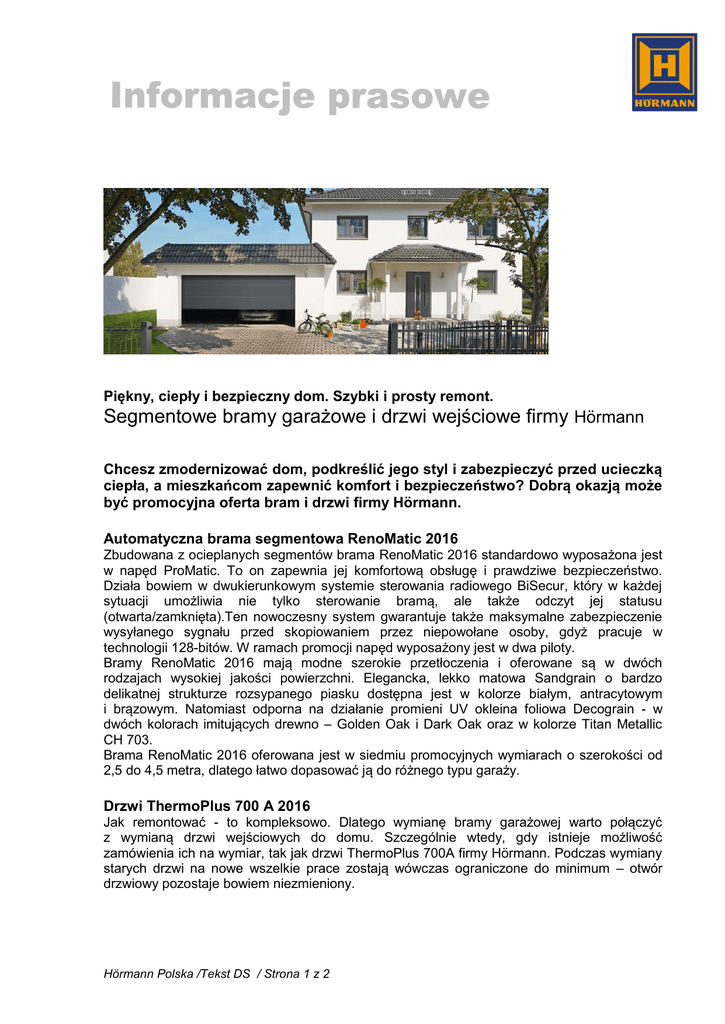 Piękny, ciepły i bezpieczny dom. Szybki i prosty remont. Segmentowe bramy garażowe i drzwi wejściowe firmy Hörmann Chcesz zmodernizować dom, podkreślić jego styl i zabezpieczyć przed ucieczką ciepła, a mieszkańcom zapewnić komfort i bezpieczeństwo? Dobrą okazją może być promocyjna oferta bram i drzwi firmy Hörmann. Automatyczna brama segmentowa RenoMatic 2016 Zbudowana z ocieplanych segmentów brama RenoMatic 2016 standardowo wyposażona jest w napęd ProMatic. To on zapewnia jej komfortową obsługę i prawdziwe bezpieczeństwo. Działa bowiem w dwukierunkowym systemie sterowania radiowego BiSecur, który w każdej sytuacji umożliwia nie tylko sterowanie bramą, ale także odczyt jej statusu (otwarta/zamknięta).Ten nowoczesny system gwarantuje także maksymalne zabezpieczenie wysyłanego sygnału przed skopiowaniem przez niepowołane osoby, gdyż pracuje w technologii 128-bitów. W ramach promocji napęd wyposażony jest w dwa piloty. Bramy RenoMatic 2016 mają modne szerokie przetłoczenia i oferowane są w dwóch rodzajach wysokiej jakości powierzchni. Elegancka, lekko matowa Sandgrain o bardzo delikatnej strukturze rozsypanego piasku dostępna jest w kolorze białym, antracytowym i brązowym. Natomiast odporna na działanie promieni UV okleina foliowa Decograin - w dwóch kolorach imitujących drewno – Golden Oak i Dark Oak oraz w kolorze Titan Metallic CH 703. Brama RenoMatic 2016 oferowana jest w siedmiu promocyjnych wymiarach o szerokości od 2,5 do 4,5 metra, dlatego łatwo dopasować ją do różnego typu garaży. Drzwi ThermoPlus 700 A 2016 Jak remontować - to kompleksowo. Dlatego wymianę bramy garażowej warto połączyć z wymianą drzwi wejściowych do domu. Szczególnie wtedy, gdy istnieje możliwość zamówienia ich na wymiar, tak jak drzwi ThermoPlus 700A firmy Hörmann. Podczas wymiany starych drzwi na nowe wszelkie prace zostają wówczas ograniczone do minimum – otwór drzwiowy pozostaje bowiem niezmieniony. Hörmann Polska /Tekst DS / Strona 1 z 2 Wykonywane na wymiar drzwi ThermoPlus 700A mogą mieć maksymalnie szerokość 1250 mm i wysokość 2250 mm. Ich atutem jest też energooszczędność. Współczynnik przenikania ciepła UD może wynosić nawet 0,97 W/(m2K). To zasługa specjalnej konstrukcji. Zarówno stalowa płyta drzwiowa o grubości 65 mm, jak i aluminiowa ościeżnica o głębokości 80 mm posiadają przegrodę termiczną. Obie wypełnione są wysokiej jakości pianką poliuretanową. Drzwi ThermoPlus 700A mają niewidoczną od zewnątrz i wewnątrz ramę skrzydła, dzięki czemu mogą spełniać nawet najbardziej wyszukane wymagania aranżacyjne. Od środka wyglądają jak drzwi wewnętrzne, dobrze więc wkomponowują się w wystrój domu. Dużą ich zaletą jest też możliwość kolorystycznego dopasowania do bram garażowych RenoMatic 2016, co pozwala na stworzenie spójnej całości i nadania elewacji harmonijnego wyglądu. Brama RenoMatic 2016, cena bez montażu -– od 3567 zł z 23% VAT i od 3132 zł z 8% VAT Drzwi ThermoPlus 700A, cena bez montażu, z 8% VAT (gdy montaż wykonuje ekipa dealerska), dla wszystkich wymiarów - w kolorze białym 4309 zł, - brązowym i antracytowym 4525 zł, - w okleinie Decograin 4828 zł Hörmann Polska /Tekst DS / Strona 2 z 2