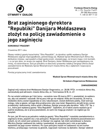zamierzam złożyć zawiadomienie o jego zaginięciu, natychmiast miałem telefony 2 kwietnia,