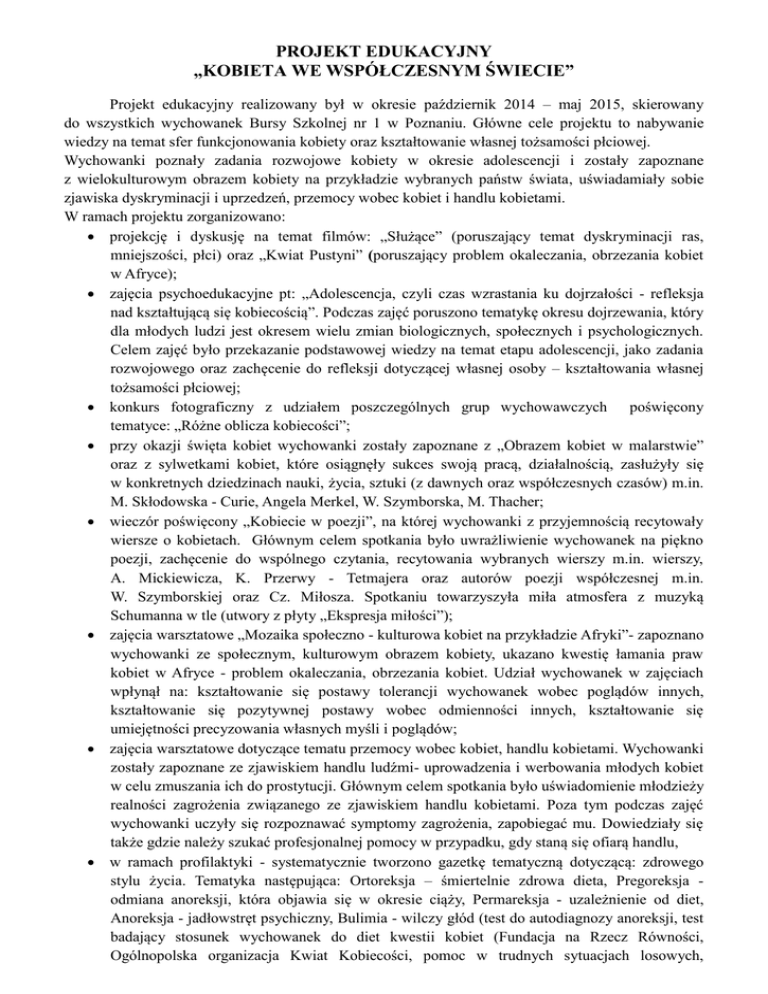 PROJEKT EDUKACYJNY „KOBIETA WE WSPÓŁCZESNYM ŚWIECIE” Projekt edukacyjny realizowany był w okresie październik 2014 – maj 2015, skierowany do wszystkich wychowanek Bursy Szkolnej nr 1 w Poznaniu. Główne cele projektu to nabywanie wiedzy na temat sfer funkcjonowania kobiety oraz kształtowanie własnej tożsamości płciowej. Wychowanki poznały zadania rozwojowe kobiety w okresie adolescencji i zostały zapoznane z wielokulturowym obrazem kobiety na przykładzie wybranych państw świata, uświadamiały sobie zjawiska dyskryminacji i uprzedzeń, przemocy wobec kobiet i handlu kobietami. W ramach projektu zorganizowano: projekcję i dyskusję na temat filmów: „Służące” (poruszający temat dyskryminacji ras, mniejszości, płci) oraz „Kwiat Pustyni” (poruszający problem okaleczania, obrzezania kobiet w Afryce); zajęcia psychoedukacyjne pt: „Adolescencja, czyli czas wzrastania ku dojrzałości - refleksja nad kształtującą się kobiecością”. Podczas zajęć poruszono tematykę okresu dojrzewania, który dla młodych ludzi jest okresem wielu zmian biologicznych, społecznych i psychologicznych. Celem zajęć było przekazanie podstawowej wiedzy na temat etapu adolescencji, jako zadania rozwojowego oraz zachęcenie do refleksji dotyczącej własnej osoby – kształtowania własnej tożsamości płciowej; konkurs fotograficzny z udziałem poszczególnych grup wychowawczych poświęcony tematyce: „Różne oblicza kobiecości”; przy okazji święta kobiet wychowanki zostały zapoznane z „Obrazem kobiet w malarstwie” oraz z sylwetkami kobiet, które osiągnęły sukces swoją pracą, działalnością, zasłużyły się w konkretnych dziedzinach nauki, życia, sztuki (z dawnych oraz współczesnych czasów) m.in. M. Skłodowska - Curie, Angela Merkel, W. Szymborska, M. Thacher; wieczór poświęcony „Kobiecie w poezji”, na której wychowanki z przyjemnością recytowały wiersze o kobietach. Głównym celem spotkania było uwrażliwienie wychowanek na piękno poezji, zachęcenie do wspólnego czytania, recytowania wybranych wierszy m.in. wierszy, A. Mickiewicza, K. Przerwy - Tetmajera oraz autorów poezji współczesnej m.in. W. Szymborskiej oraz Cz. Miłosza. Spotkaniu towarzyszyła miła atmosfera z muzyką Schumanna w tle (utwory z płyty „Ekspresja miłości”); zajęcia warsztatowe „Mozaika społeczno - kulturowa kobiet na przykładzie Afryki”- zapoznano wychowanki ze społecznym, kulturowym obrazem kobiety, ukazano kwestię łamania praw kobiet w Afryce - problem okaleczania, obrzezania kobiet. Udział wychowanek w zajęciach wpłynął na: kształtowanie się postawy tolerancji wychowanek wobec poglądów innych, kształtowanie się pozytywnej postawy wobec odmienności innych, kształtowanie się umiejętności precyzowania własnych myśli i poglądów; zajęcia warsztatowe dotyczące tematu przemocy wobec kobiet, handlu kobietami. Wychowanki zostały zapoznane ze zjawiskiem handlu ludźmi- uprowadzenia i werbowania młodych kobiet w celu zmuszania ich do prostytucji. Głównym celem spotkania było uświadomienie młodzieży realności zagrożenia związanego ze zjawiskiem handlu kobietami. Poza tym podczas zajęć wychowanki uczyły się rozpoznawać symptomy zagrożenia, zapobiegać mu. Dowiedziały się także gdzie należy szukać profesjonalnej pomocy w przypadku, gdy staną się ofiarą handlu, w ramach profilaktyki - systematycznie tworzono gazetkę tematyczną dotyczącą: zdrowego stylu życia. Tematyka następująca: Ortoreksja – śmiertelnie zdrowa dieta, Pregoreksja odmiana anoreksji, która objawia się w okresie ciąży, Permareksja - uzależnienie od diet, Anoreksja - jadłowstręt psychiczny, Bulimia - wilczy głód (test do autodiagnozy anoreksji, test badający stosunek wychowanek do diet kwestii kobiet (Fundacja na Rzecz Równości, Ogólnopolska organizacja Kwiat Kobiecości, pomoc w trudnych sytuacjach losowych, pierwsza wizyta u ginekologa oraz badania profilaktyczne piersi); na zakończenie projektu odbyły się zajęcia podsumowujące projekt połączone z elementami warsztatowymi: „Kobieta we współczesnym świecie” (podsumowująca projekt prezentacja multimedialna, zajęcia ćwiczeniowe dotyczące ukazania sylwetki, obrazu kobiety współczesnej, stworzenie plakatu „Kobieta współczesna widziana oczami wychowanek BS1). Wychowanki podczas realizacji projektu nabyły takie umiejętności jak: - wychowanka zna zadania rozwojowe kobiety w okresie adolescencji, - wychowanki potrafią mówić o tym, o czym myślą, potrafią wyrażać swoje myśli i uczucia, - wychowanka poznała społeczno – kulturowy obraz kobiety na przykładzie, - wychowanki poznały zjawiska: dyskryminacji, przemocy wobec kobiet, handlu kobietami, - wychowanki kształtowały postawę twórczą, rozwinęły kreatywność i inwencję twórczą, - wychowanki rozwinęły umiejętności prezentowania efektów swojej pracy, nauka zdrowej rywalizacji, - wychowanka potrafi korzystać z piękna literatury i sztuki, - wychowanka ma świadomość w zakresie dbania o zdrowie i wygląd. Większość celów, planowanych efektów projektu edukacyjnego została osiągnięta.