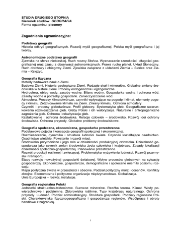 STUDIA DRUGIEGO STOPNIA Kierunek studiów: GEOGRAFIA Forma egzaminu: pisemny Zagadnienia egzaminacyjne: Podstawy geografii Historia odkryć geograficznych. Rozwój myśli geograficznej. Polska myśl geograficzna i jej twórcy. Astronomiczne podstawy geografii Zjawiska na sferze niebieskiej. Ruch roczny Słońca. Wyznaczanie szerokości i długości geograficznej oraz czasu z obserwacji astronomicznych. Prawa ruchu planet. Układ Słoneczny. Ruch obrotowy i obiegowy Ziemi. Zjawiska związane z układami Ziemia – Słońce oraz Ziemia – Księżyc. Geografia fizyczna Metody badawcze nauk o Ziemi. Budowa Ziemi. Historia geologiczna Ziemi. Rodzaje skał i minerałów. Globalne zmiany środowiska w historii Ziemi. Procesy endogeniczne i egzogeniczne. Hydrosfera, obieg wody, zasoby wodne. Bilans wodny. Gospodarka wodna i ochrona wód. Zasoby wodne a potrzeby gospodarki. Zanieczyszczenie wód. Atmosfera. Procesy klimatotwórcze, czynniki wpływające na pogodę i klimat, elementy pogody i klimatu. Zróżnicowanie klimatu na Ziemi. Zmiany klimatu. Ochrona atmosfery. Czynniki i procesy glebotwórcze. Profil glebowy. Systematyka gleb. Geograficzne uwarunkowania rozmieszczenia gleb. Gleby Polski i ich waloryzacja. Naturalne i antropogeniczne zagrożenia gleb. Ochrona i rekultywacja gleb. Kształtowanie i ochrona środowiska. Relacje człowiek – środowisko. Rozwój idei ochrony środowiska. Ochrona przyrody. Globalne problemy środowiskowe. Geografia społeczna, ekonomiczna, gospodarka przestrzenna Podstawowe pojęcia i koncepcje geografii społecznej i ekonomicznej. Rozmieszczenie, dynamika i struktura ludności świata. Czynniki kształtujące osadnictwo. Osadnictwo wiejskie. Powstanie i rozwój miast. Środowisko przyrodnicze i jego rola w działalności produkcyjnej człowieka. Działalność gospodarcza jako czynnik zmian środowiska życia człowieka i krajobrazu. Zasady lokalizacji działalności społeczno-gospodarczej. Planowanie przestrzenne. Rozwój produkcji roślinnej i zwierzęcej. Problematyka wyżywienia ludności. Rozwój przemysłu i transportu. Etapy rozwoju nowożytnej gospodarki światowej. Wpływ procesów globalnych na sytuację gospodarczą. Ekonomiczne, gospodarcze, demograficzne i społeczne mierniki poziomu rozwoju. Mapa polityczna świata w przeszłości i obecnie. Podział polityczny mórz i oceanów. Konflikty zbrojne. Ekonomiczne i polityczne organizacje międzynarodowe. Globalizacja. Unia Europejska – rozwój, instytucje. Geografia regionalna Polski Jednostki strukturalno-tektoniczne. Surowce mineralne. Rzeźba terenu. Klimat. Wody powierzchniowe i podziemne. Zbiorowiska roślinne. Typy krajobrazu naturalnego. Ochrona przyrody. Ludność. Podział administracyjny. Struktura gospodarki. Podziały regionalne Polski. Charakterystyka fizycznogeograficzna i gospodarcza regionów. Współpraca i obroty handlowe z zagranicą. 1 Geografia regionalna świata Budowa geologiczna, surowce mineralne, rzeźba, klimat, wody powierzchniowe, roślinność i świat zwierzęcy regionów świata. Ludność świata. Polityczna mapa świata. Gospodarka światowa. Kartografia i topografia Układy współrzędnych. Odwzorowania kartograficzne. Treści i rodzaje map. Metody prezentacji kartograficznej. Instrumenty geodezyjne. Redakcja i wykorzystanie map. Teledetekcja Współczesne techniki i systemy teledetekcyjne. Fotogrametryczne zdjęcia lotnicze. Interpretacja zdjęć oraz obrazów satelitarnych. Teledetekcja środowiska geograficznego. Orientacja w bieżących wydarzeniach w Polsce i na świecie (z dziedzin objętych tematyką egzaminu) 2