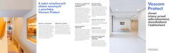 8 zalet winylowych oklein ściennych z powłoką Vescom Protect łatwość w utrzymaniu odporność na plamy Powłoka Vescom Protect jest łatwa w czyszczeniu zarówno przy pomocy zwykłych środków czyszczących, płynu Vescom Cleaner jak i silnych rozpuszczalników. Okleiny tej nie naruszy nawet najsilniejszy środek do czyszczenia nie zawierający dodatków ściernych. Ponadto czyszczenie tymi środkami nie prowadzi do jej szybkiego zużycia. Winylowe okleiny ścienne z powłoką Vescom Protect czyści się przy tym szybciej i dokładniej, niż innego rodzaju pokrycia ścian. W ten sposób koszty konserwacji można ograniczyć do minimum. Powłoka Vescom Protect to przezroczysta folia ochronna, naniesiona na winylową okleinę ścienną. Sprawia ona, że ściany są całkowicie odporne na tworzenie się na nich plam i powstawanie wszelkiego rodzaju zabrudzeń. Nawet substancje, które są znane z pozostawiania uporczywych plam, takie jak jod, azotan srebra, tusz czy farby, mogą zostać w prosty sposób całkowicie usunięte. trwałość oraz odporność na zarysowania i uderzenia bez naruszenia estetyki wystroju Folia ochronna Vescom Protect jest przezroczysta i zupełnie niewidoczna, dzięki czemu Dzięki doskonałej odporności na plamy winylowe okleiny ścienne z powłoką Vescom estetyczny wygląd winylowej okleiny ściennej Protect mogą być z łatwością eksploatowane nie zostaje w żaden sposób naruszony. Każdy gatunek z naszej kolekcji jest bez nawet przez 10 do 15 lat. Odporność na wątpienia niezwykle funkcjonalny pod zarysowania i uderzenia zarówno okleiny względem technicznym. Przy tym jednak z powłoką, jak i samej okleiny, została nie szpeci go „lodowaty” efekt, charakterydokładnie przetestowana. Jednak w styczny dla wielu produktów z tworzyw przypadku połączenia winylowej okleiny z powłoką Vescom Protect odporność ta okazała sztucznych. się być o 33% lepsza! To sprawia, że nasz produkt jest idealny do zastosowania w pomieszczeniach o dużym natężeniu ruchu. nieprzerwana ochrona Dodatkową zaletą jest też fakt, że okleina Powłoka Vescom Protect zapewnia z powłoką przykrywa drobne pęknięcia nieprzerwaną ochronę i nawet w przypadku i rysy na ścianach. zużycia aktywnego czynnika. Nadal dobrze zabezpiecza ściany. odpowiedzialna inwestycja Wybór winylowej okleiny ściennej z powłoką Vescom Protect jest też korzystny z finansowego punktu widzenia. Koszty początkowe są często nawet niższe, niż w przypadku zastosowania porównywalnego pokrycia ściennego. Sam fakt, że przez wiele lat ściany nie będą już wymagać prac konserwacyjnych, takich jak malowanie, sprawia że nasza okleina winylowa ze specjalną powłoką staje się inwestycją odpowiedzialną pod względem ekonomicznym. bezpieczeństwo Winylowa okleina ścienna Vescom Protect powstaje przy zastosowaniu bezpiecznej, naturalnej i wolnej od toksyn technologii. Jest przy tym całkowicie hipoalergiczna. alternatywa dla farby i pokryć z włókna szklanego Między innymi dzięki dużej trwałości, higienicznym właściwościom i łatwości w czyszczeniu winylowa okleina ścienna z powłoką Vescom Protect stanowi doskonałą alternatywę dla malowania ścian farbą, czy stosowania tapet z włókna szklanego. Vescom Protect chroni ściany przed zabrudzeniami, chemikaliami i bakteriami Vescom Protect ponieważ w służbie zdrowia najważniejsza jest higiena higieniczna, odporna na plamy i łatwa w czyszczeniu skład warstwa wierzchnia winylu zadrukowana przy użyciu farb na bazie wody, na nośniku bawełnianym + powłoka Vescom Protect szerokość ±130 cm / ± 51/52 inches chłonność akustyczna alphaw 0.15 selon DIN 52215 klasyfikacja odporności ogniowej czyszczenie przy pomocy zwykłych środków czyszczących winylowa okleina ścienna 5 4 3 2 1 maść jodyna olej długopis herbata pasta do butów (miękki) ołówek/kredki musztarda zwykłe zabrudzenia mocz krew 0 nierozprzestrzeniające ognia Spełniają najsurowsze międzynarodowe wymogi w zakresie rozprzestrzeniania ognia. bez widocznych łączeń Okleiny można nanieść na ścianę tak, aby pomiędzy ich pasami nie było widać łączeń. Dostępne są dokładne instrukcje dotyczące stosowania produktu. wydajna aplikacja Nakładanie oklein ściennych Vescom przebiega bardzo szybko, a po aplikacji nie trzeba długo czekać na ich wyschnięcie. Ponadto produkt nie uwalnia do pomieszczenia dużych ilości wilgoci, przez co pomieszczenia, w których został zastosowany, można od razu oddać do użytku. bezproblemowa dezynfekcja Vescom wallcovering 100% recyclable winylowa okleina ścienna + powłoka Vescom Protect Ściany pokryte okleiną winylową Vescom Protect można bardzo łatwo dezynfekować przy pomocy środków na bazie aktywnego chloru. przyjazne dla środowiska Okleiny ścienne Vescom powstają w wyniku przyjaznego dla środowiska procesu produkcji. Ponadto firma Vescom działa zgodnie z kontrolowanym i certyfikowanym systemem zarządzania środowiskiem ISO 14001. 1 = trudno usuwalne 5 = łatwo usuwalne doskonałe usługi i obsługa posprzedażowa Oferowane przez firmę Vescom usługi i obsługa posprzedażowa są na najlepszym poziomie, jakiego można oczekiwać od producenta najwyższej jakości oklein ściennych. czyszczenie przy pomocy Vescom Cleaner 5 4 Headquarters Vescom B.V. t +31 (0)493 315 833 e [email protected] 3 2 1 Źródło: Raport laboratorium Textile Lab, 2013, „Badanie podatności na czyszczenie 2 rodzajów pokryć ściennych” Polska Vescom Polska t +48 22 646 4246 e [email protected] maść jodyna olej długopis herbata pasta do butów (miękki) ołówek/kredki musztarda zwykłe zabrudzenia mocz 0 krew Dla sektora służby zdrowia niezwykle ważną kwestią jest utrzymanie pomieszczeń w higienicznej czystości, gdyż panujące w nich warunki mają bezpośredni wpływ na zdrowie pacjentów. Usunięcie z nich brudu i wyeliminowanie szkodliwych bakterii zapobiega ryzyku zakażenia p