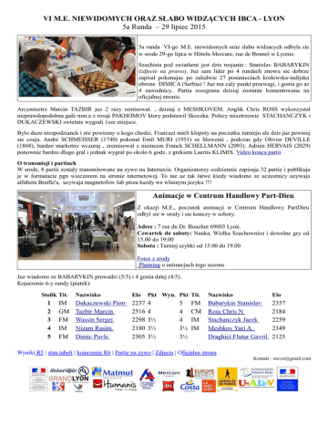 VI M.E. NIEWIDOMYCH ORAZ SŁABO WIDZĄCYCH IBCA - LYON 5a Runda – 29 lipiec 2015 5a runda VI-go M.E. niewidomych oraz slabo widzacych odbyla sie w srode 29-go lipca w Hôtelu Mercure, rue de Bonnel w Lyonie. Szachista pod swiatlami jest dzis rosjanin : Stanislav BABARYKIN (zdjecie na prawo). Juz sam lider po 4 rundach znowu sie dobrze zapisal pokonujac po zaledwie 27 posunieciach krolewska-indijska obrone DIMICA (Serbia) ! Juz ma caly punkt przewagi, i gonia go az 4 zawodnicy.. Partia rozegrana dzisiaj zostanie komentowana na oficjalnej stronie. Arcymisztrz Marcin TAZBIR juz 2 razy remisowal. , dzisiaj z MESHKOVEM. Anglik Chris ROSS wykorzystal nieprawdopodobna gafe mm.a z rossji PAKHOMOV ktory podstawil Skoczka. Polscy misztrzowie STACHANCZYK i DUKACZEWSKI swietnie wygrali 1sze miejsce. Bylo duzo niespodzianek i nie powiemy o kogo chodzi. Francuzi mieli klopoty na poczatku turnieju ale dzis juz pewniej sie czuja. André SCHMEISSER (1740) pokonal Emil MURI (1951) ze Slowenii , podczas gdy Olivier DEVILLE (1868), bardzo markotny wczoraj , zremisowal z niemcem Franck SCHELLMANN (2093). Adrien HERVAIS (2029) ponownie bardzo dlugo gral i jednak wygral po okolo 6 godz. z grekiem Laertis KLIMIS. Video konca partii O transmisji i partiach W srode, 8 partii zostaly transmitowane na zywo na Internecie. Organizatorzy codziennie zapisuja 32 partie i publikuja je w formatacie pgn wieczorem na stronie internetowej. To nie az tak latwe kiedy wiadomo ze uczestnicy uzywaja alfabetu Braille'a, uzywaja magnetofow lub pisza kazdy we wlasnym jezyku !!! Animacje w Centrum Handlowy Part-Dieu Z okazji M.E., poczatek animacji w Centrum Handlowy PartDieu odbyl sie w srody i sie konczy w soboty. Adres : 7 rue du Dr. Bouchut 69003 Lyon. Czwartek do soboty: Nauka, Wielka Szachownica i dowolne gry od 15.00 do 19.00 Sobota : Turniej szybki od 15.00 do 19.00 Fotos z srody Planning o animacjach tego sezonu Juz wiadomo ze BABARYKIN prowadzi (5/5) i 4 gonia dalej (4/5). Kojarzenie 6-y rundy (piatek): Stolik Tit. 1 2 3 4 5 IM GM FM IM FM Nazwisko Elo Pkt Wyn. Pkt Tit. Nazwisko Elo Dukaczewski Piotr Tazbir Marcin Wassin Sergej Nizam Rasim Dimic Pavle 2237 2516 2298 2180 2305 4 4 3½ 3½ 3½ Babarykin Stanislav Ross Chris N Stachanczyk Jacek Meshkov Yuri A. Draghici Flutur Gavril 2357 2184 2259 2349 2125 5 4 4 3½ 3½ FM CM IM IM Wyniki R5 | stan tabeli | kojarzenie R6 | Partie na zywo | Zdjecia | Oficjalna strona Kontakt : [email protected]
