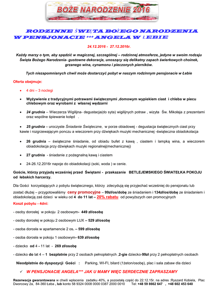 RODZINNE ŚWIĘTA BOŻEGO NARODZENIA W PENSJONACIE *** ANGELA W ŁEBIE 24.12.2016 - 27.12.2016r. Każdy marzy o tym, aby spędzić w magicznej, szczególnej – rodzinnej atmosferze, jedyne w swoim rodzaju Święta Bożego Narodzenia- gustowne dekoracje, unoszący się delikatny zapach świerkowych choinek, grzanego wina, cynamonu i pieczonych pierników. Tych niezapomnianych chwil może dostarczyć pobyt w naszym rodzinnym pensjonacie w Łebie Oferta obejmuje: 4 dni – 3 noclegi Wyżywienie z tradycyjnymi potrawami świątecznymi ,domowym wypiekiem ciast i chleba w piecu chlebowym oraz wyrobami z własnej wędzarni 24 grudnia – Wieczerza Wigilijna- degustacja(do syta) wigilijnych potraw , wizyta Św. Mikołaja z prezentami oraz wspólne śpiewanie kolęd . 25 grudnia – uroczyste Śniadanie Świąteczne, w porze obiadowej - degustacja świątecznych ciast przy kawie i rozgrzewającym ponczu a wieczorem przy dźwiękach muzyki mechanicznej -świąteczna obiadokolacja 26 grudnia – świąteczne śniadanie, od obiadu bufet z kawą , ciastem i lampką wina, a wieczorem obiadokolacja przy dźwiękach muzyki regionalnej(mechanicznej) 27 grudnia - śniadanie z pożegnalną kawą i ciastem 24-26.12.2016r napoje do obiadokolacji (soki, woda ) w cenie. Goście, którzy przyjadą wcześniej przed Świętami - przekazanie BETLEJEMSKIEGO ŚWIATEŁKA POKOJU od łebskich harcerzy. Dla Gości korzystających z pobytu świątecznego, którzy zdecydują się przyjechać wcześniej do pensjonatu lub zostać dłużej – przygotowaliśmy ceny promocyjne – 99zł/os/dobę ze śniadaniem i 134zł/os/dobę ze śniadaniem i obiadokolacją zaś dzieci w wieku od 4 do 11 lat – 20% rabatu od powyższych cen promocyjnych Koszt pobytu - 4dni: - osoby dorosłej w pokoju 2 osobowym- 449 zł/osobę - osoby dorosłej w pokoju 2 osobowym LUX – 529 zł/osobę - osoba dorosła w apartamencie 2 os. – 599 zł/osobę - osoba dorosła w pokoju 1 osobowym- 639 zł/osobę - dziecko od 4 - 11 lat - 269 zł/osobę - dziecko do lat 4 – 1 bezpłatnie przy 2 osobach pełnopłatnych ,2-gie dziecko-99zł przy 2 pełnopłatnych osobach Nieodpłatnie do dyspozycji Gości : Parking, WI-FI, bilard (1żeton/osobę), plac i sala zabaw dla dzieci W PENSJONACIE ANGELA*** JAK U MAMY WIĘC SERDECZNIE ZAPRASZAMY Rezerwacja gwarantowana w chwili wpłacenia zadatku 40%, a pozostałą część do 22.12.15r. na adres :Ryszard Kobiela, Plac Dworcowy 2a, 84-360 Łeba , lub konto 58 9324 0008 0000 0387 2000 0010 Tel: +48 59 8662 647 , +48 602 453 640