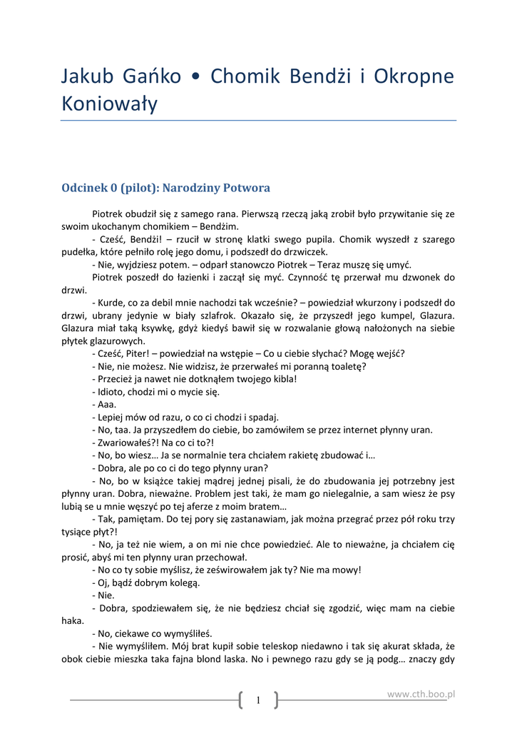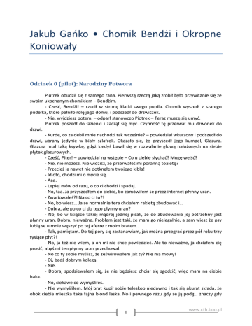 Jakub Gaoko • Chomik Bendżi i Okropne Koniowały Odcinek 0 (pilot): Narodziny Potwora Piotrek obudził się z samego rana. Pierwszą rzeczą jaką zrobił było przywitanie się ze swoim ukochanym chomikiem – Bendżim. - Cześd, Bendżi! – rzucił w stronę klatki swego pupila. Chomik wyszedł z szarego pudełka, które pełniło rolę jego domu, i podszedł do drzwiczek. - Nie, wyjdziesz potem. – odparł stanowczo Piotrek – Teraz muszę się umyd. Piotrek poszedł do łazienki i zaczął się myd. Czynnośd tę przerwał mu dzwonek do drzwi. - Kurde, co za debil mnie nachodzi tak wcześnie? – powiedział wkurzony i podszedł do drzwi, ubrany jedynie w biały szlafrok. Okazało się, że przyszedł jego kumpel, Glazura. Glazura miał taką ksywkę, gdyż kiedyś bawił się w rozwalanie głową nałożonych na siebie płytek glazurowych. - Cześd, Piter! – powiedział na wstępie – Co u ciebie słychad? Mogę wejśd? - Nie, nie możesz. Nie widzisz, że przerwałeś mi poranną toaletę? - Przecież ja nawet nie dotknąłem twojego kibla! - Idioto, chodzi mi o mycie się. - Aaa. - Lepiej mów od razu, o co ci chodzi i spadaj. - No, taa. Ja przyszedłem do ciebie, bo zamówiłem se przez internet płynny uran. - Zwariowałeś?! Na co ci to?! - No, bo wiesz… Ja se normalnie tera chciałem rakietę zbudowad i… - Dobra, ale po co ci do tego płynny uran? - No, bo w książce takiej mądrej jednej pisali, że do zbudowania jej potrzebny jest płynny uran. Dobra, nieważne. Problem jest taki, że mam go nielegalnie, a sam wiesz że psy lubią se u mnie węszyd po tej aferze z moim bratem… - Tak, pamiętam. Do tej pory się zastanawiam, jak można przegrad przez pół roku trzy tysiące płyt?! - No, ja też nie wiem, a on mi nie chce powiedzied. Ale to nieważne, ja chciałem cię prosid, abyś mi ten płynny uran przechował. - No co ty sobie myślisz, że ześwirowałem jak ty? Nie ma mowy! - Oj, bądź dobrym kolegą. - Nie. - Dobra, spodziewałem się, że nie będziesz chciał się zgodzid, więc mam na ciebie haka. - No, ciekawe co wymyśliłeś. - Nie wymyśliłem. Mój brat kupił sobie teleskop niedawno i tak się akurat składa, że obok ciebie mieszka taka fajna blond laska. No i pewnego razu gdy se ją podg… znaczy gdy 1 www.cth.boo.pl patrzył se w gwiazdy, to przez przypadek, absolutny przypadek, zajrzał do twojego mieszkania. - No i? - No i po tym co zobaczył, zamknął się na dwie godziny w kiblu i rzygał. - No ale co takiego konkretnego zobaczył? - Nie, nie przejdzie mi to przez gardło. W każdym bądź razie zobaczył co robiłeś ze swoim chomikiem. - No a co ja niby takiego z nim robiłem? - Nie powiem. Ale ta taśma klejąca… – Glazura wskazał palcem leżącą na szafce przy drzwiach taśmę – Ona też była w użytku. Piotrek przez chwilę się zastanawiał. - Nikt ci nie uwierzy. - Mylisz się. Mój brat następnej nocy zrobił se zdjęcia. Wiesz, on zawsze lubi mied coś na wszystkich. - Hmm… Dobra, przechowam ten płynny uran, ale zaraz potem chcę dostad te zdjęcia. - Zgoda. - Na ile mam ten syf przetrzymad? - No, teraz jestem w takim momencie konstruowania, że myślę… No, jakiś miesiąc. - Miesiąc?! – wrzasnął ze zdziwienia Piotrek, lecz wyraz twarzy Glazury od razu przypomniał mu o zdjęciach dokumentujących jego haniebne czyny – No, dobra… Ale na miesiąc i ani sekundy dłużej. - Zgoda. I tak podałem se tak trochę więcej, bardzo możliwe, że odbiorę go wcześniej. – Glazura sięgnął do kieszeni swej kraciastej koszuli i wyciągnął mały słoik z zieloną substancją. - Trzymasz to cholerstwo w kieszeni?! - A co to? Przecież przez słoik ze zbrojonej stali mi się nie przeżre. - No chyba że tak. – Piotrek wziął gruby słoik do ręki i spojrzał na płyn pod światło. – Ale jesteś w stu procentach pewien, że to mi nic nie zrobi? - Spoko. Schowaj do szafy i w ogóle o tym nie myśl. - No, dobra, skoro tak mówisz… - Nie przejmuj się tym tak. Słuchaj, ja muszę już spadad… Brat z neta nowy Straszny Film ściąga i pewnie lada chwila będzie. No to dzięki wielkie! Nara! - Nara! – rzekł Piotrek zamykając powoli drzwi i jednocześnie przyglądając się cały czas zielonej substancji. – Najchętniej dałbym ci to do wypicia. Rany, co za świr! Bendżi! – podszedł do stolika, na którym stała klatka chomika – Tutaj ci postawię płynny uran. W żadnym wypadku go nie ruszaj, rozumiesz? No, mądry chomik. – Piotrek pogłaskał go po głowie. – Ja teraz pójdę do pracy, wiesz? Ale nie martw się, gdzieś o jakiejś szóstej wrócę. Piotrek wrócił do łazienki dokooczyd mycie. Ubrał się i dosypał chomikowi nasion, po czym wyszedł do pracy. Piotrek pracował w supermarkecie „Karaluch”. Pracował tam przy rozpakowywaniu towarów i ustawianiu go na półkach. Robota bywała czasem bardzo ciężka, zważywszy na niewyrozumiałe szefostwo i fatalne warunki pracy. Nie ma w zasadzie po co opisywad dnia pracy Piotrka, gdyż praca w „Karaluchu” była bardzo nudna. Tak jak zapowiedział, Piotrek wrócił do domu siedem minut po szóstej. Przywitał się z Bendżim i położył się na kanapie przed telewizorem. Akurat leciały „Rozmowy w tłoku”: 2 www.cth.boo.pl „Dzieo dobry paostwu. Nazywam się Ewa Drzazga i specjalnie dla paostwa poprowadzę dziś wywiad z motorniczym tego zatłoczonego tramwaju, w którym mnie paostwo widzą…” Nagle zadzwonił telefon. Piotrek odebrał: - Halo? - Xi. – dobiegł go głos w słuchawce. - Chi. - Xi. - Chi. - Xi. - Chi. Chi. Chi. - Cześd, Pioterk! - Siemasz Balor! No, co słychad? Nawijaj. - Imprezka jest. Dziś w „Oborze”. - W „Oborze”? O której? - O 19.00 Będziesz? - Spoko. Już wychodzę. - To nara. - Nara. Balor był jednym z największych kumpli Piotrka, zawsze go informował o wszystkich imprezach. „Obora” za to była najpopularniejszym klubem w Pcimiu Dolnym czyli miejscu zamieszkania Piotrka. Piotre