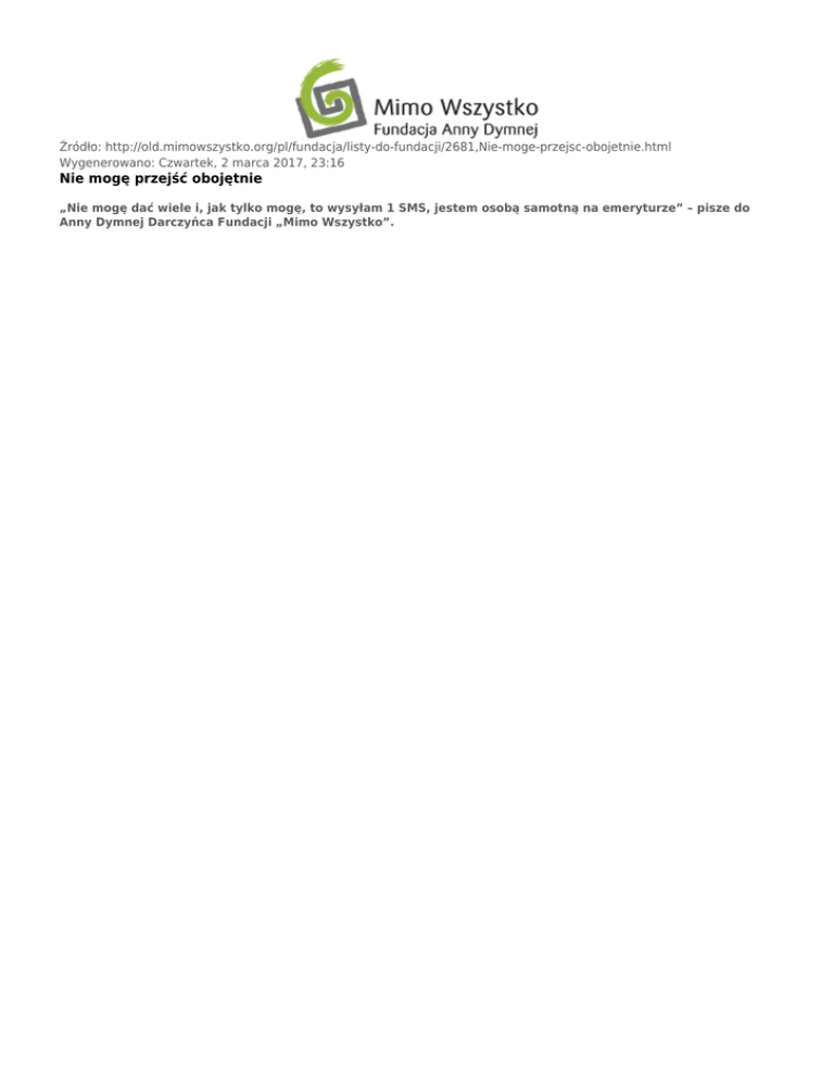 Źródło: http://old.mimowszystko.org/pl/fundacja/listy-do-fundacji/2681,Nie-moge-przejsc-obojetnie.html Wygenerowano: Czwartek, 2 marca 2017, 23:16 Nie mogę przejść obojętnie „Nie mogę dać wiele i, jak tylko mogę, to wysyłam 1 SMS, jestem osobą samotną na emeryturze” – pisze do Anny Dymnej Darczyńca Fundacji „Mimo Wszystko”. Tweet Podziel się: