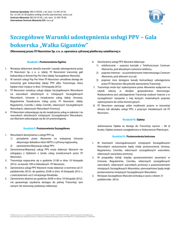 Centrum Sprzedaży: 801 0 55555, z tel. kom. 12 291 55 55, fax. 12 291 55 50 (opłata według cennika operatorów), www.n.pl Centrum Abonenta: 801 05 55 05, z tel. kom. 12 294 78 00, Internetowe Centrum Abonenta ICA: ica.n.pl Szczegółowe Warunki udostępnienia usługi PPV – Gala bokserska „Walka Gigantów” Oferowanej przez ITI Neovision Sp. z o. o. operatora cyfrowej platformy satelitarnej n Rozdział I. Postanowienia Ogólne 1. 2. 3. 4. Niniejszy dokument określa warunki i zasady udostępnienia przez ITI Neovision Sp. z o. o. (dalej: ITI Neovision) transmisji gali bokserskiej w formie Pay Per View (dalej: Szczegółowe Warunki). W ramach usługi Pay Per View ITI Neovision umożliwia dostęp do transmisji gali bokserskiej (dalej: PPV albo Transmisja), która będzie mieć miejsce w dniu 10 listopada 2012r. ITI Neovision świadczy usługi objęte Szczegółowymi Warunkami na warunkach określonych w niniejszych Szczegółowych Warunkach, Umowie o świadczenie usług (dalej: Umowa), Regulaminie Świadczenia Usług przez ITI Neovision (dalej: Regulamin), Cenniku ( dalej: Cennik), właściwych Szczegółowych Warunkach, właściwych Warunkach Promocji. ITI Neovision zobowiązuje się do świadczenia usług w zakresie i na warunkach określonych niniejszymi Szczegółowymi Warunkami, zaś Abonent zobowiązuje się do ich przestrzegania. 6. Zamówienia usługi PPV Abonent dokonuje: 1) telefonicznie – poprzez kontakt z Telefonicznym Centrum Abonenta, pod aktualnym numerem telefonu, 2) poprzez Internet – za pośrednictwem Internetowego Centrum Abonenta, pod adresem ica.n.pl, 3) poprzez inne dostępne kanały komunikacji udostępnione przez ITI Neovision dla potrzeb zamawiania Transmisji. 7. Transmisja może być wykorzystana przez Abonenta wyłącznie na użytek własny w obrębie gospodarstwa domowego. Niedozwolone jest udostępnienie Transmisji osobom trzecim a w szczególności czerpanie z niej korzyści materialnych poprzez wykorzystanie do celów komercyjnych. 8. ITI Neovision zastrzega sobie możliwość przerw w transmisji obrazu lub dźwięku usługi PPV, z przyczyn niezależnych od ITI Neovision. Rozdział III. Opłaty Jednorazowa Opłata za dostęp do Transmisji wynosi – 40 zł brutto. Opłata zostanie uwzględniona w Dokumencie Płatniczym. Rozdział II. Postanowienia Szczegółowe 1. 2. 3. 4. 5. Warunkami skorzystania z usługi PPV są: 1) posiadanie przez Abonenta na wskazanej Umowie aktywnego dekodera nbox HDTV z cyfrową nagrywarką, 2) zamówienie/Aktywacja usługi PPV. Zamówienia/Aktywacji usługi PPV może dokonać Abonent nie zalegający z Opłatami z tytułu usług świadczonych przez ITI Neovision. Transmisja rozpocznie się o godzinie 21:00 w dniu 10 listopada 2012r. na kanele 109 w Dekoderach ITI Neovision. Zamówienia usługi PPV Abonent może dokonać w terminie od 31 października 2012r. do godziny 23:00 w dniu 10 listopada 2012 r., z zastrzeżeniem ust.5 niniejszego Rozdziału. Zamówienie złożone po godzinie 20:00 w dniu 10 listopada 2012r. nie gwarantuje uzyskania dostępu do pełnej Transmisji, tym samym nie stanowiąc podstawy reklamacji. Rozdział IV. Postanowienia końcowe 1. 2. 3. ITI Neovision Sp. z o.o., ul. Kłobucka 23, 02-699 Warszawa, NIP: 521-00-82-774, REGON: 010175861, wpisana do Rejestru Przedsiębiorców, prowadzonego przez Sąd Rejonowy dla m.st. Warszawy, XIII Wydział Gospodarczy pod nr KRS: 0000191377, kapitał zakładowy: 41.000.000 zł W kwestiach nieuregulowanych niniejszymi Szczegółowymi Warunkami zastosowanie będą miały postanowienia Umowy, Regulaminu, Cennika, właściwych szczegółowych warunków, właściwych warunków promocji. W przypadku kolizji między postanowieniami zawartymi w Umowie, Regulaminie, Cenniku, właściwych szczegółowych warunkach, właściwych warunkach promocji a postanowieniami niniejszych Szczegółowych Warunków, pierwszeństwo będą miały postanowienia niniejszych Szczegółowych Warunków. Niniejsze Szczegółowe Warunki wchodzą w życie z dniem 31 października 2012r.